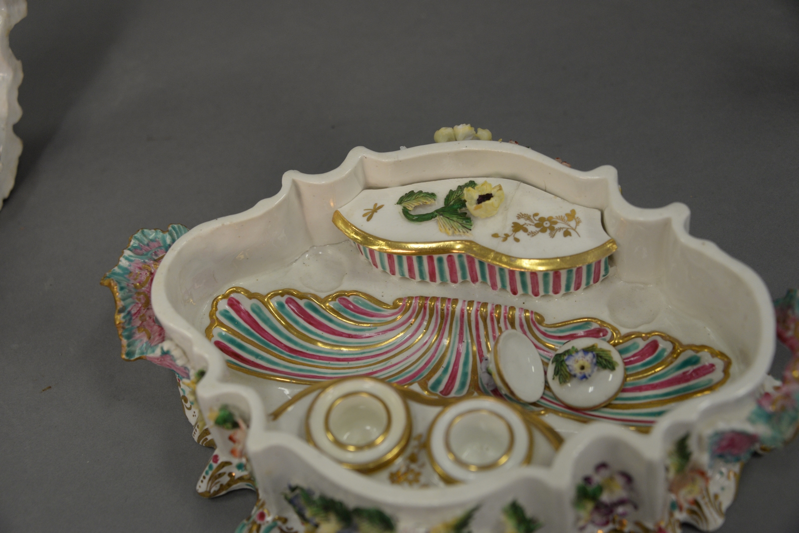 Porcelain covered inkwell imperfections, inside cover repaired, lg. 10 1/2.