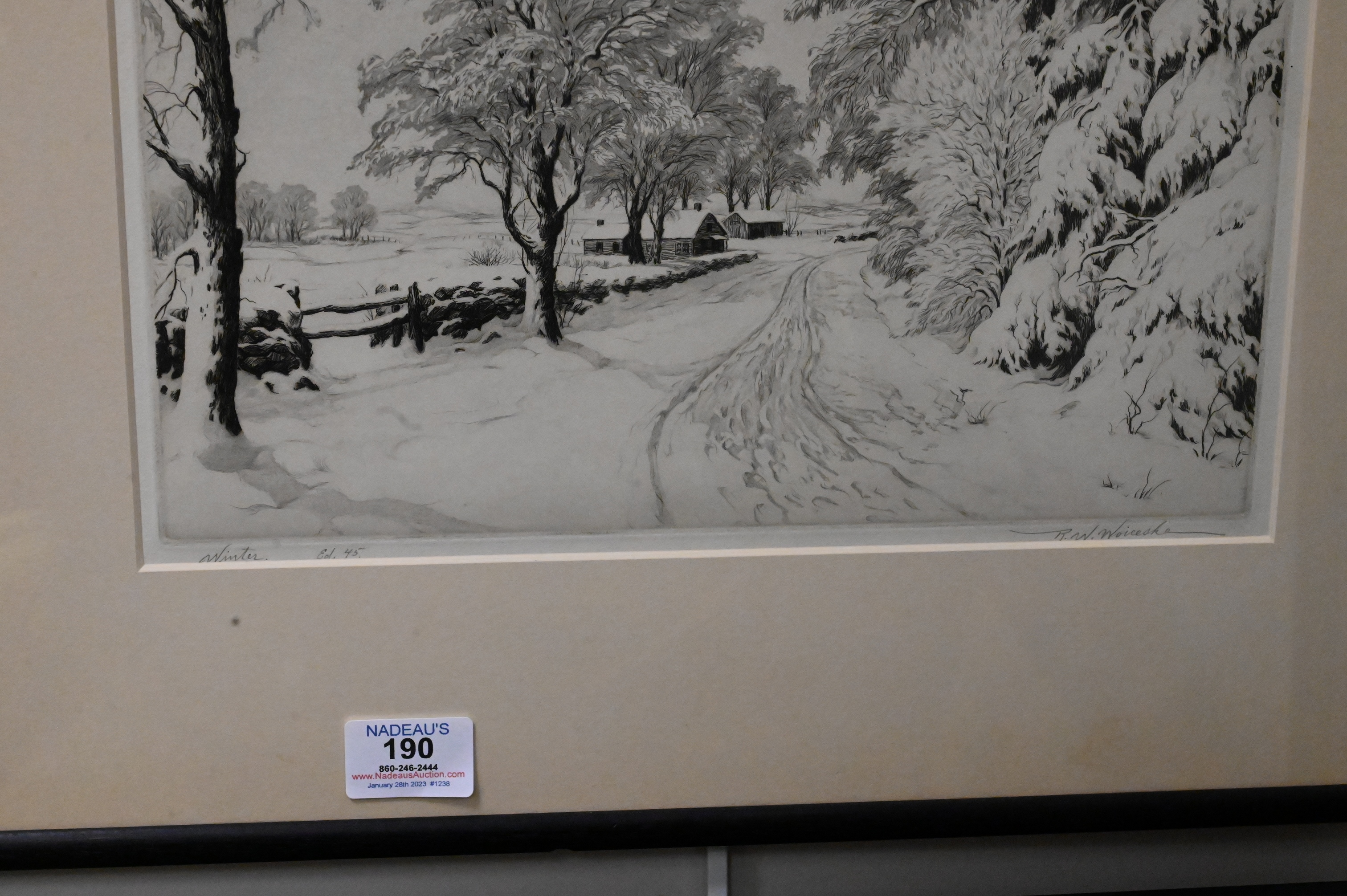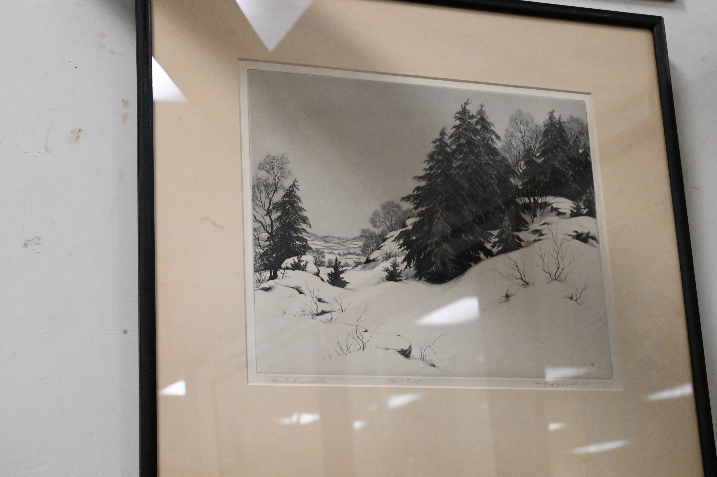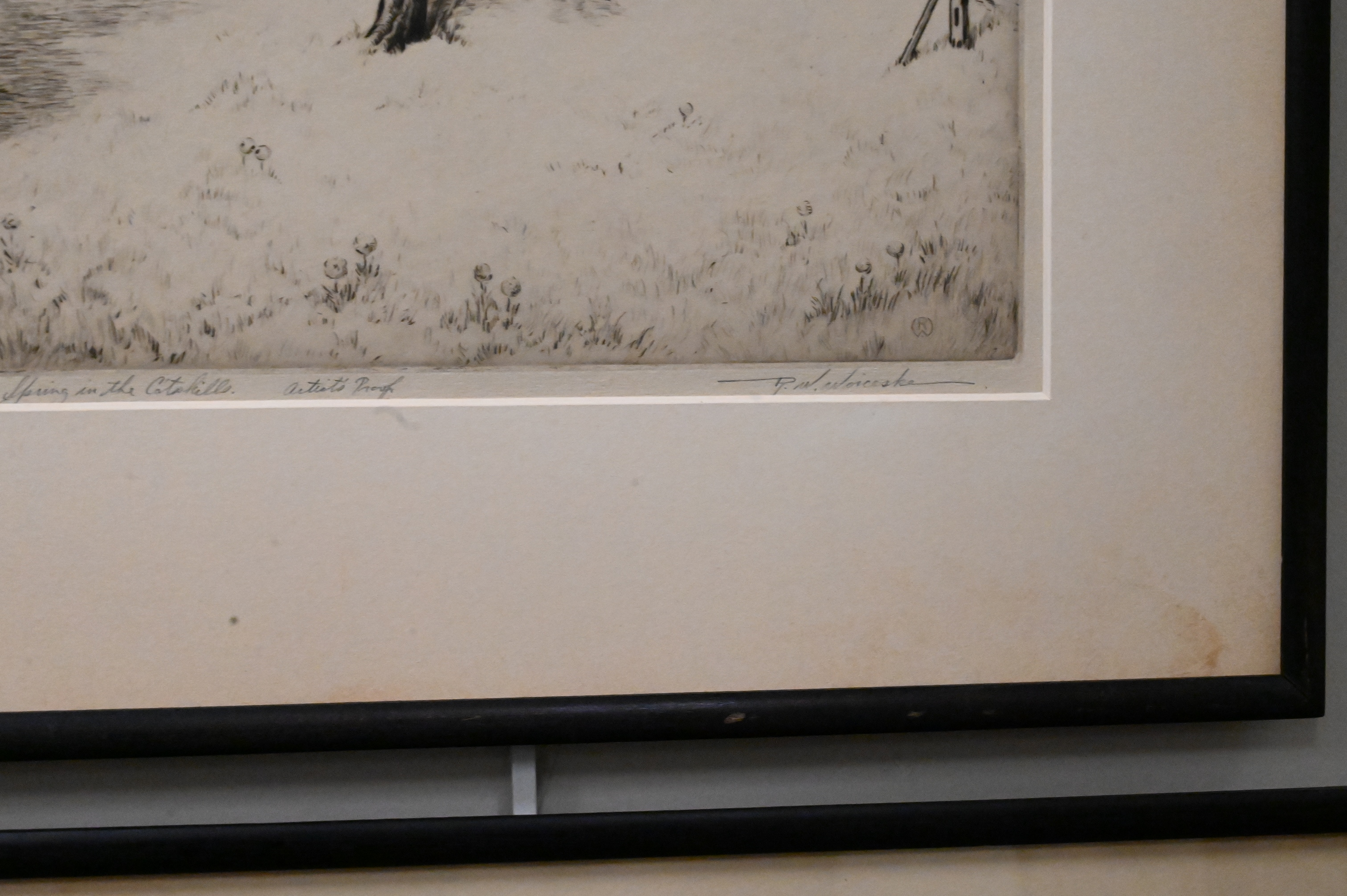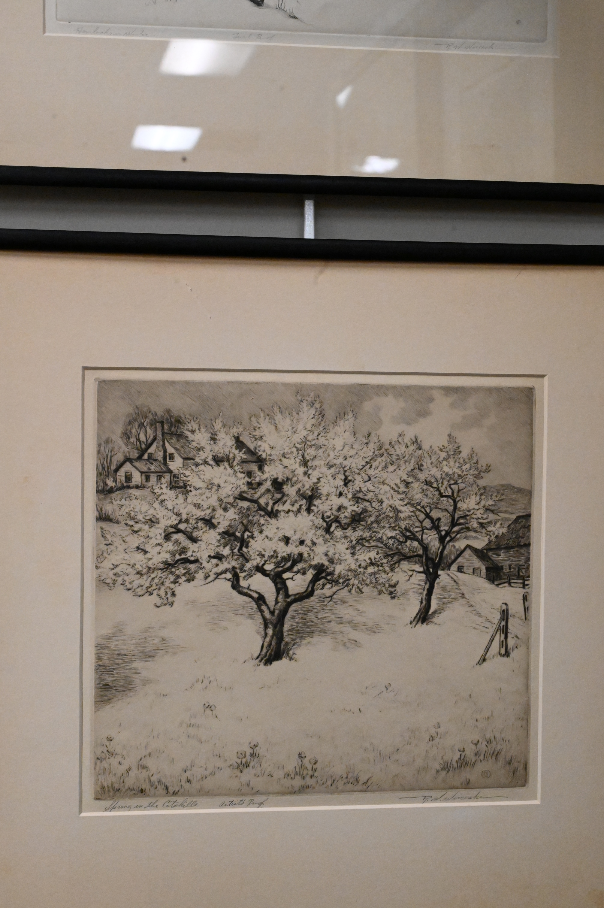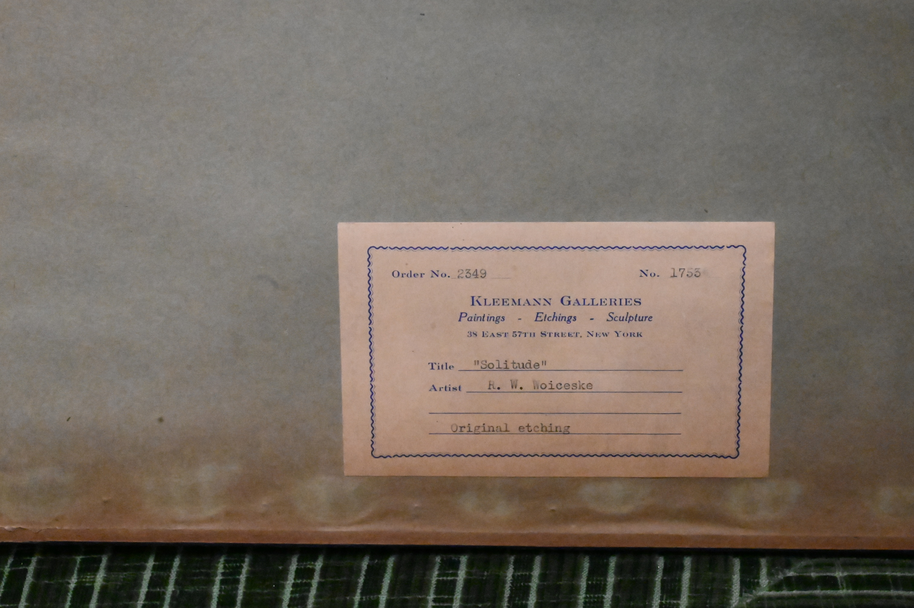 Ronau Woiceske (1887 – 1953), four etchings, to include “Winter” edition 45; “Spring in the Catskills” artist proof; “Hemlocks in the Winter” trial proof #2; along with “Solitude”, all signed and titled in pencil, each having Kleemann Galleries label on back, largest 9 3/4″ x 12 1/2″.