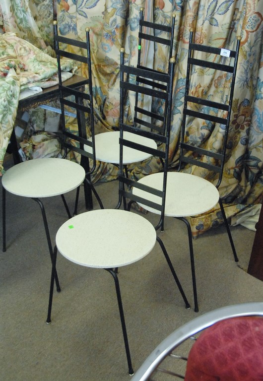 Lot 190: Salterini style set of four Mid-Century wrought iron ladderback iron chairs with brass ball finials, set of four, circa 1960.