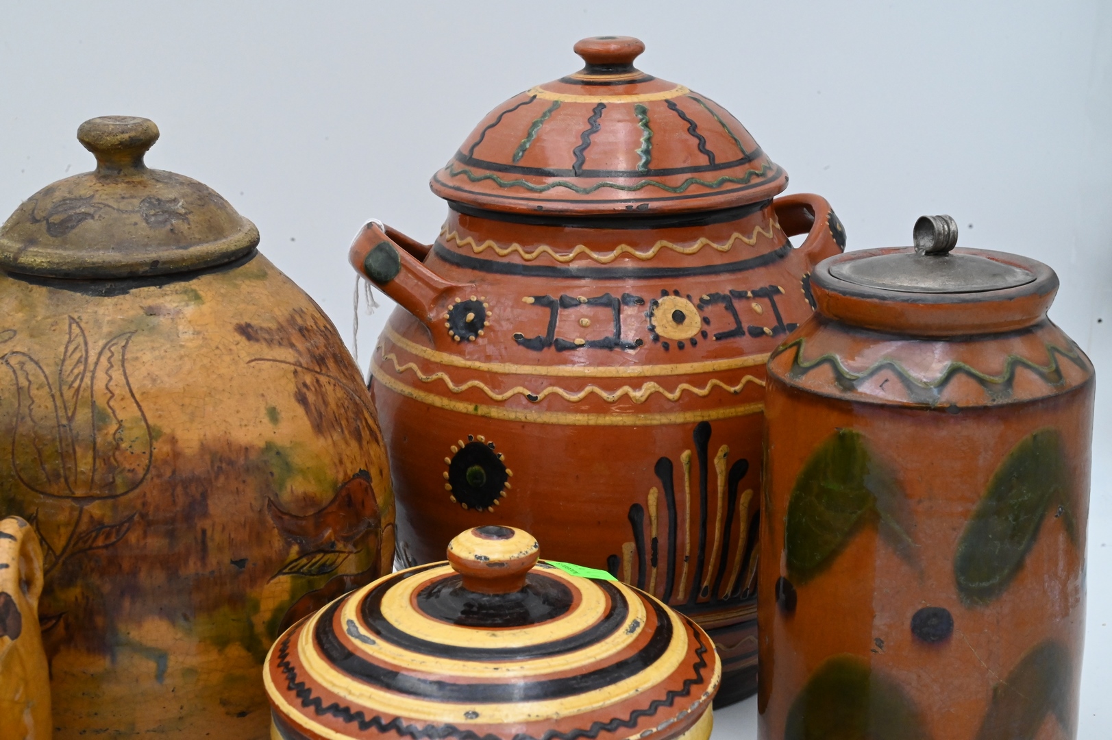 Seven Greg Shooner Redware Pottery Covered Jars, painted in Early American manner, all signed on the bottoms, tallest 10 inches. Provenance: Estate of Peter Tillou, Litchfield, Connecticut.