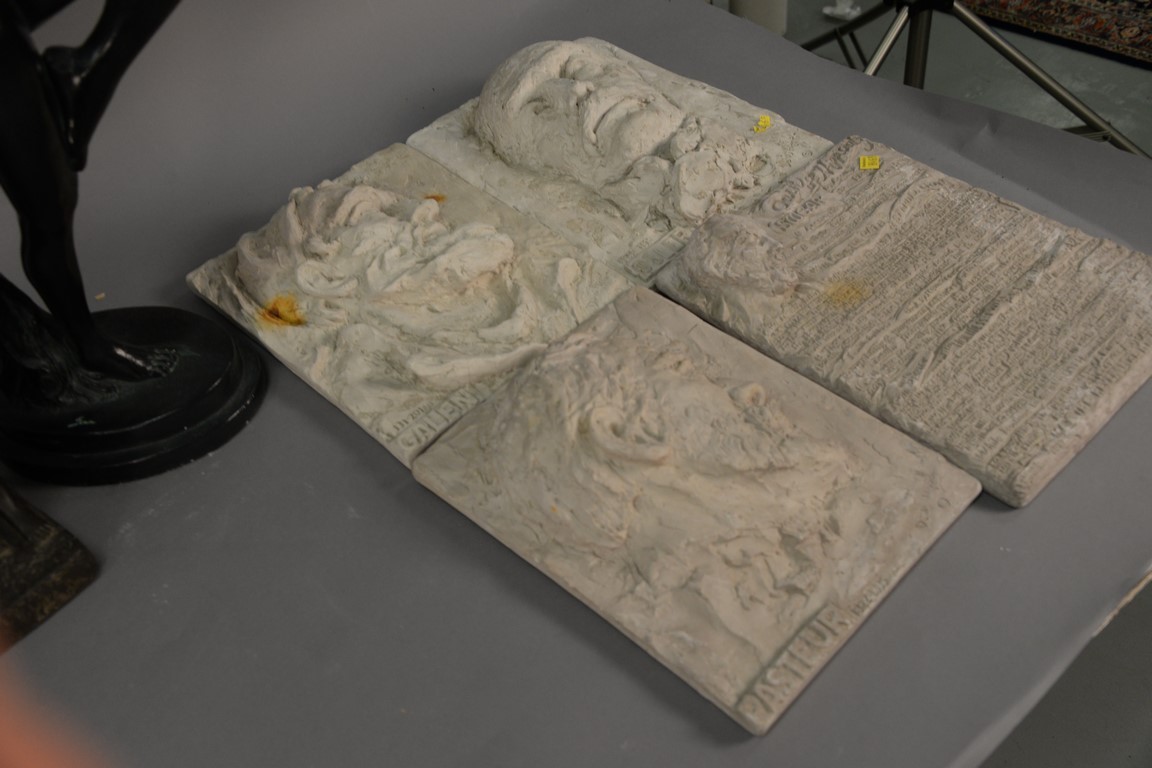Lot 190: Seven plaster pieces to include Doris Appel plaques: Osler, Pasteur, Galen, and Oate of Hypocrisy 13 x 10, Salvini Carber figure…
