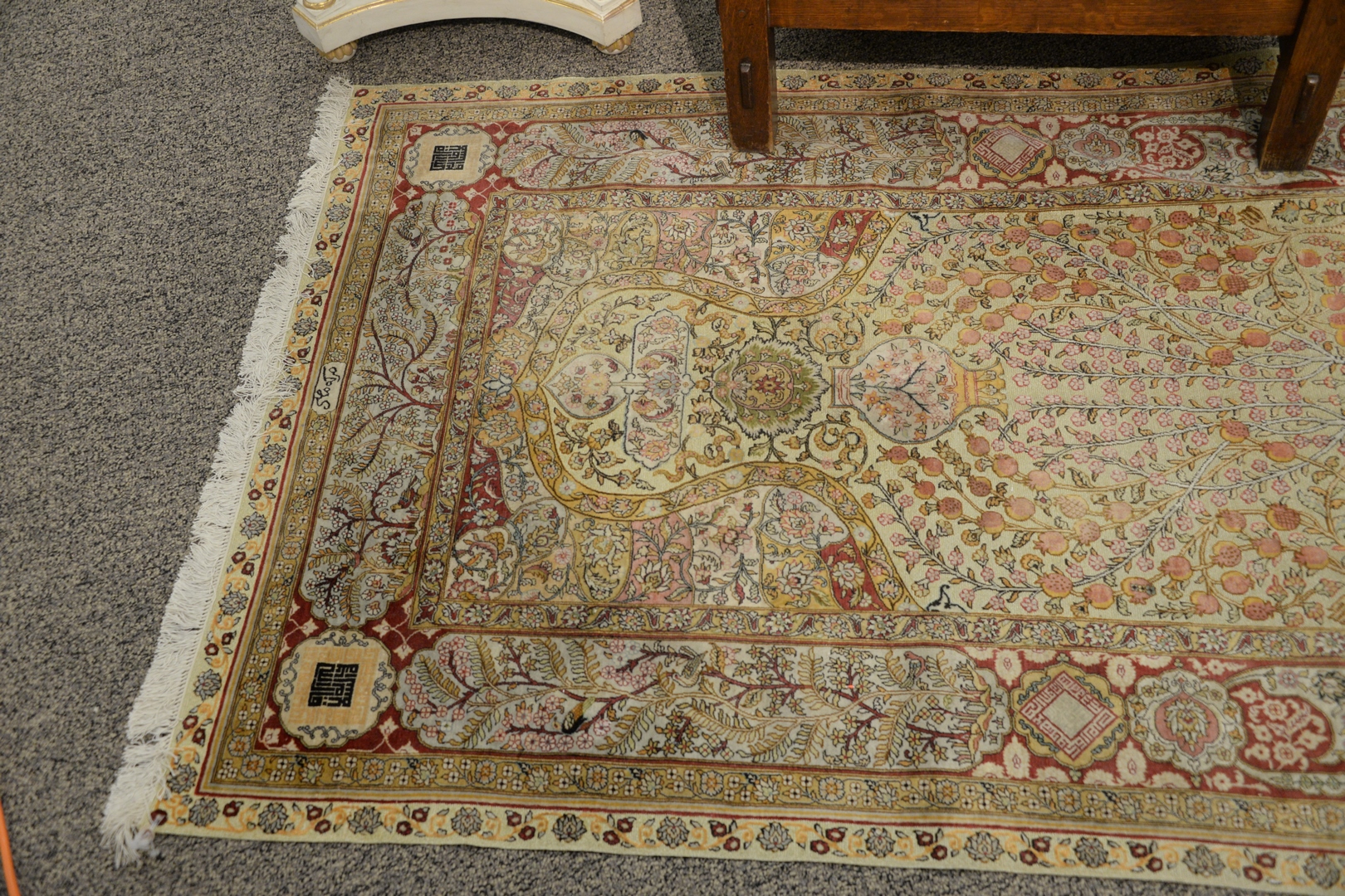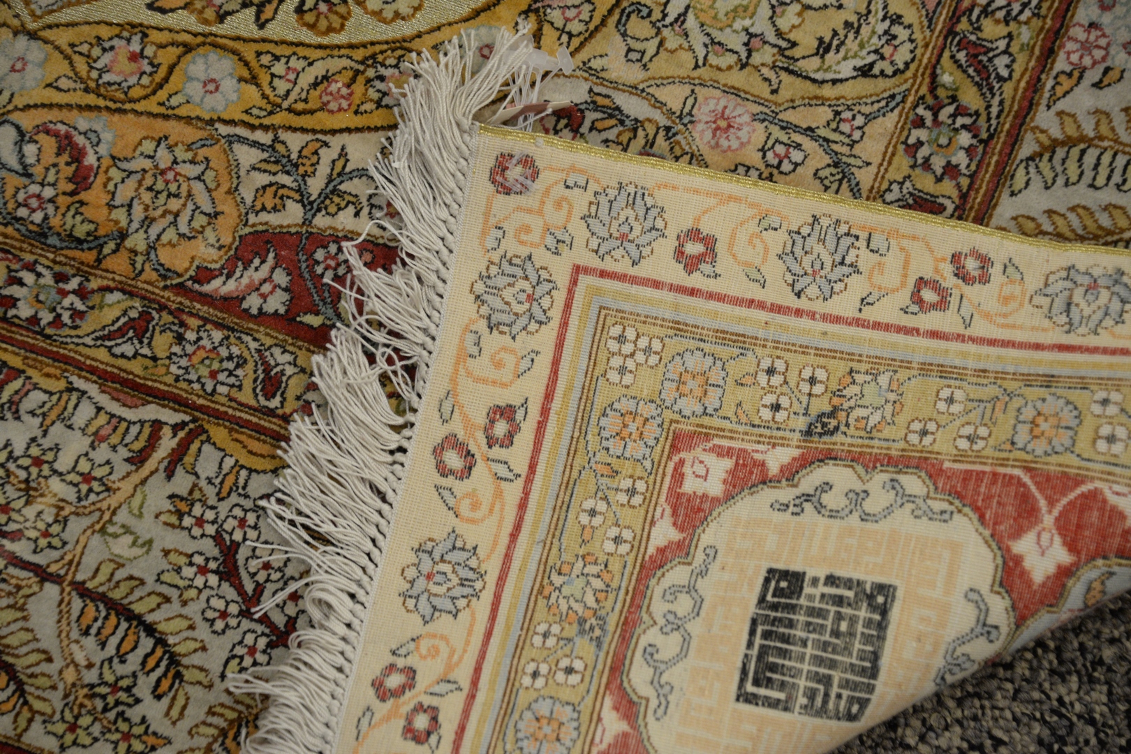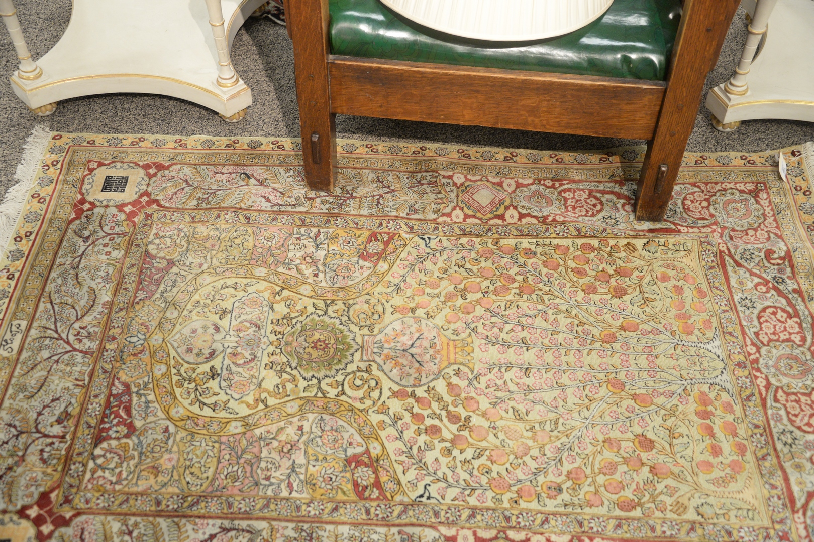 Silk Oriental Prayer Rug with metal threading, 3′ 7 x 5′.