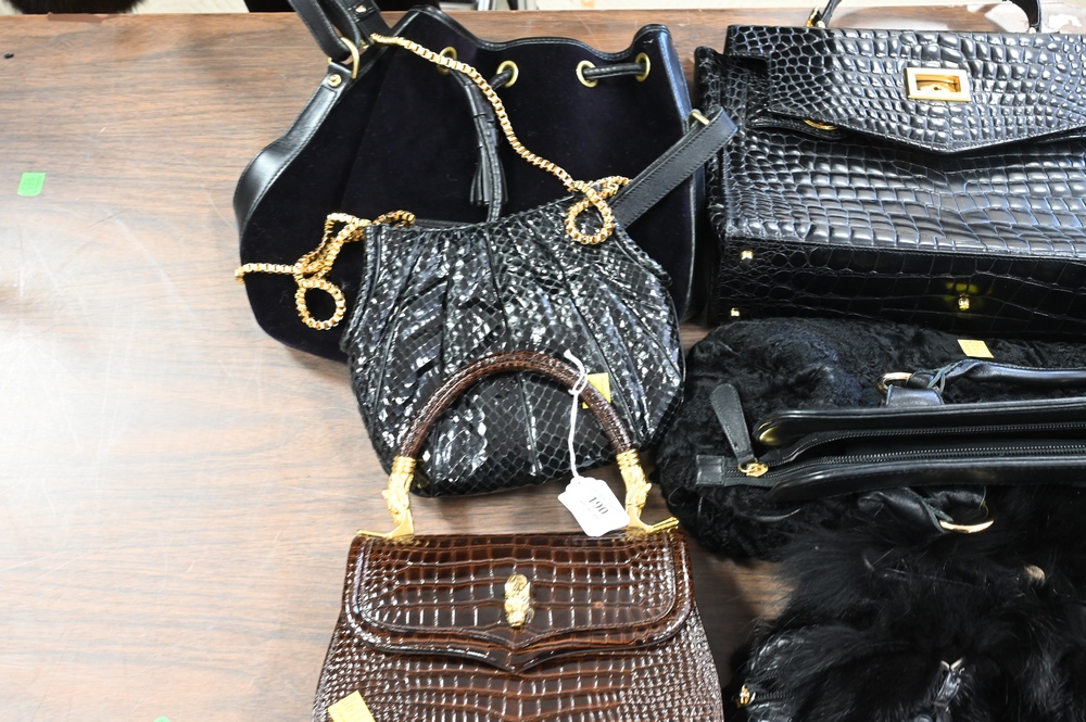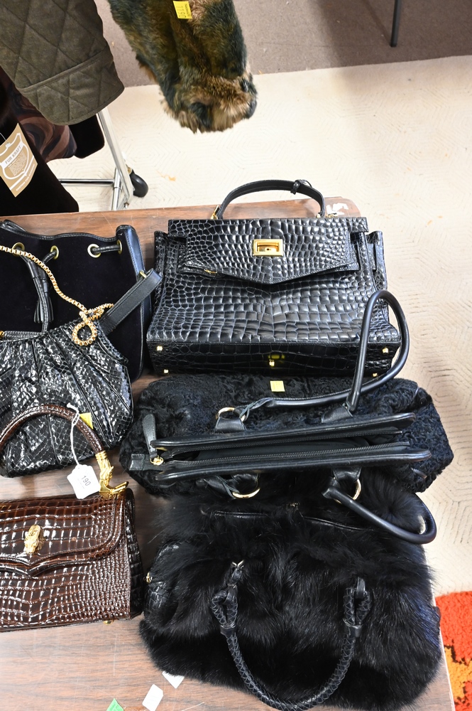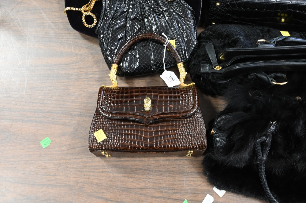 Lot 190: Six Handbags/Purses, to include Judith Leiber, Dooney & Bourke, Gianni Versace, along with two unmarked faux fur bags and faux skin …