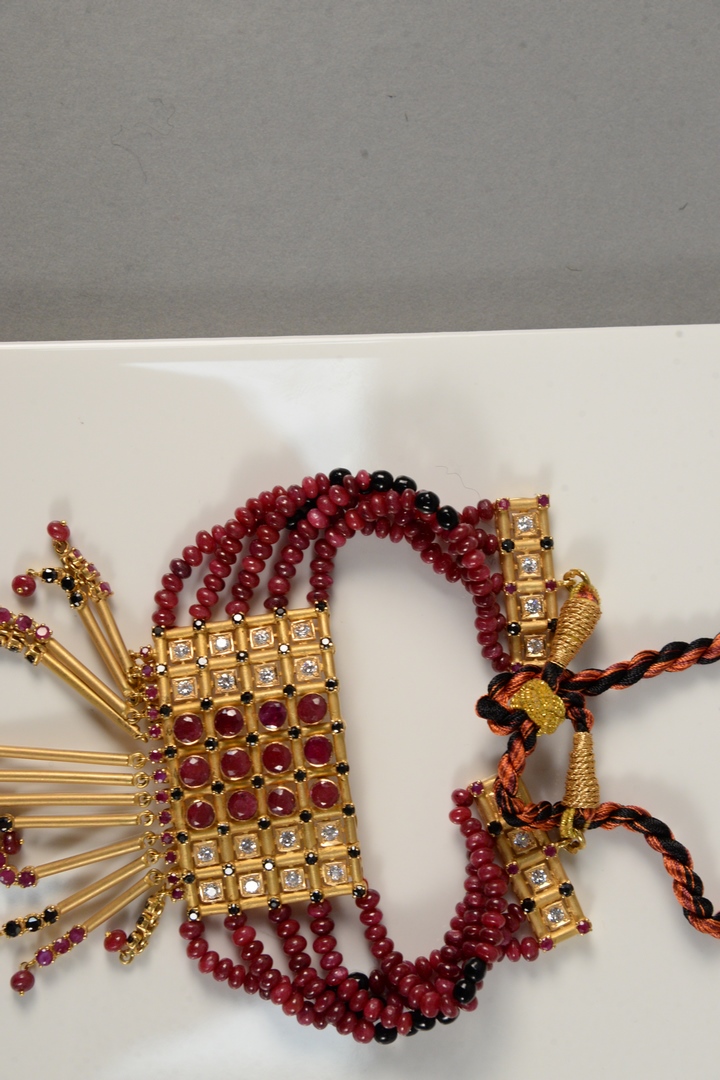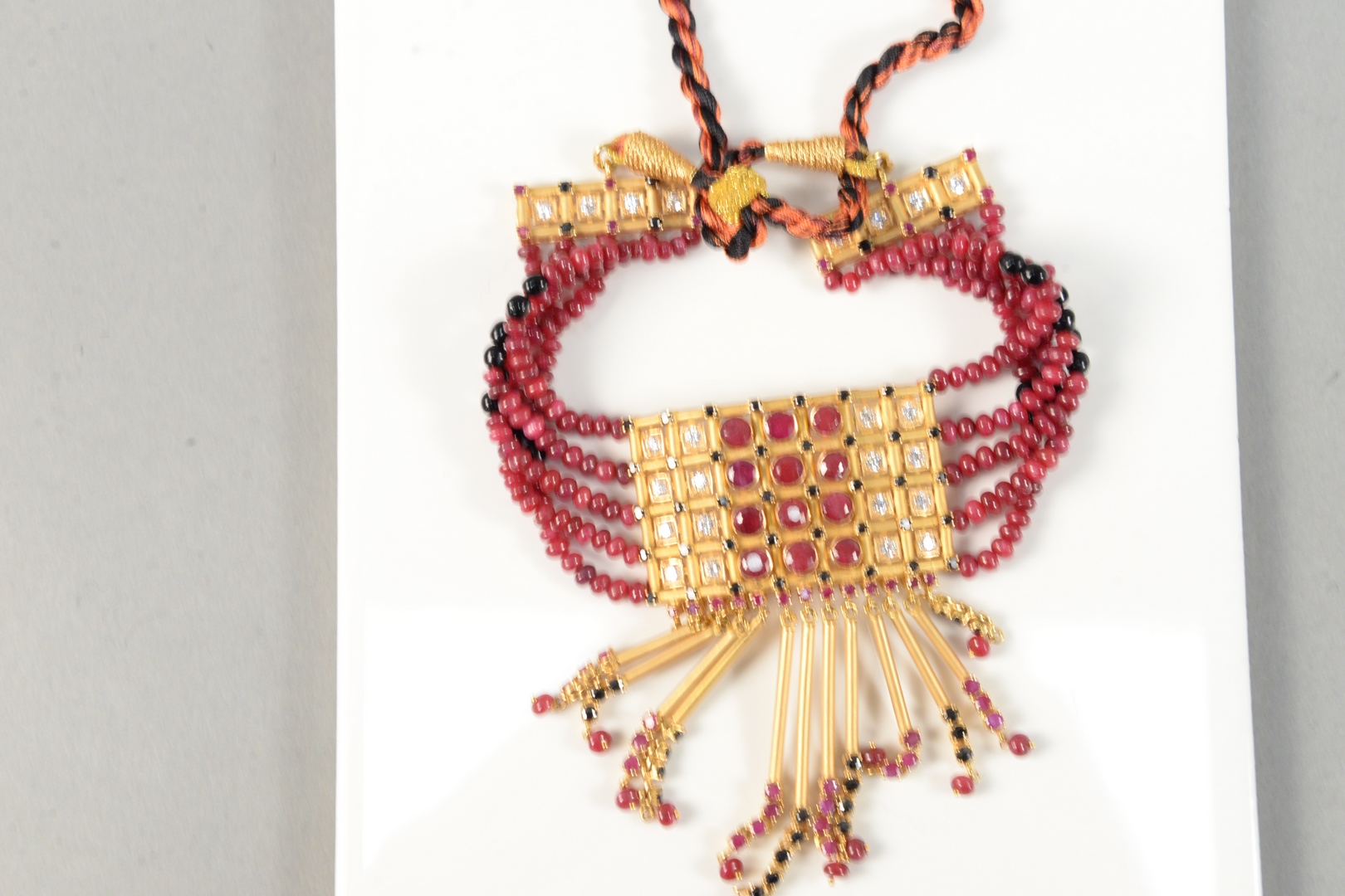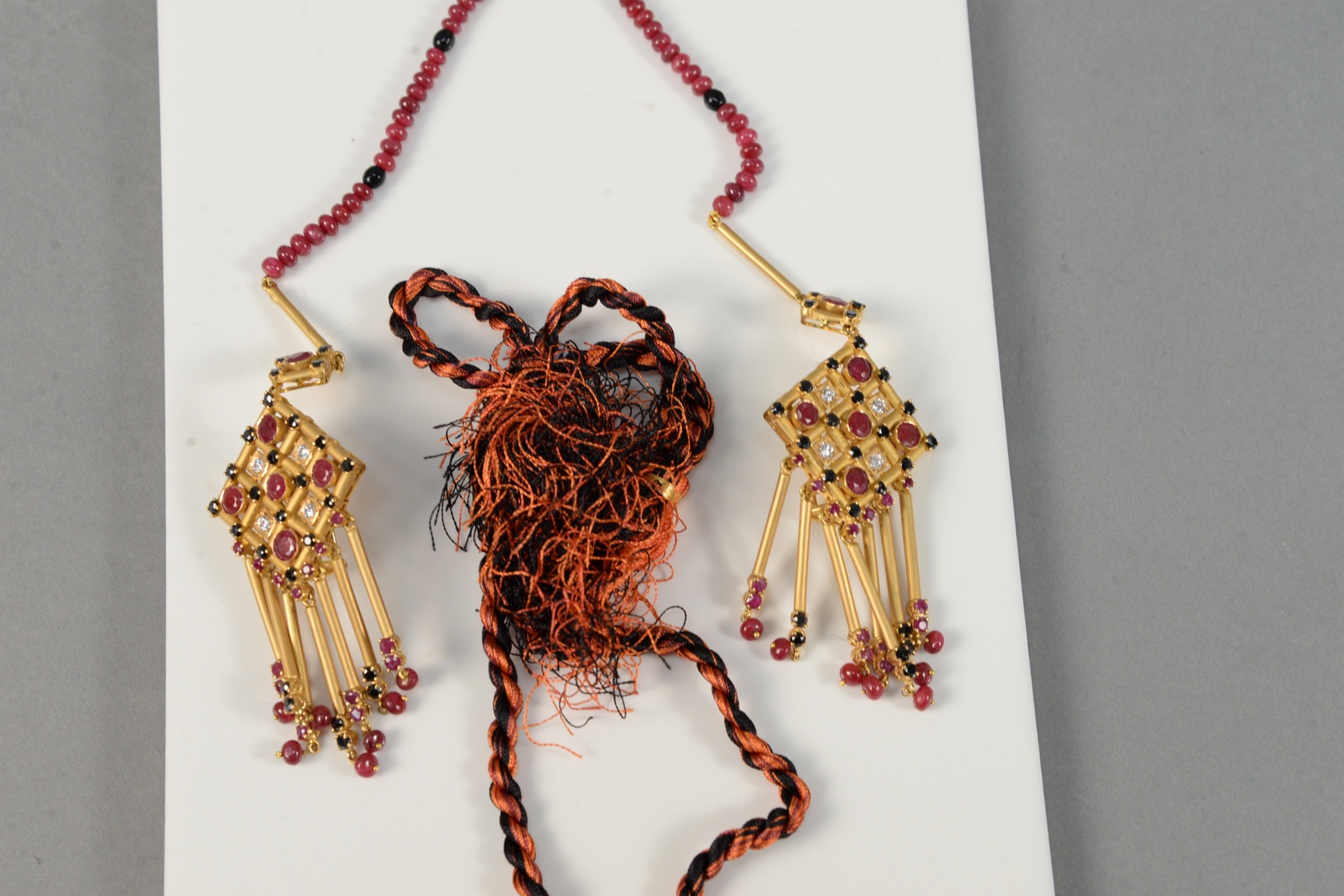 Lot 190: Three Piece 22 Karat Gold Necklace and Earrings having ruby beads, and set rubies, adjustable size earring weight 56.8 grams 142 gra…