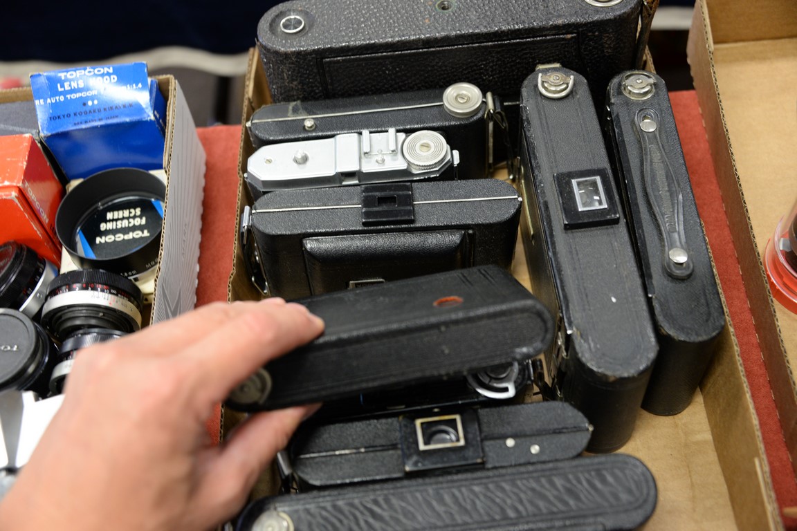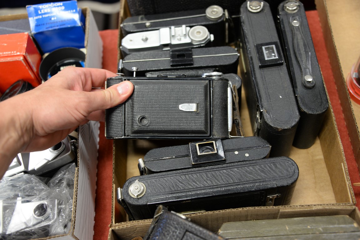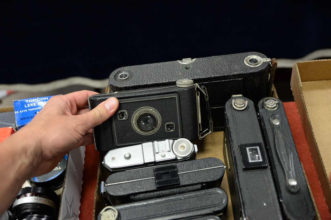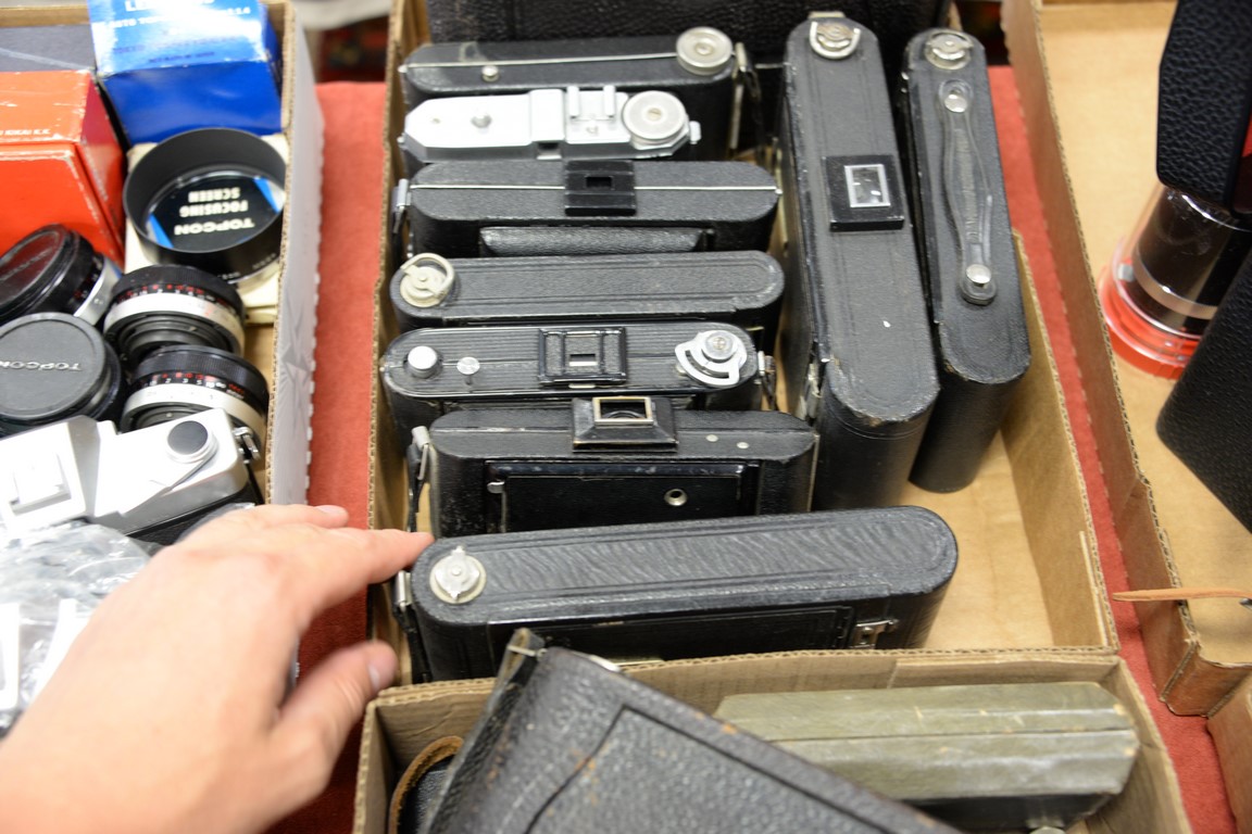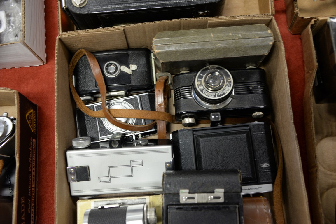 Lot 190: Two box lots: Large camera lot to include Vanity Kodak-Vest Pocket Series III, green, with original bellows, and clamshell case Duc…