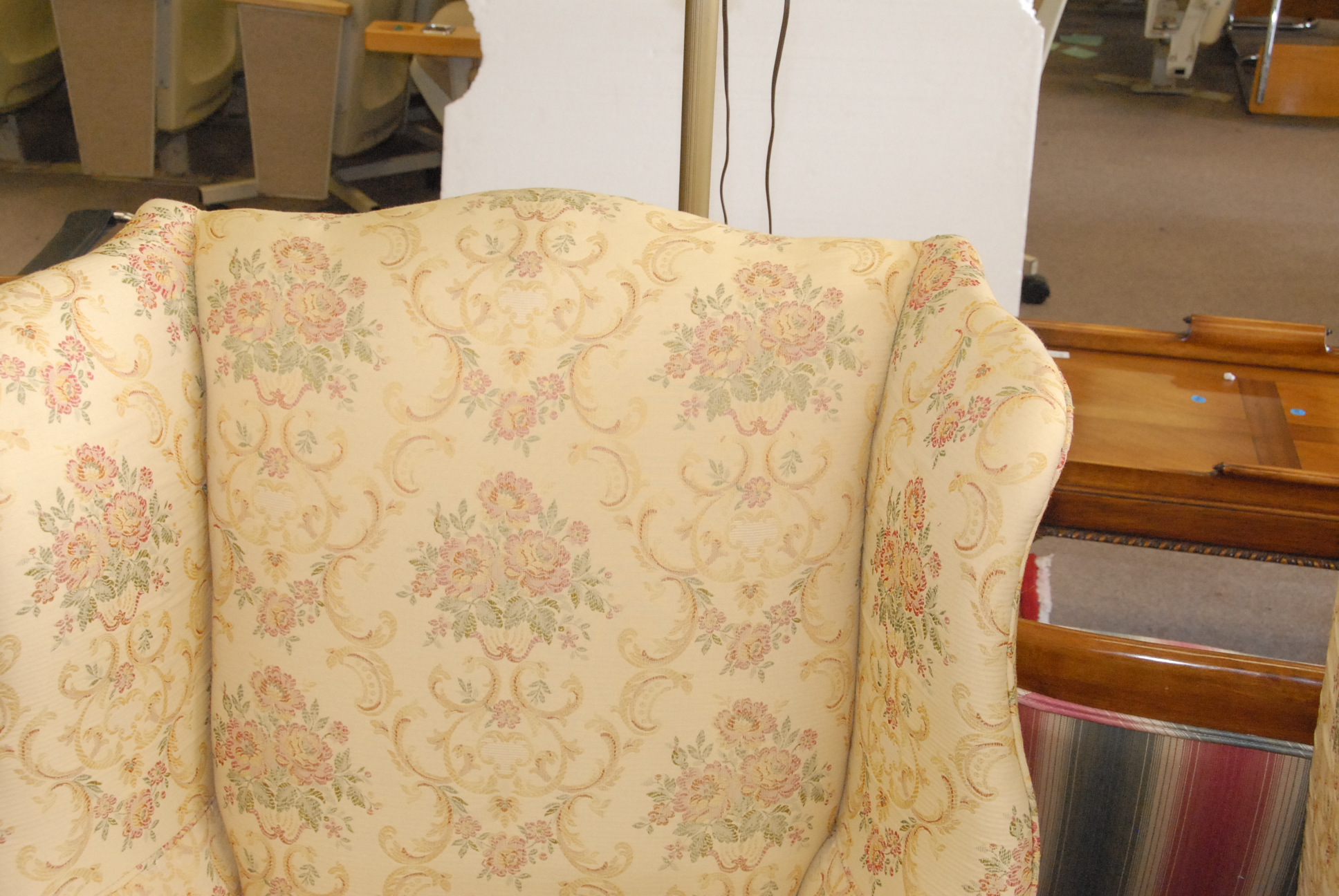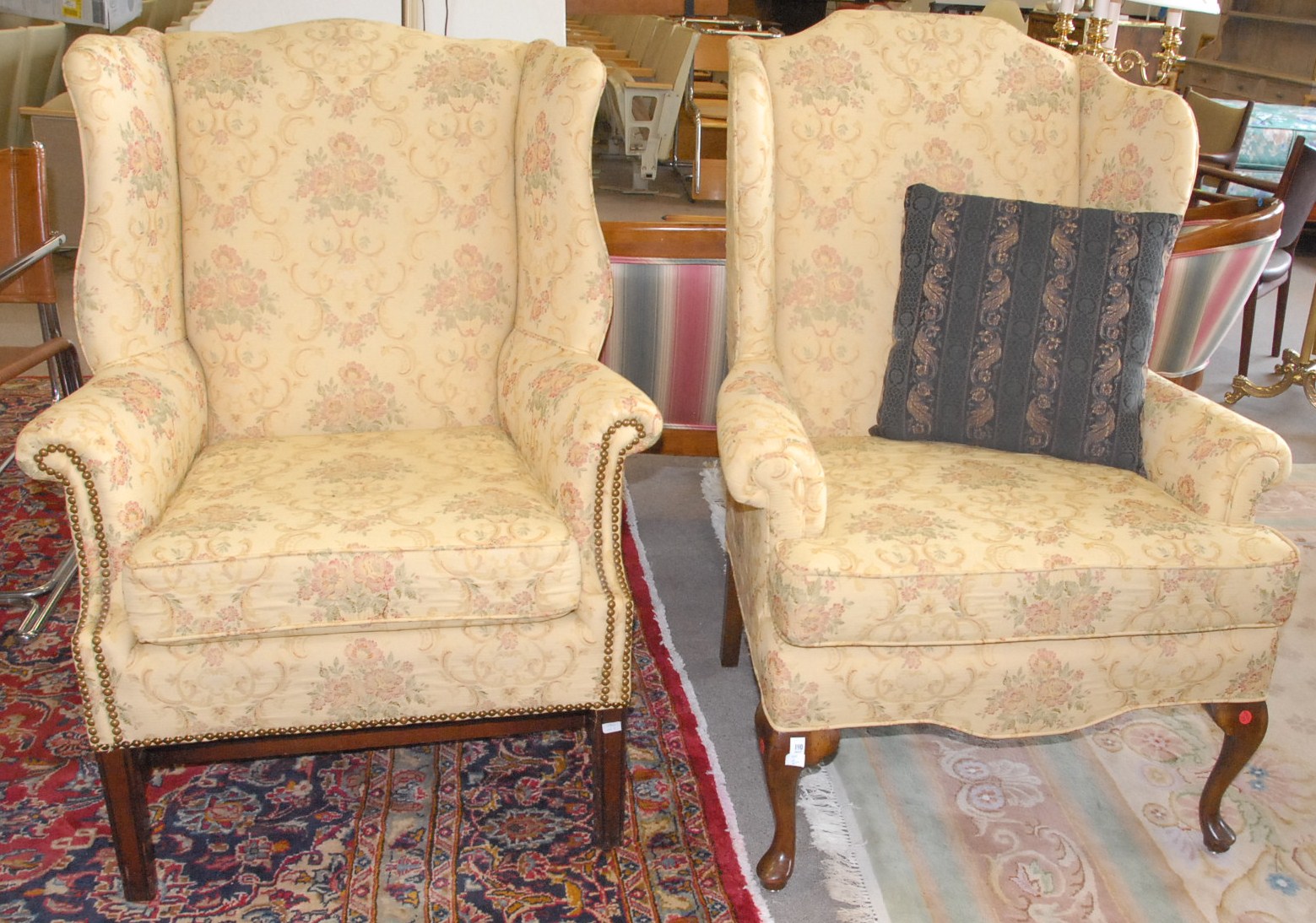 Two wing chairs, Chippendale style and a Queen Anne style, each upholstered the same.