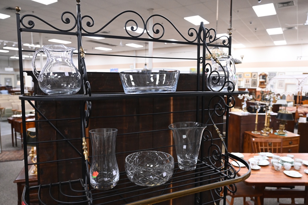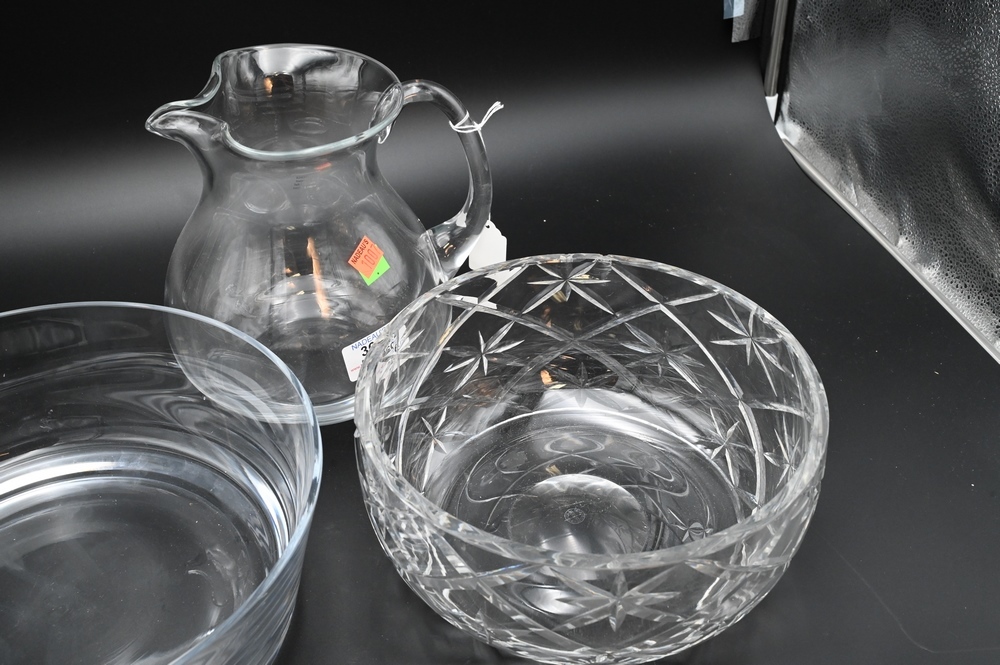 Lot 190A: Eight Piece Glass Group, to include four Krosno pieces, two under plates, center bowl and a D’Argental bowl (as is), tallest 10 1/2 inches; along with tray top table.