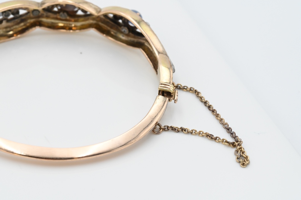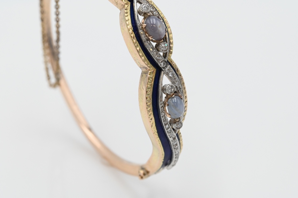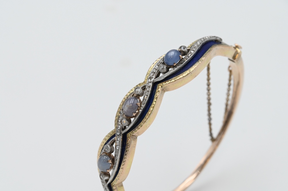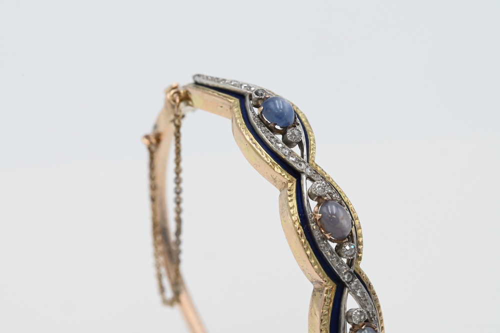 Lot 191: 14 Karat Gold Bangle Bracelet, having intertwined cobalt enameling, set with three star sapphires and diamonds, 24 grams.