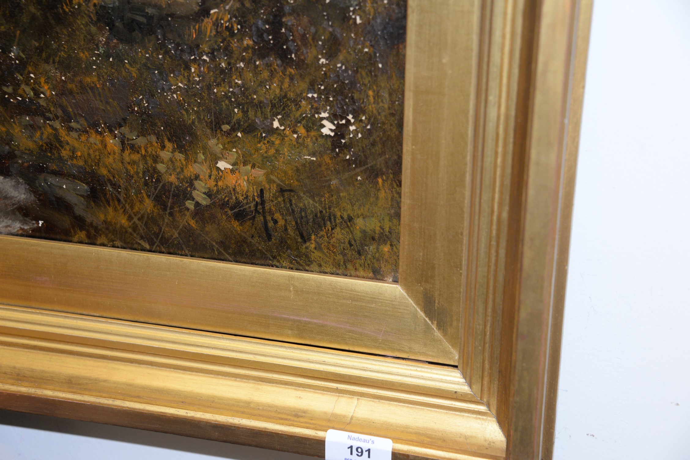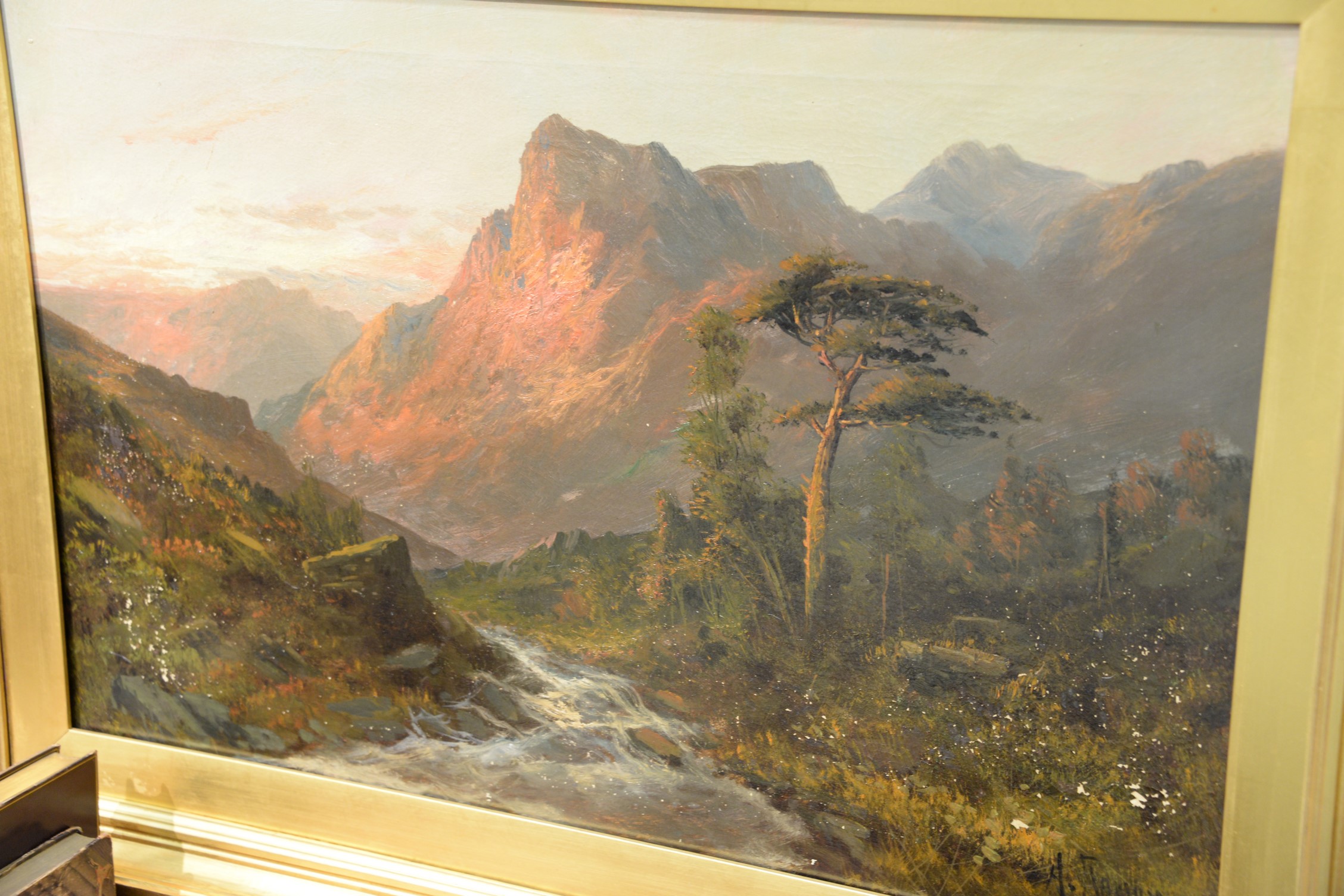 Lot 191: 19th Century Sunset in Mountainous Landscape with Stream oil on canvas signed lower right indistinctly A… 20 x 30 P…