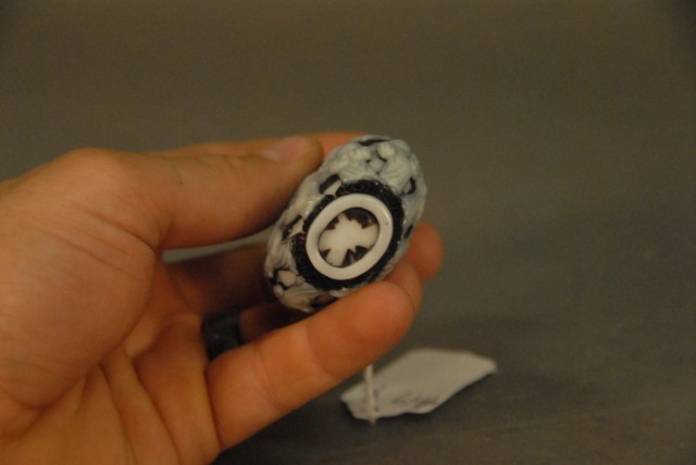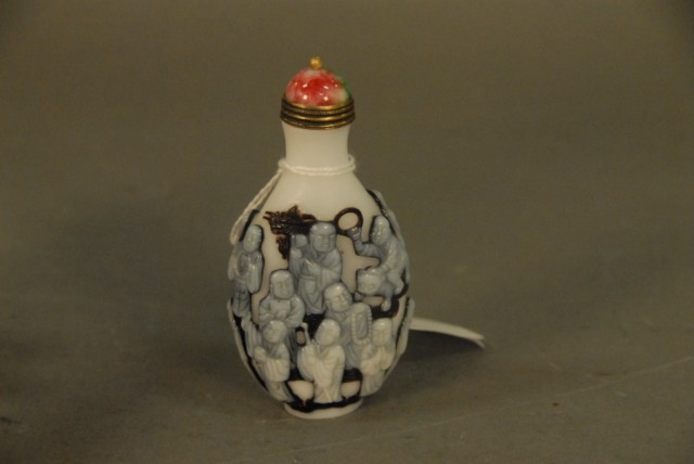 Buddha black and white overlay white glass snuff bottle having carved 2 tier of standing Buddha figures 19th century