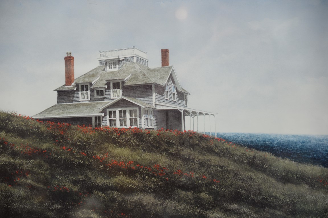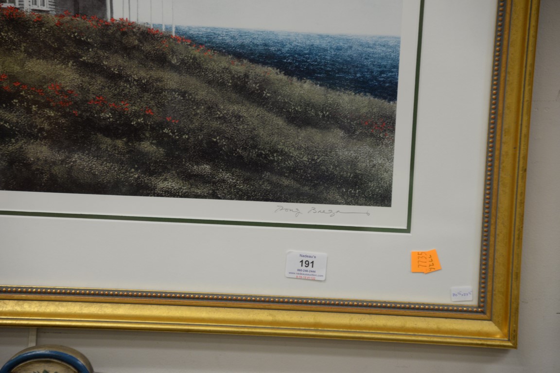 Lot 191: Doug Brega 1948 print of Maine coastal home, signed in pencil lower right Doug Brega, 20 1/2 x 27 1/2.
