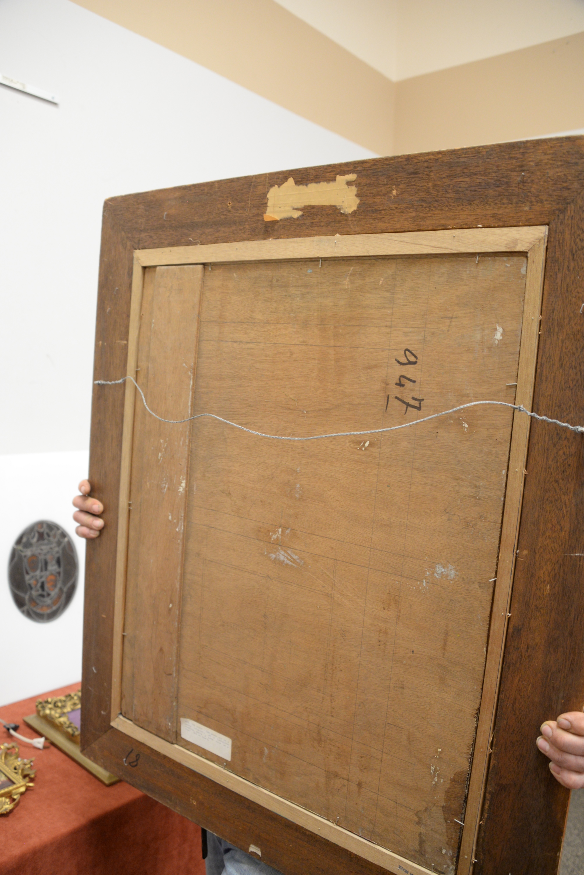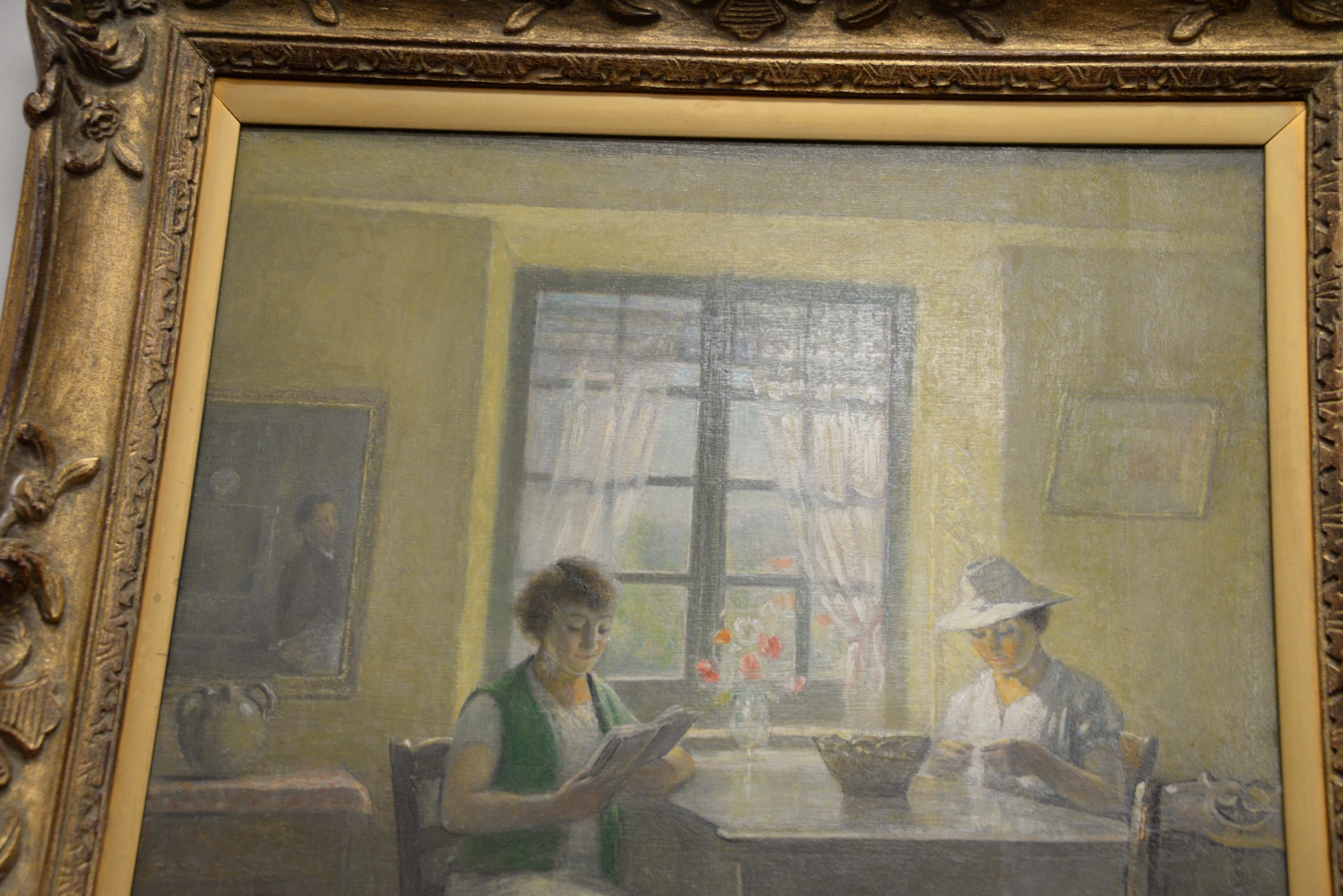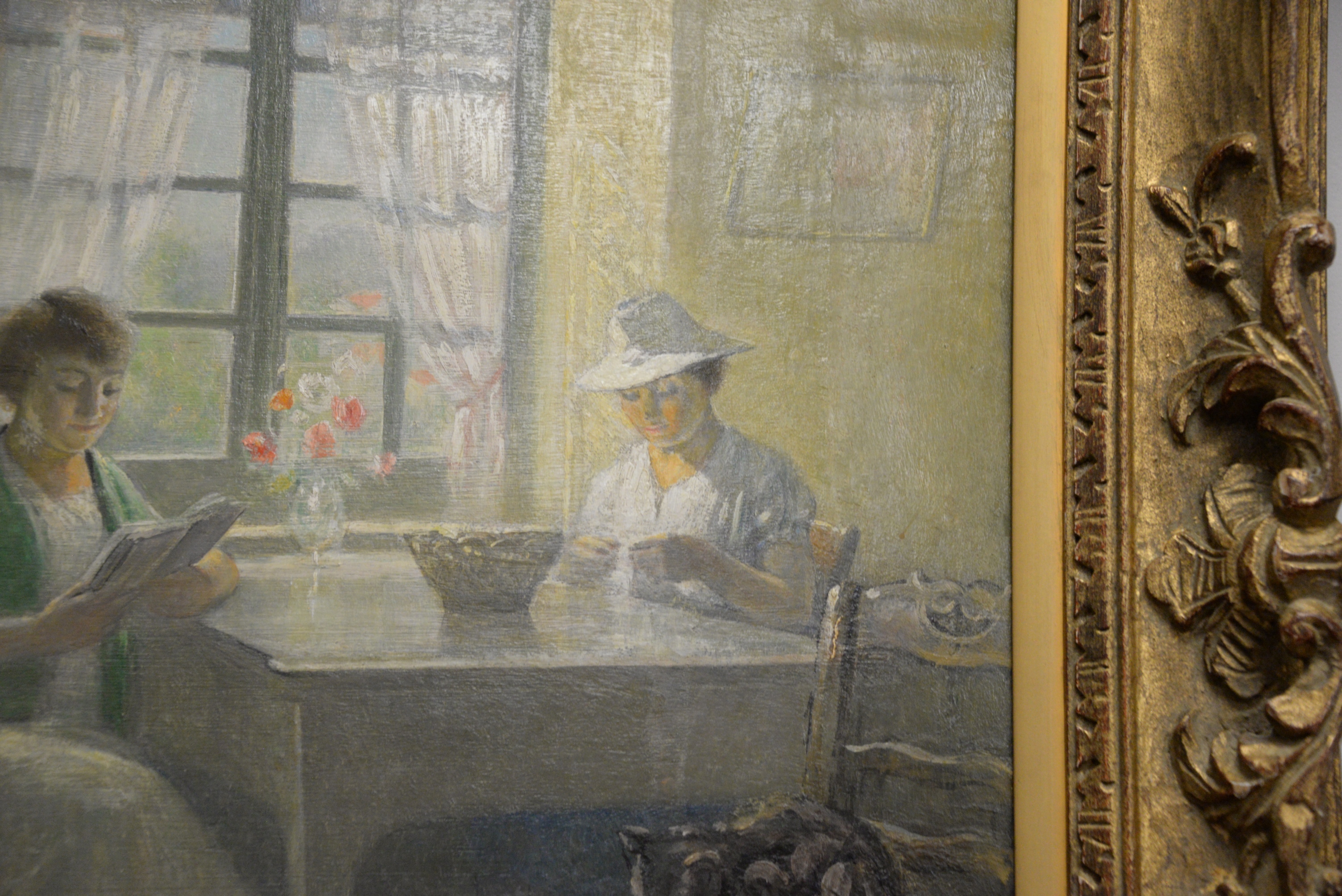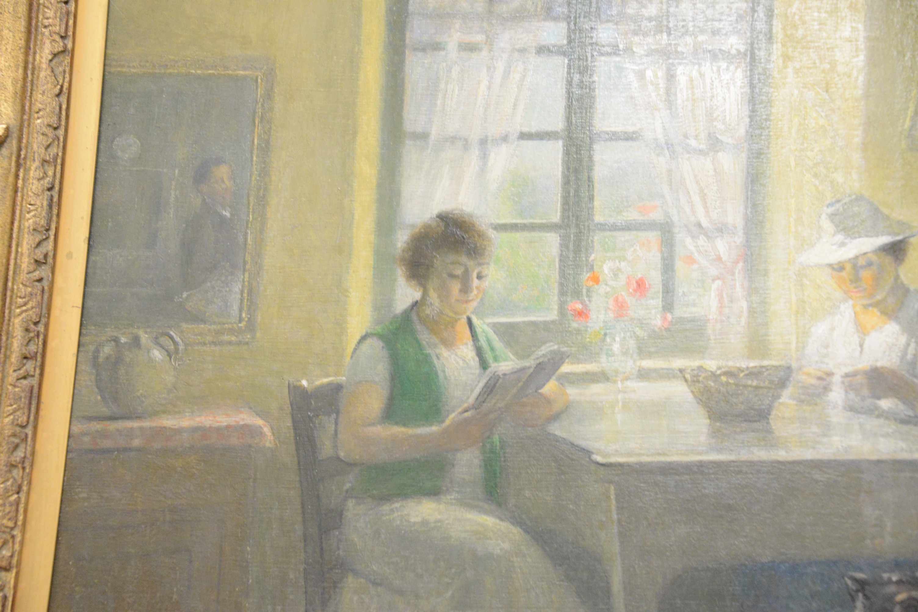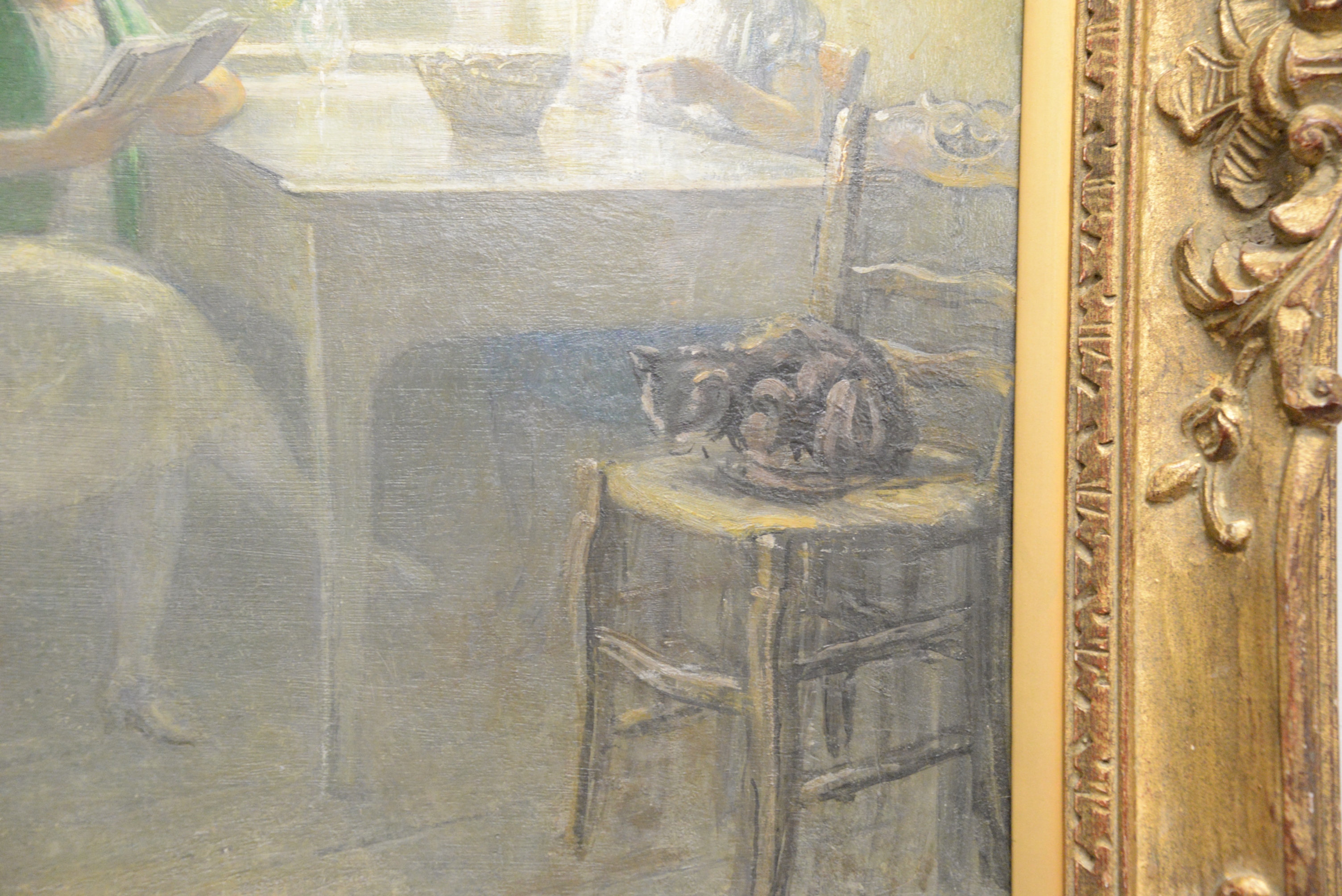 unsigned, back lower left with description, “Two women sit in a sunny interior, at a table, one reading, while a cat sits on a chair”