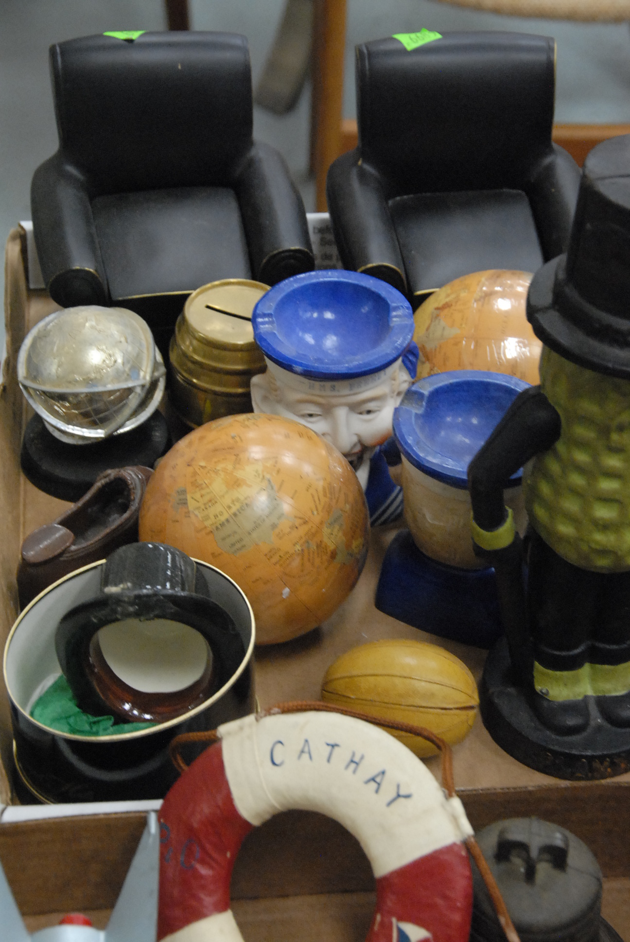 Four box lots Planters Peanut iron still safe, mailbox safe, bronze car, building still safe, wind up motor cycle, toy rocket ship and car, pair of chair bookends, pair of ash trays, pair of late 20th century globes, five tins, and miscellaneous.