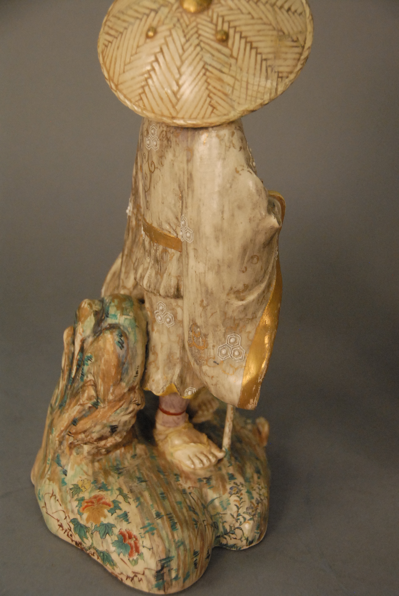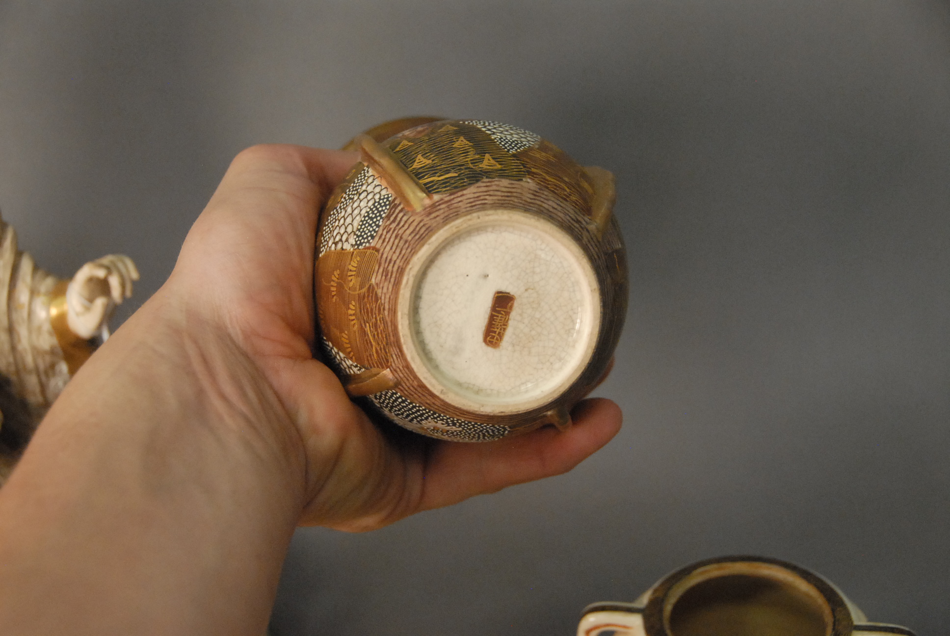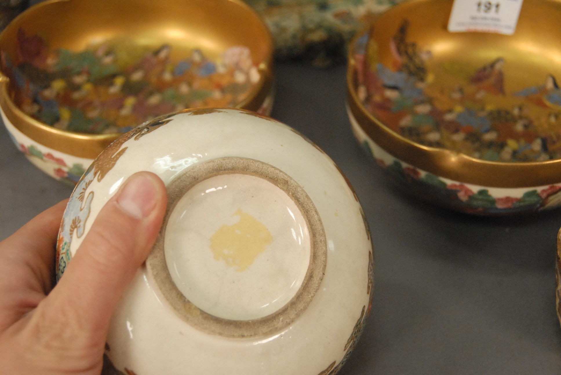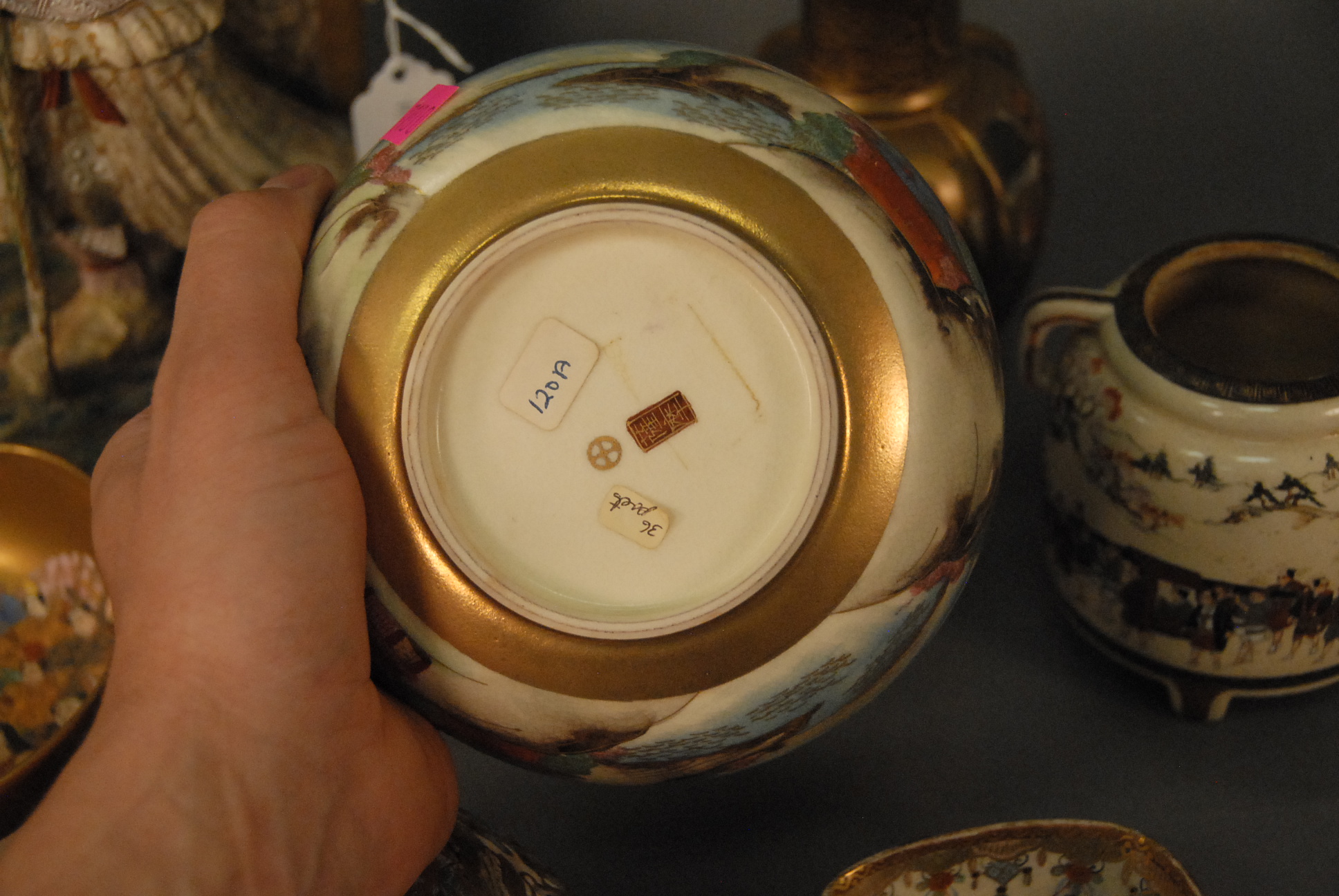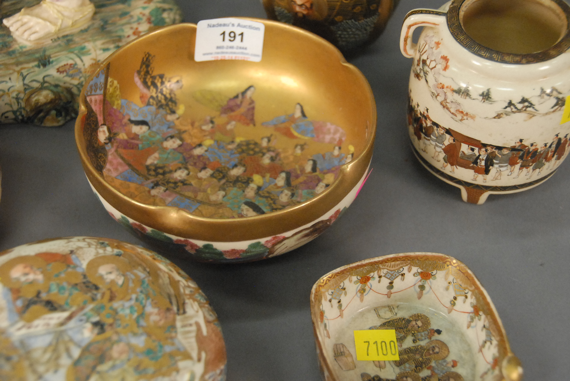 Lot 191: Group of nine Satsuma pieces to include a pair of bowls, scholar vase, round covered box, two small vases, small bowl, jar missing cover, and Satsuma figure of a scholar. bowls: dia. 6 in.