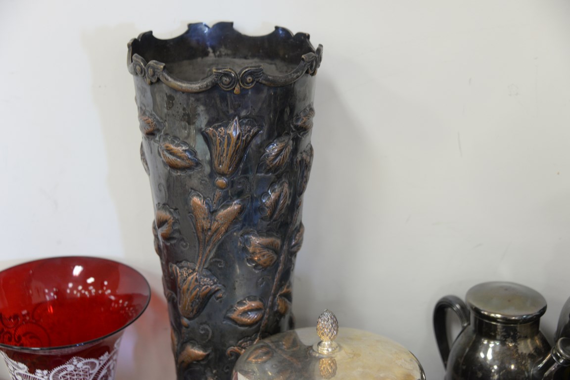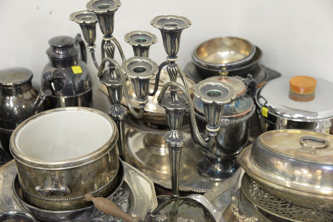 Large group of silverplate to include tray, pair of candelabras, large vase, etc.