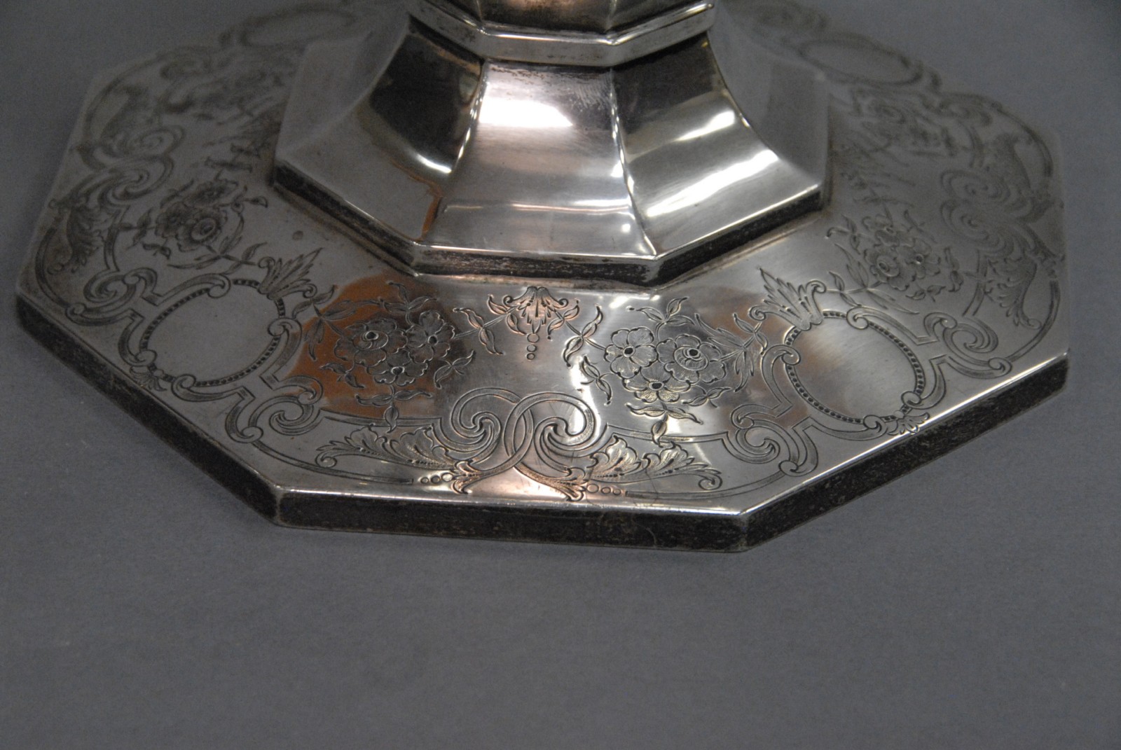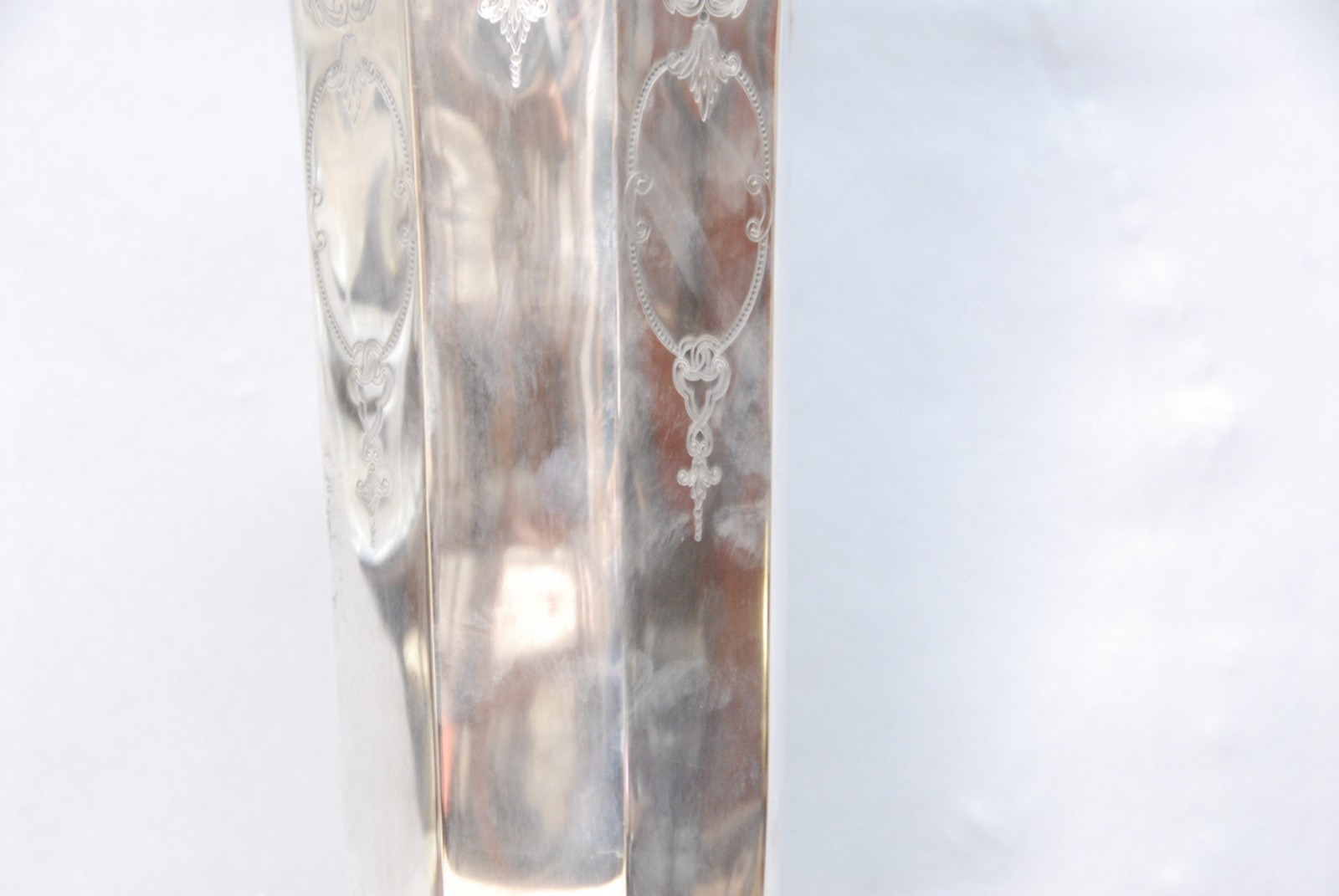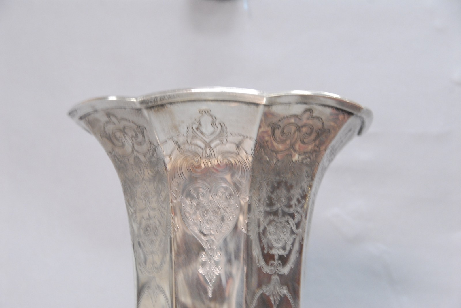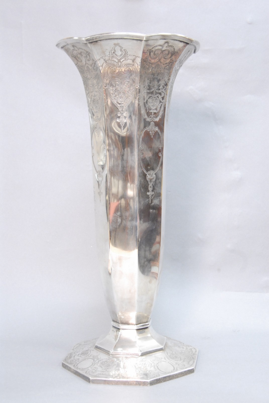 Large sterling silver trophy vase with chased designs marked Presented to Ralph Greenwood PGA 1969 Shorehaven Golf Club.