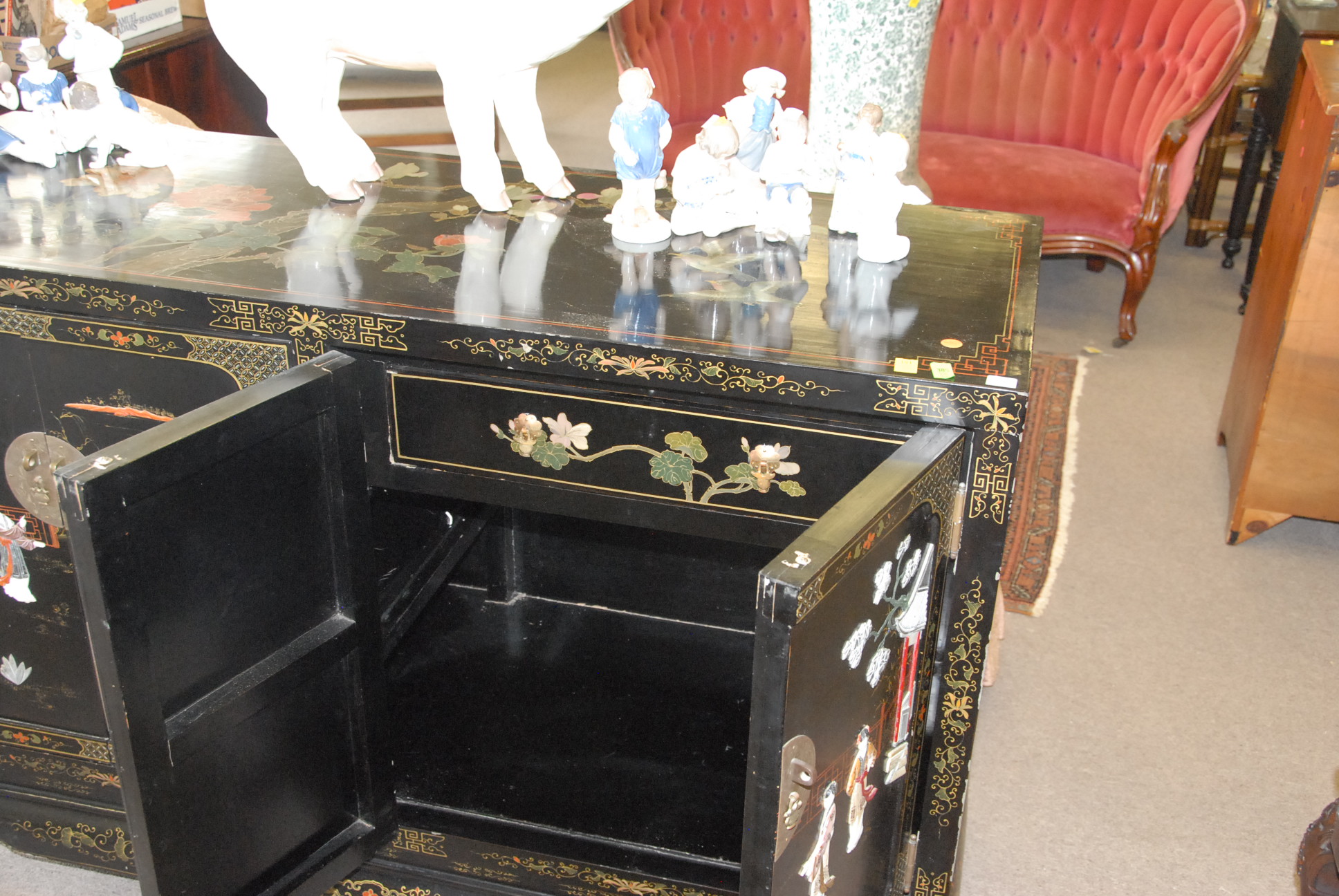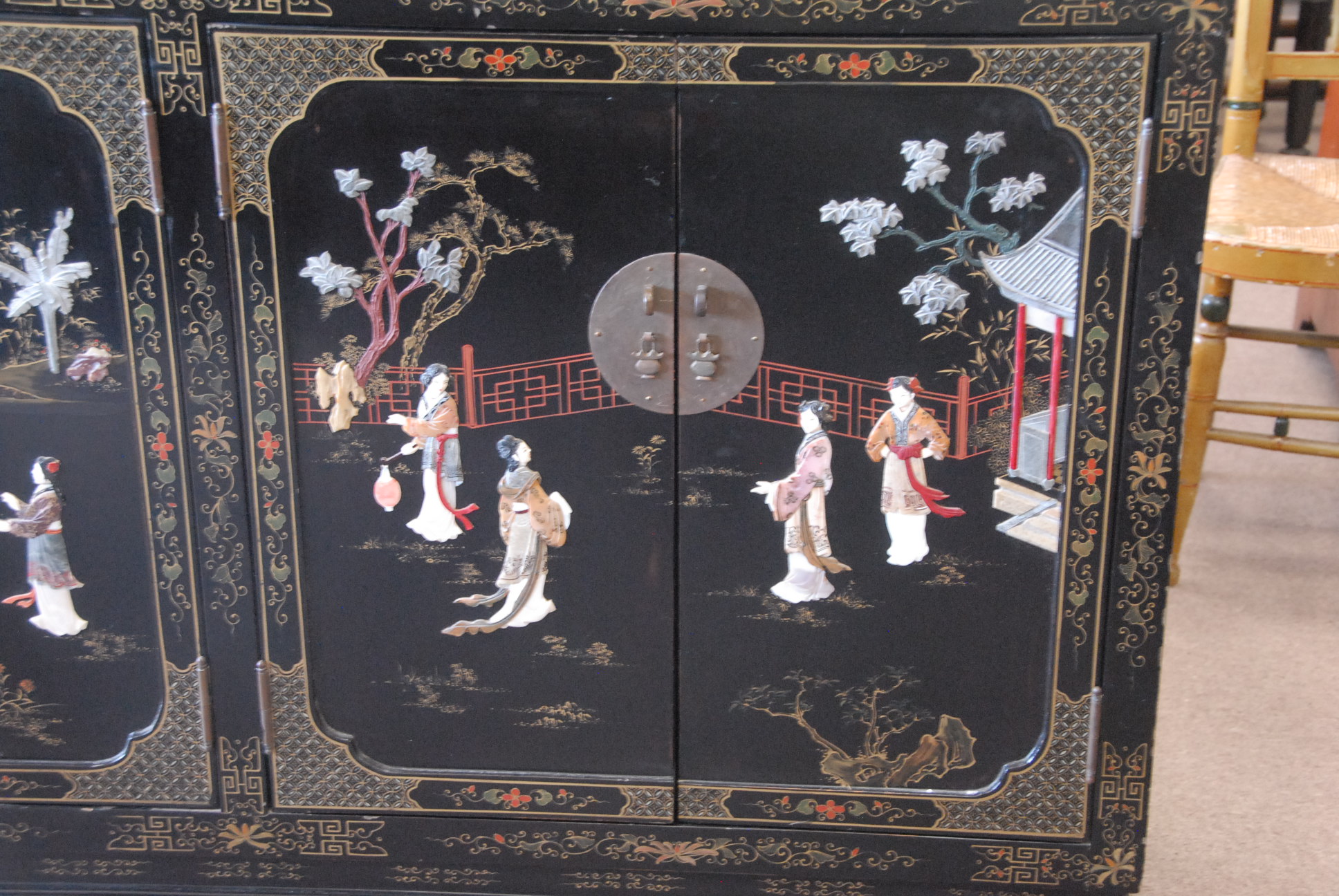 Oriental style cabinet with three dimensional figures, lg. 54.