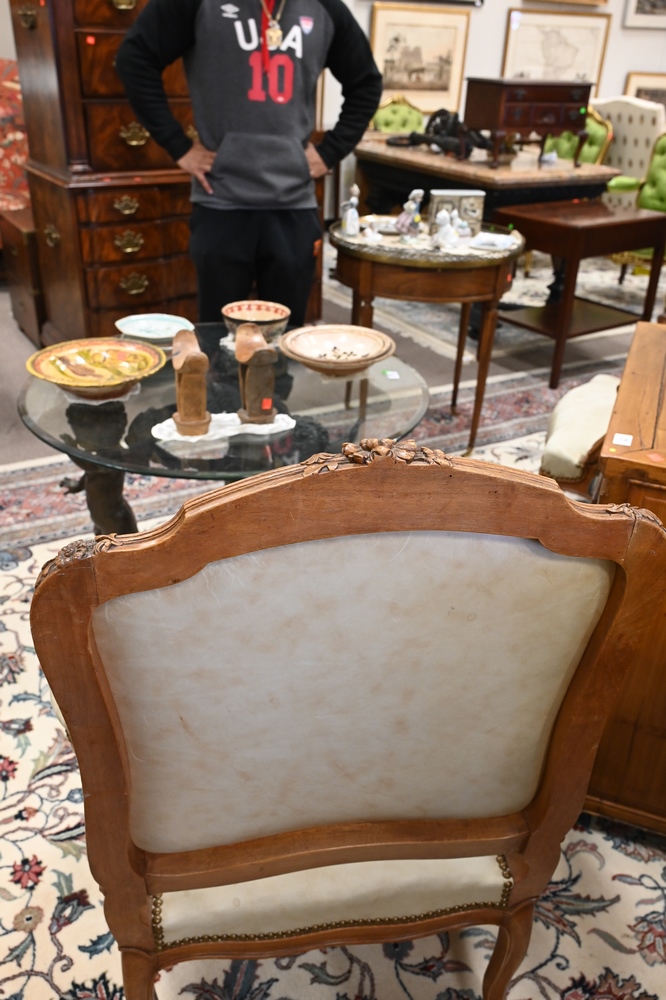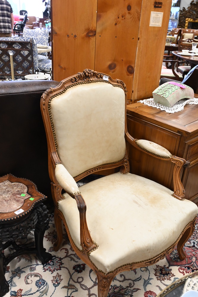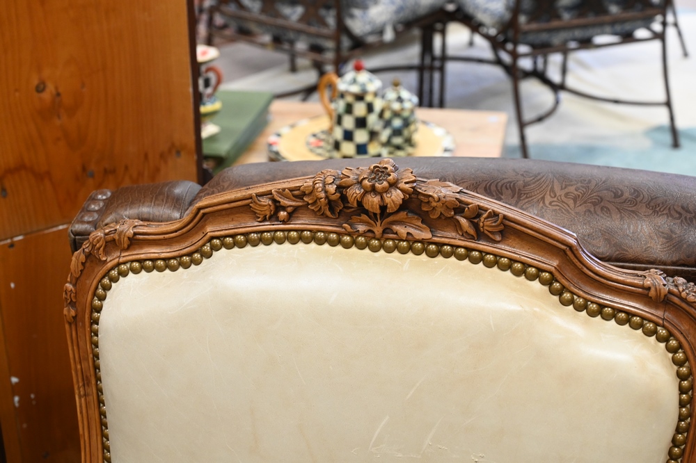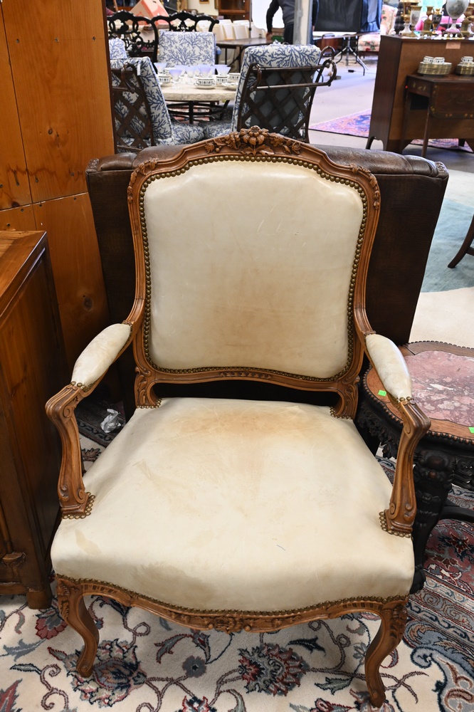 Lot 191: Pair of Louis XV Style Bergeres, having leather upholstery, height 41 inches, width 28 inches, (stained), Provenance: From a private New York City collection.