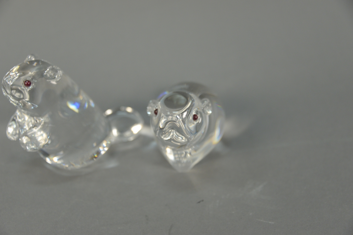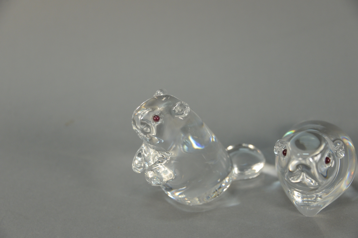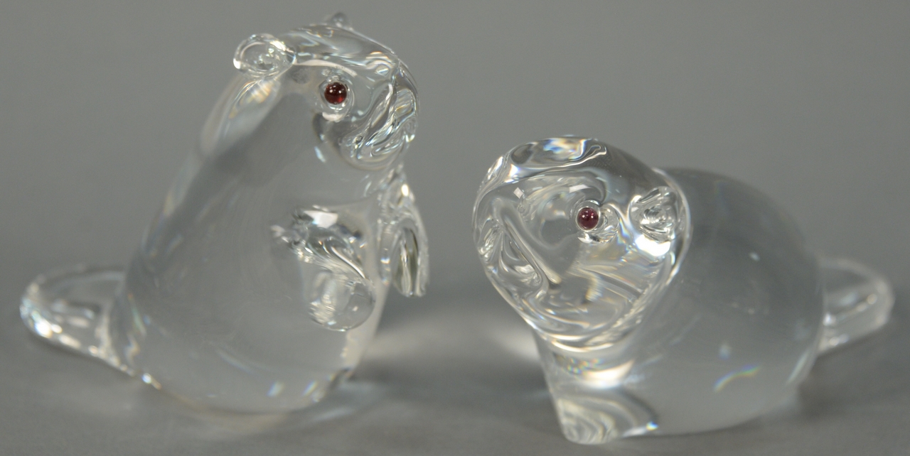 Lot 191: Pair of Steuben crystal beaver figurines with red glass eyes signed Steuben. tallest: 3 3/4in., longest: 6in.
