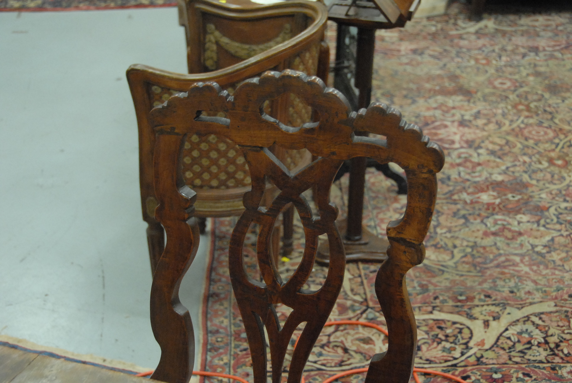Set of four Dutch Rococo style carved fruitwood side chairs with upholstered slip seats some restoration. ht. 41in. wd. 18 1/2in. dp. 15in.