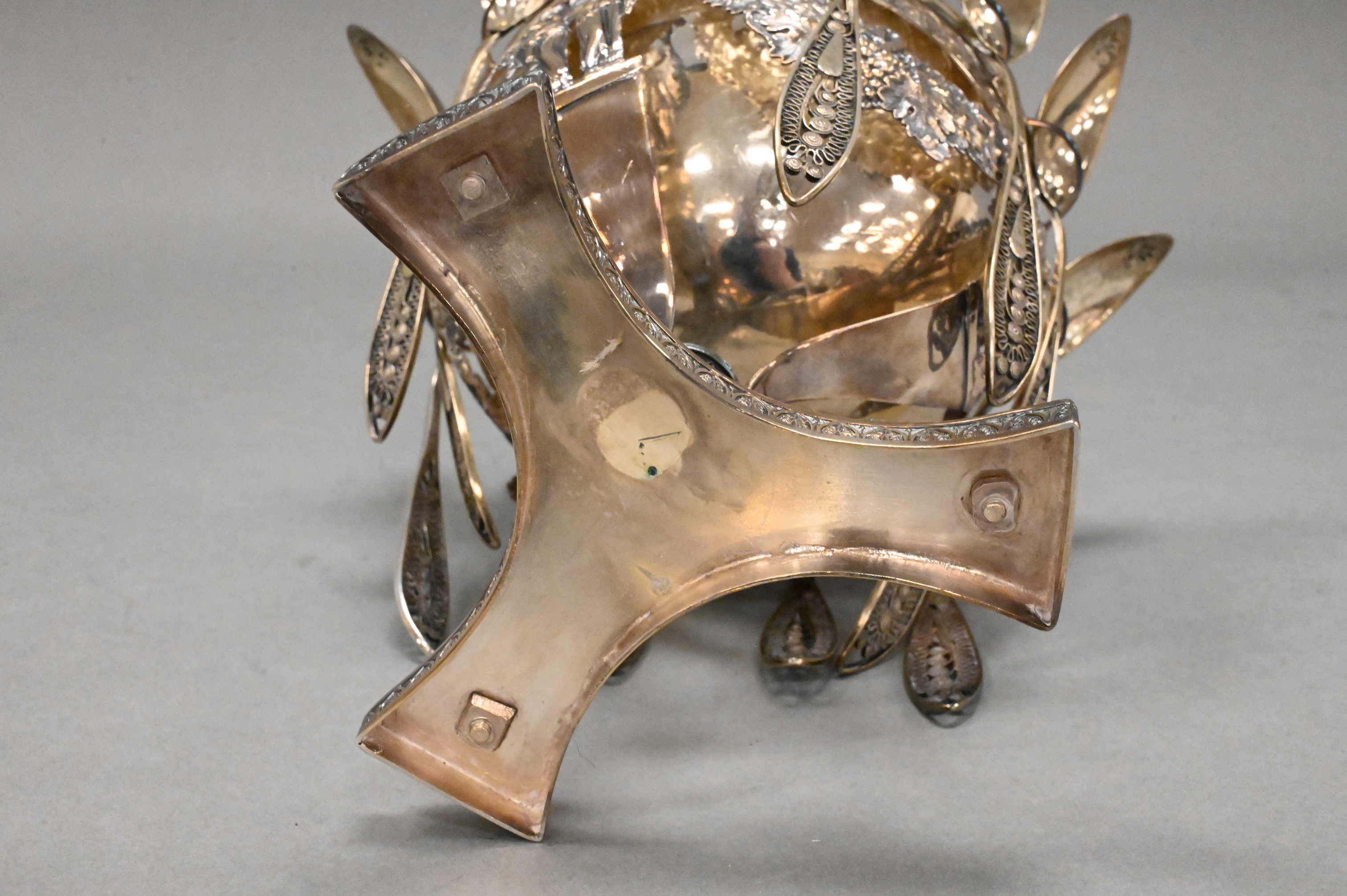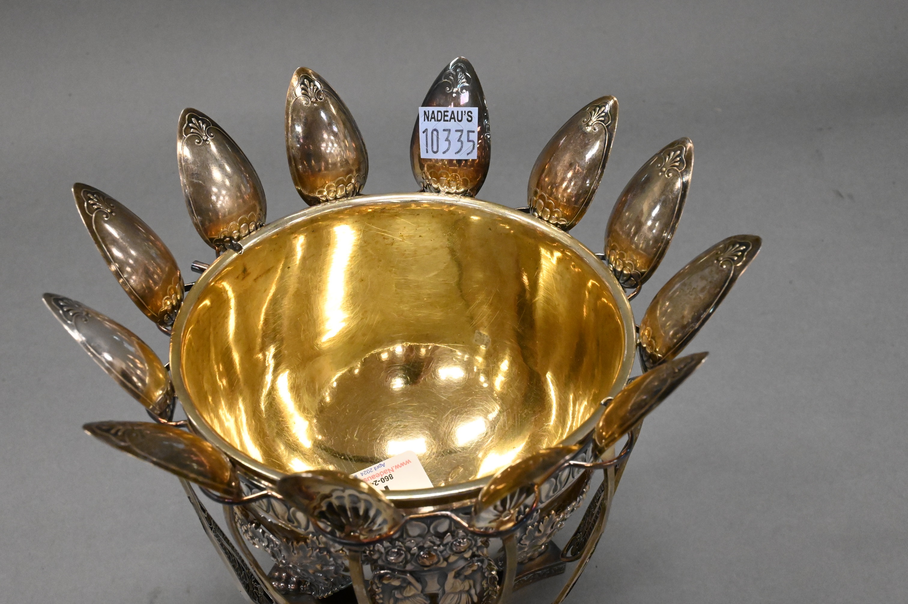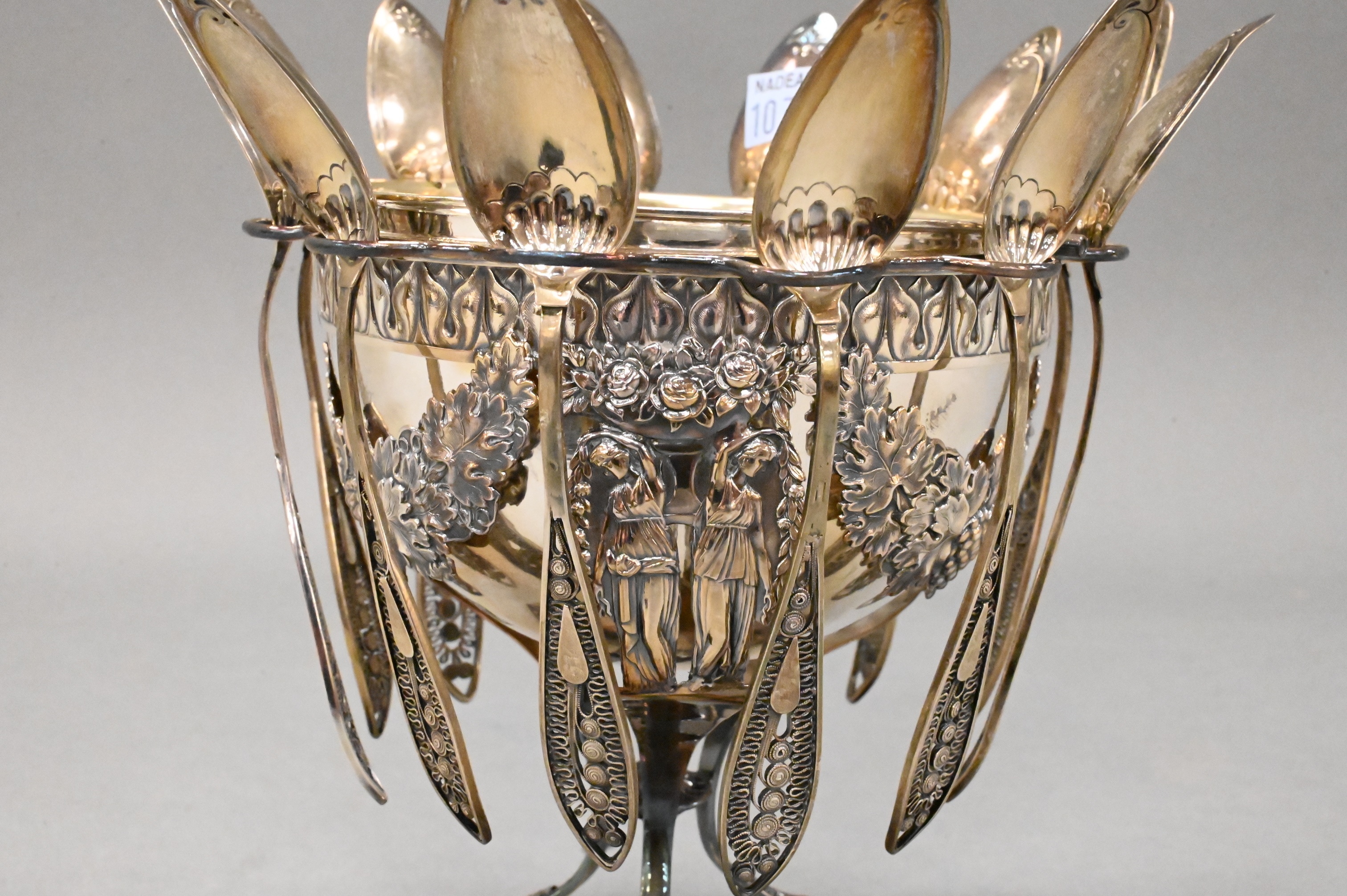 having Neoclassical figural and floral motif, fit with 12 filigree spoons, set on tripod clawed feet, gold wash to interior