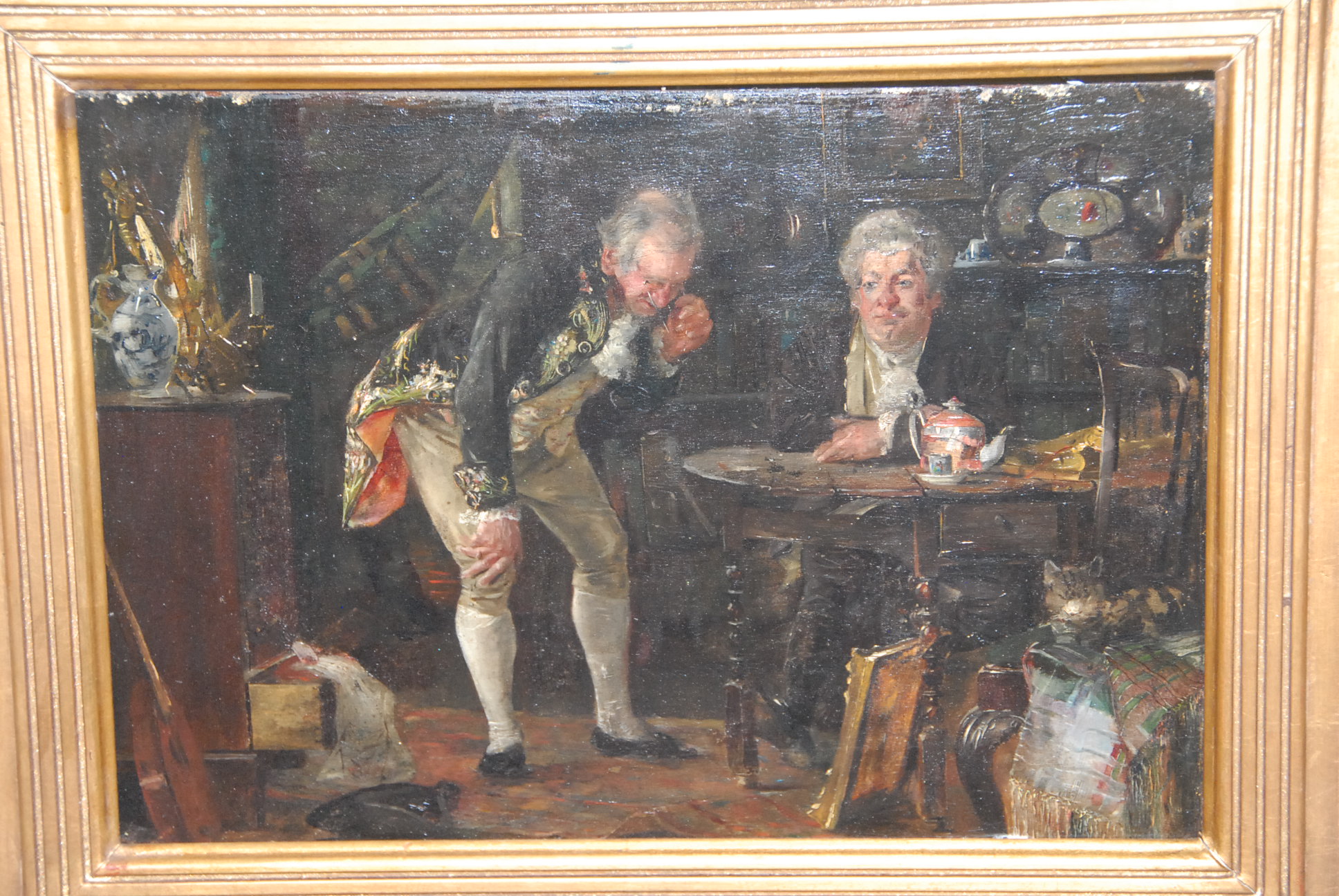 Spanish Leon Escoura oil on board of an interior scene with two men.