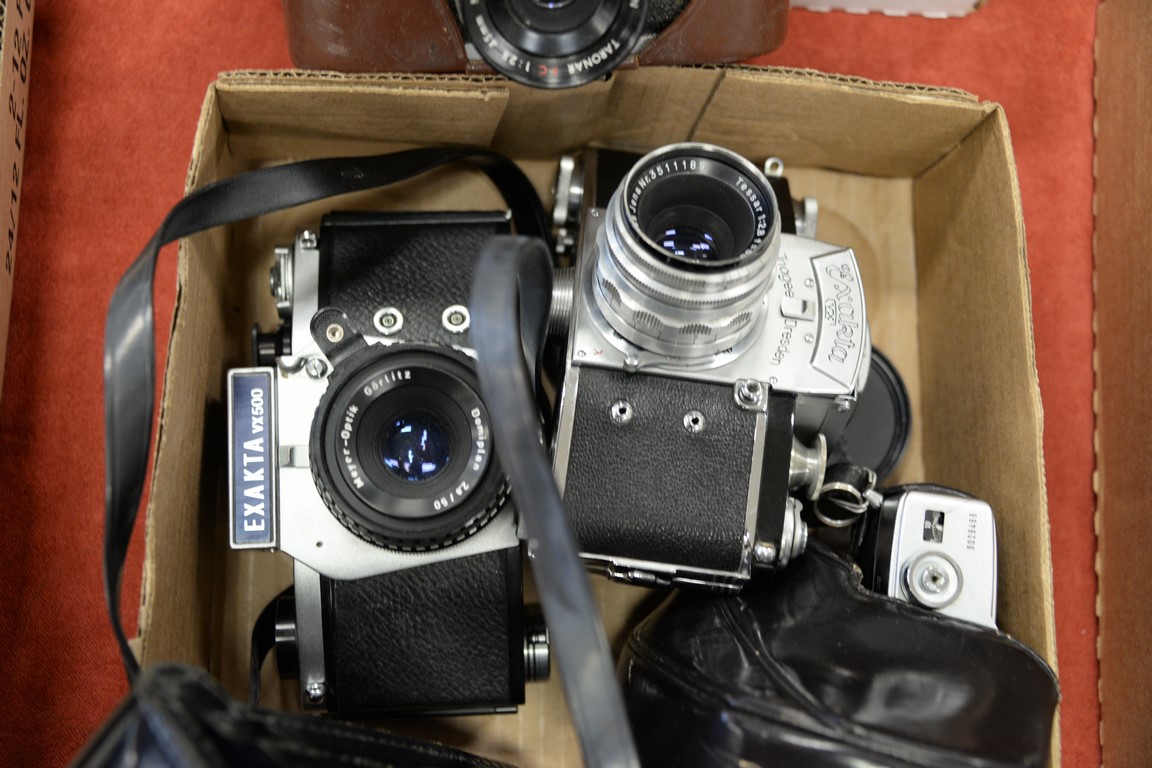 Two box lots: Camera lot to include 2 Bessler Auto 100 with 3 UV Topcor 53/2, RE. Auto-Topcor 135cm/3.5, lens hoods, focusing screens, Tokyo Optical prism, etc. along with miscellaneous cameras including Minolta Autocord Twin Lens Reflex with Rokkor 75/3.5 in case, Minolta SR7 35mm camera with Rokkor PF 55/2 in case, Exakta VX 500 with Domiplan 50/2.8, Exakta VX with Zeiss Jena Tessar 50/2.8, and Taron VL with Tavonar 45/2.8 1/2 case.