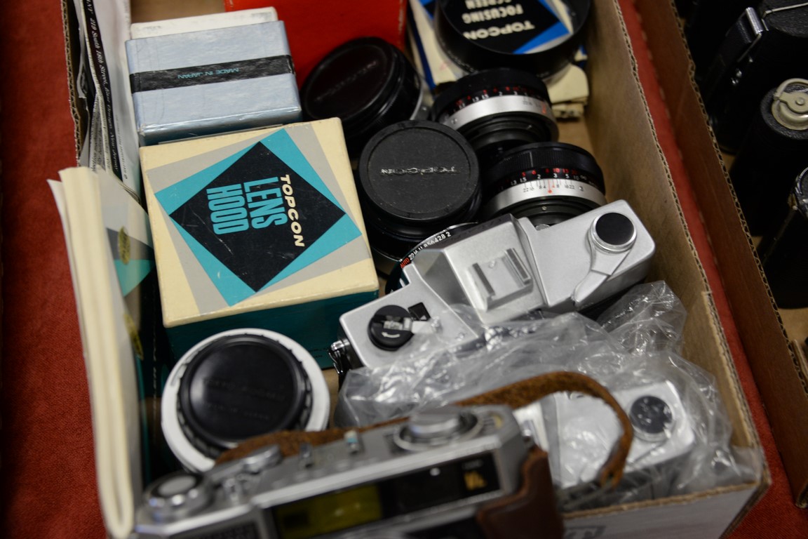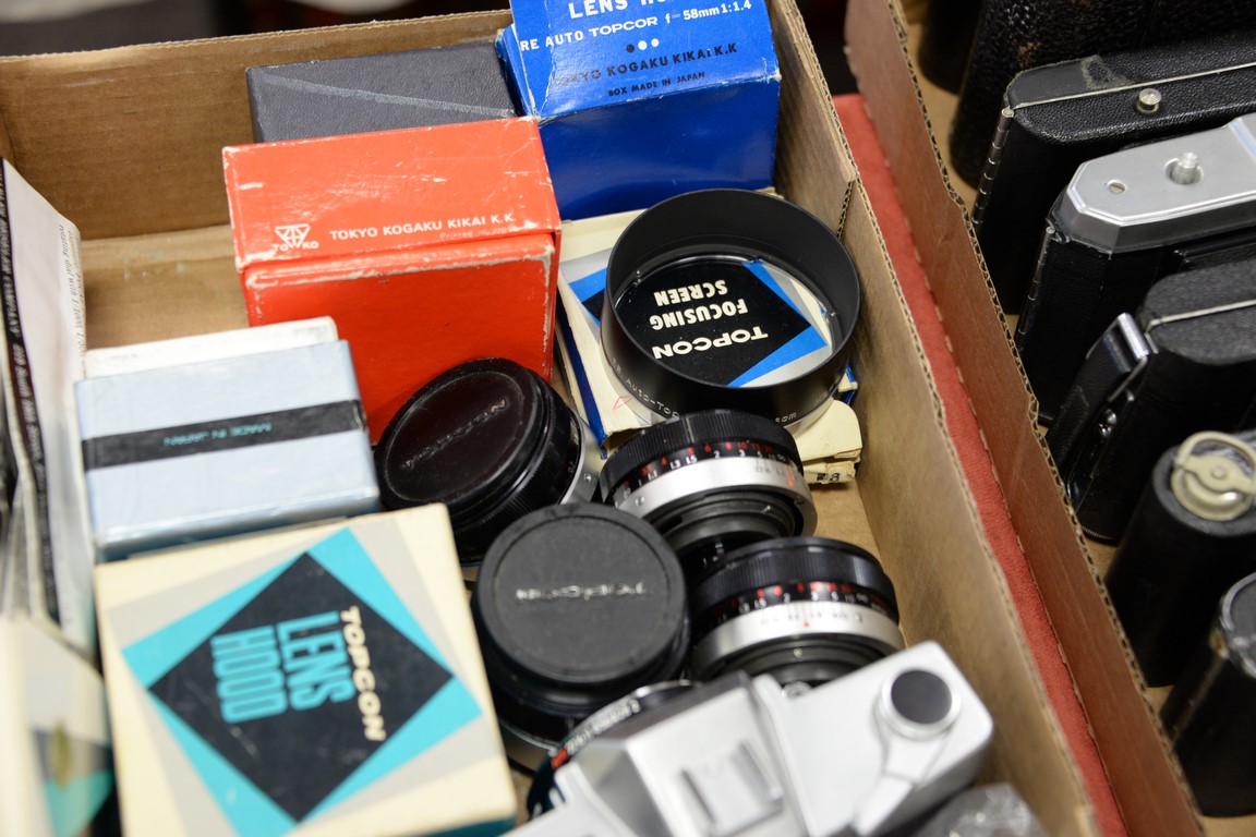 Lot 191: Two box lots: Camera lot to include 2 Bessler Auto 100 with 3 UV Topcor 53/2, RE. Auto-Topcor 135cm/3.5, lens hoods, focusing sc…