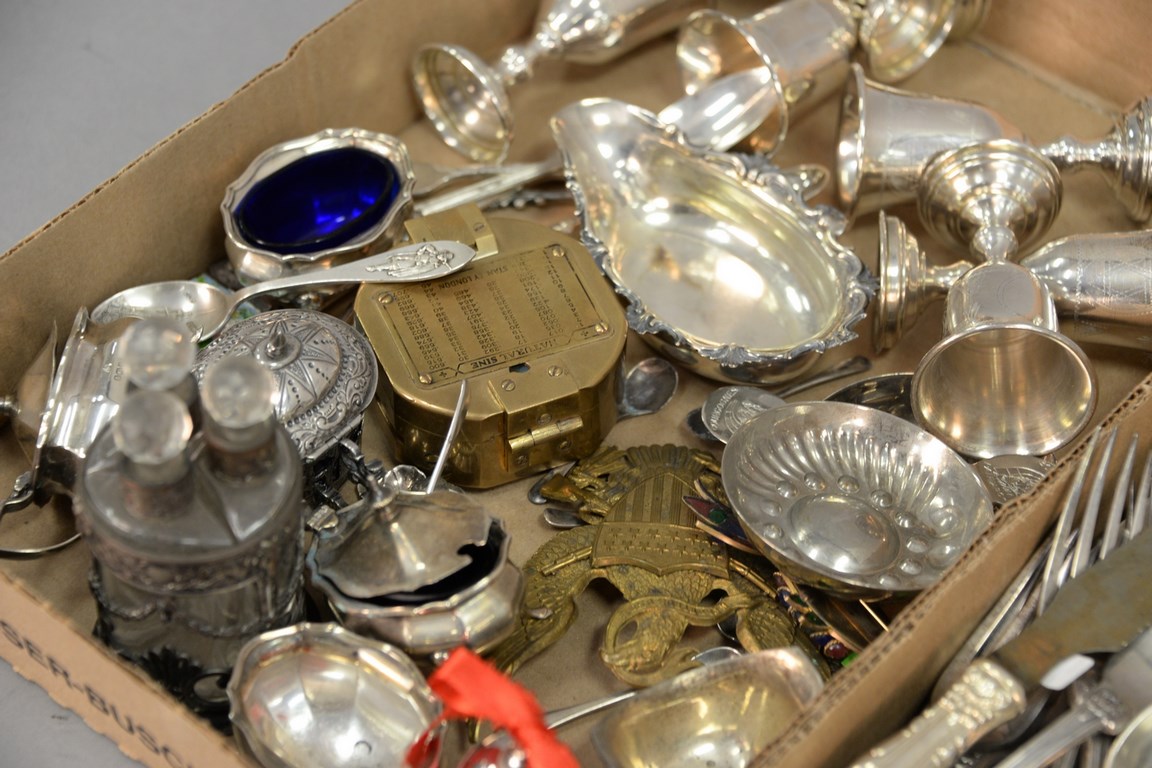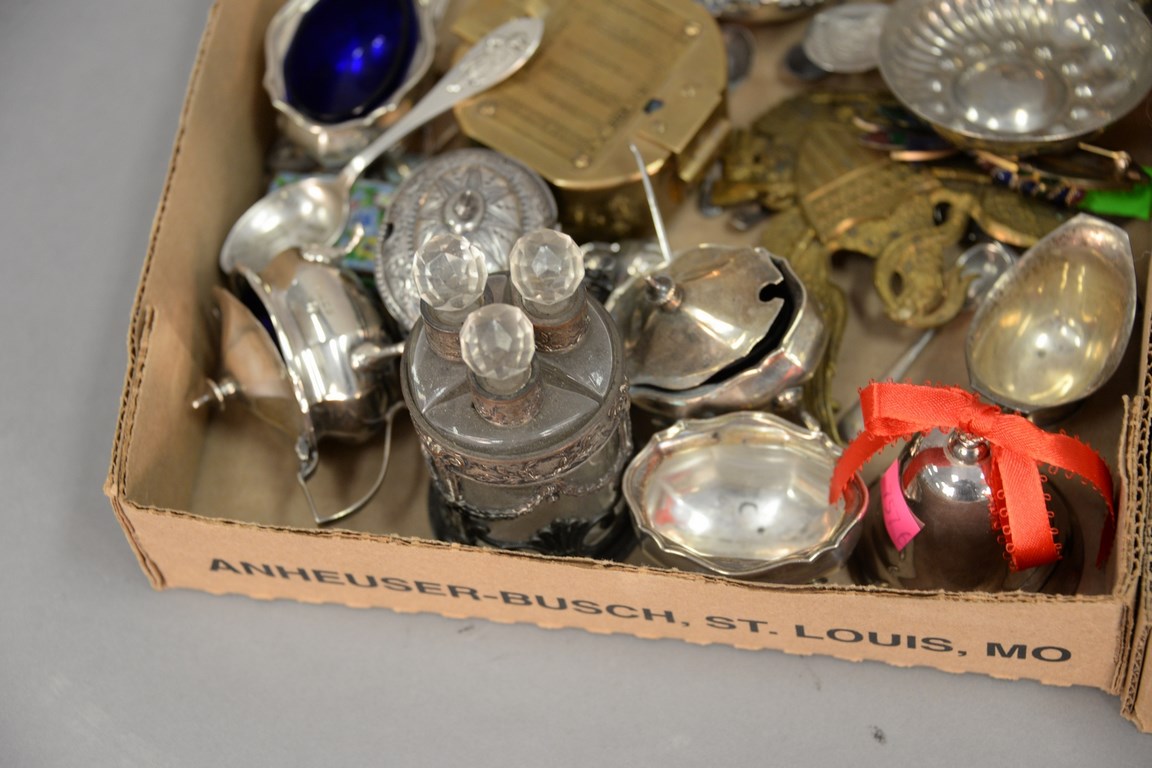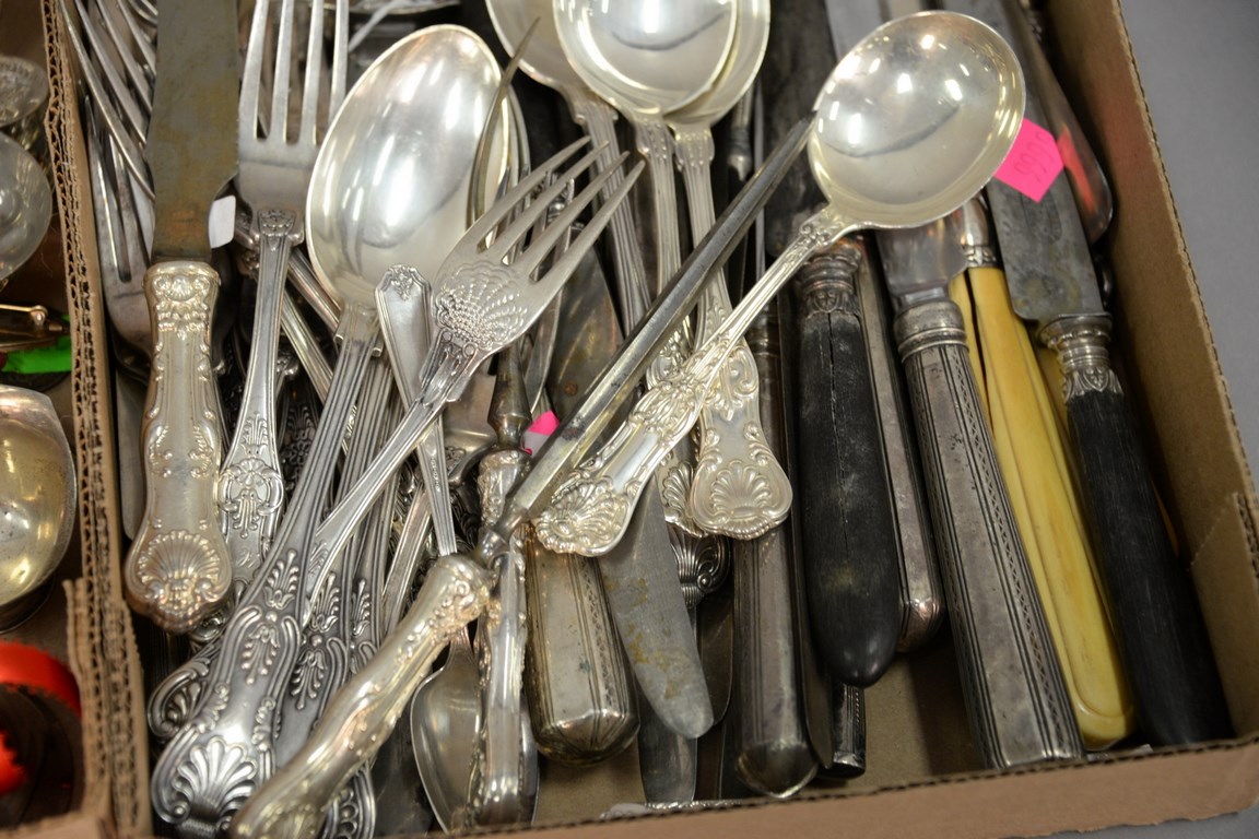 Two box lots including flatware, silverplate, compass, enameled box, etc.