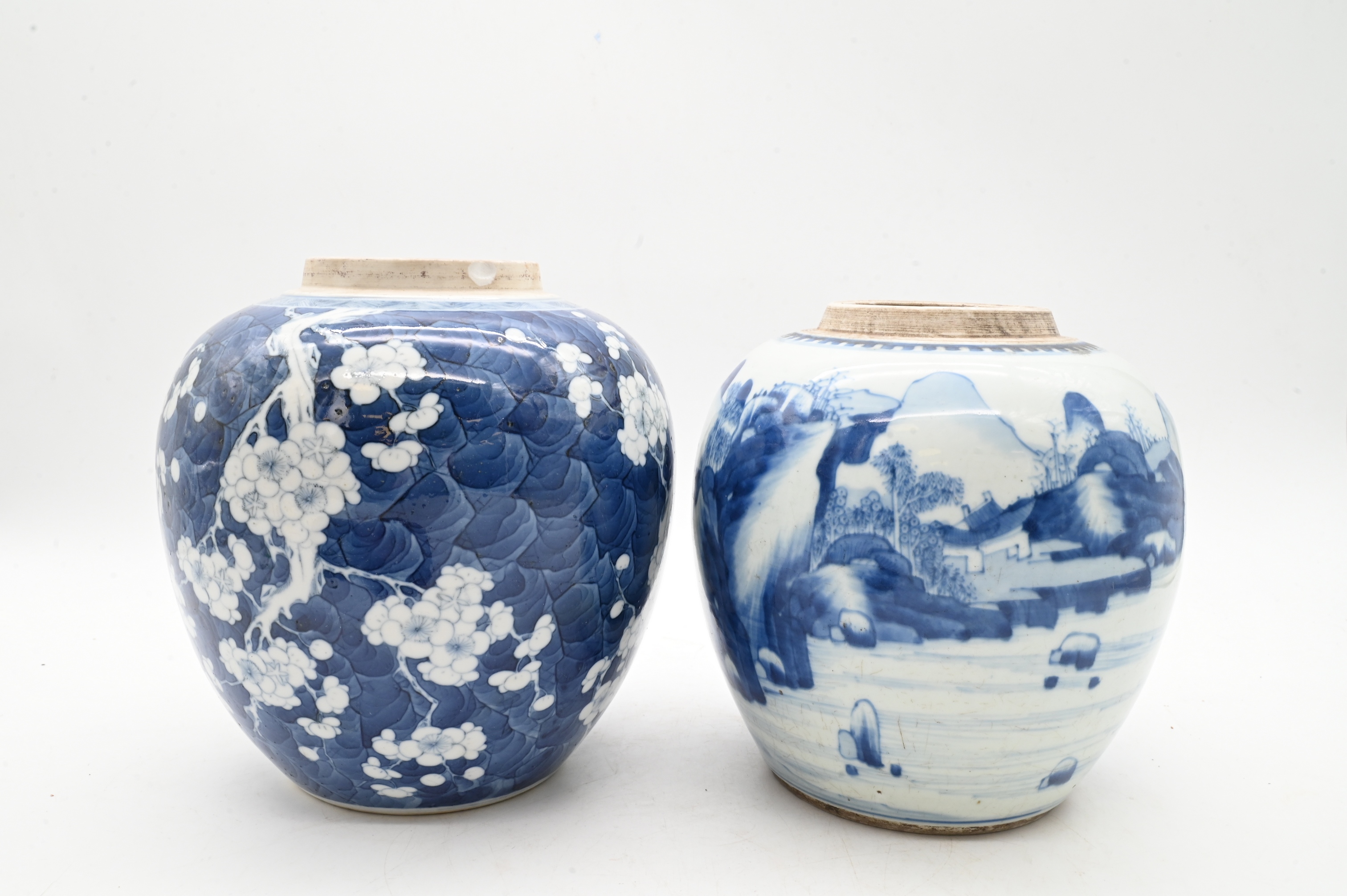 one decorated in cherry blossom floral branches, height 9 1/2 inches, the other having mountainous landscape motif, height 8 1/2 inches, both having carved wooden lids, circa 19th century
