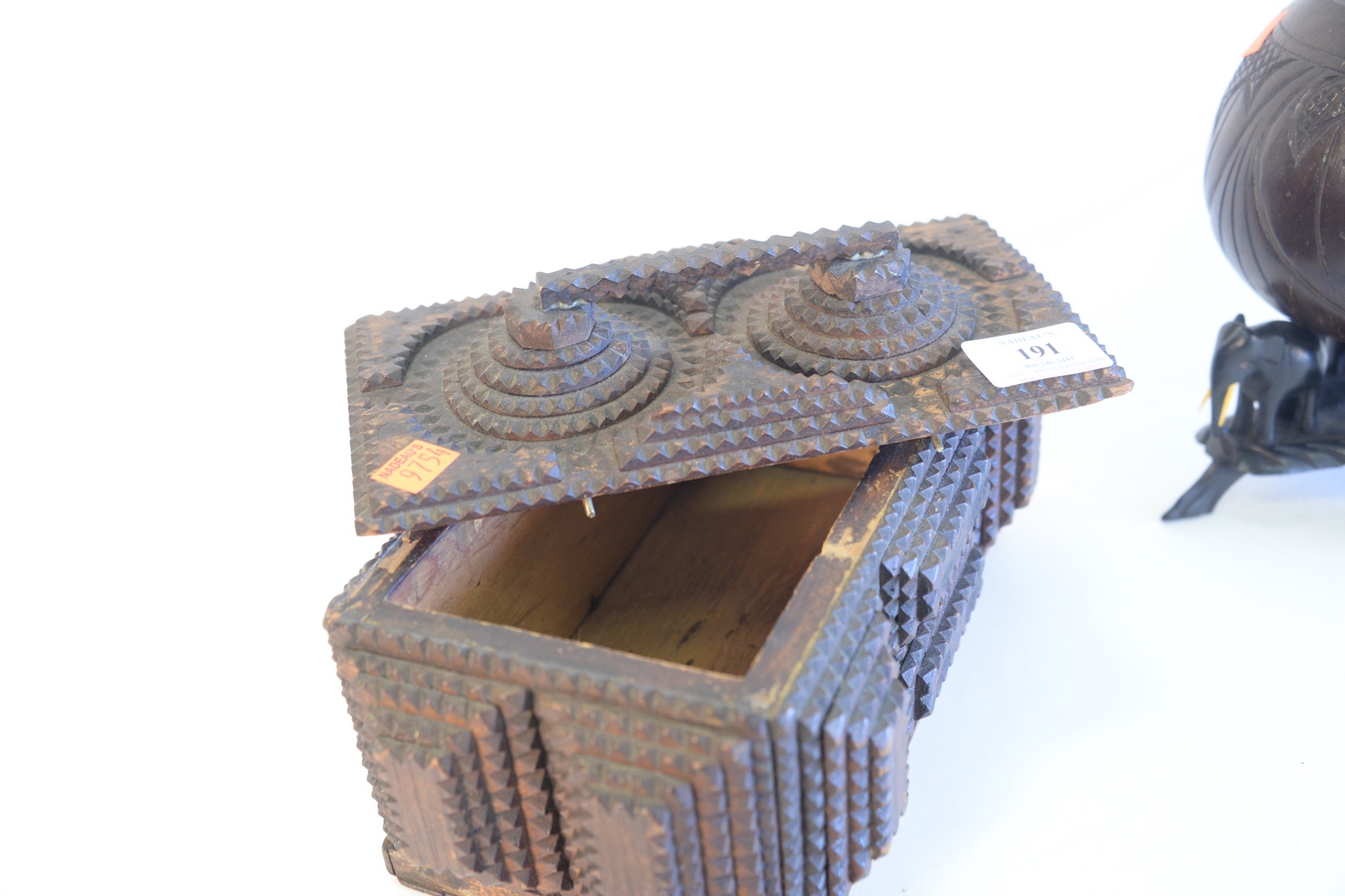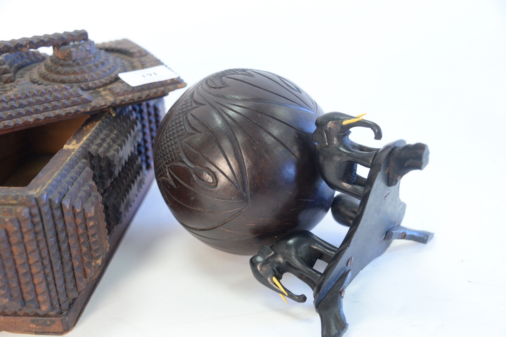 Lot 191: Two piece lot to include a tramp art lidded box with handle, height 5-1/2 inches, along with a Burmese carved coconut bowl with carv…