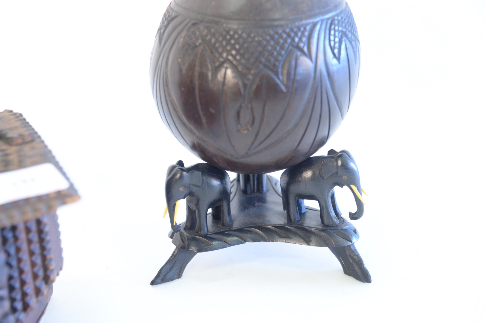 Two piece lot to include a tramp art lidded box with handle, height 5-1/2 inches, along with a Burmese carved coconut bowl with carved elephant feet, height 7-1/4 inches.