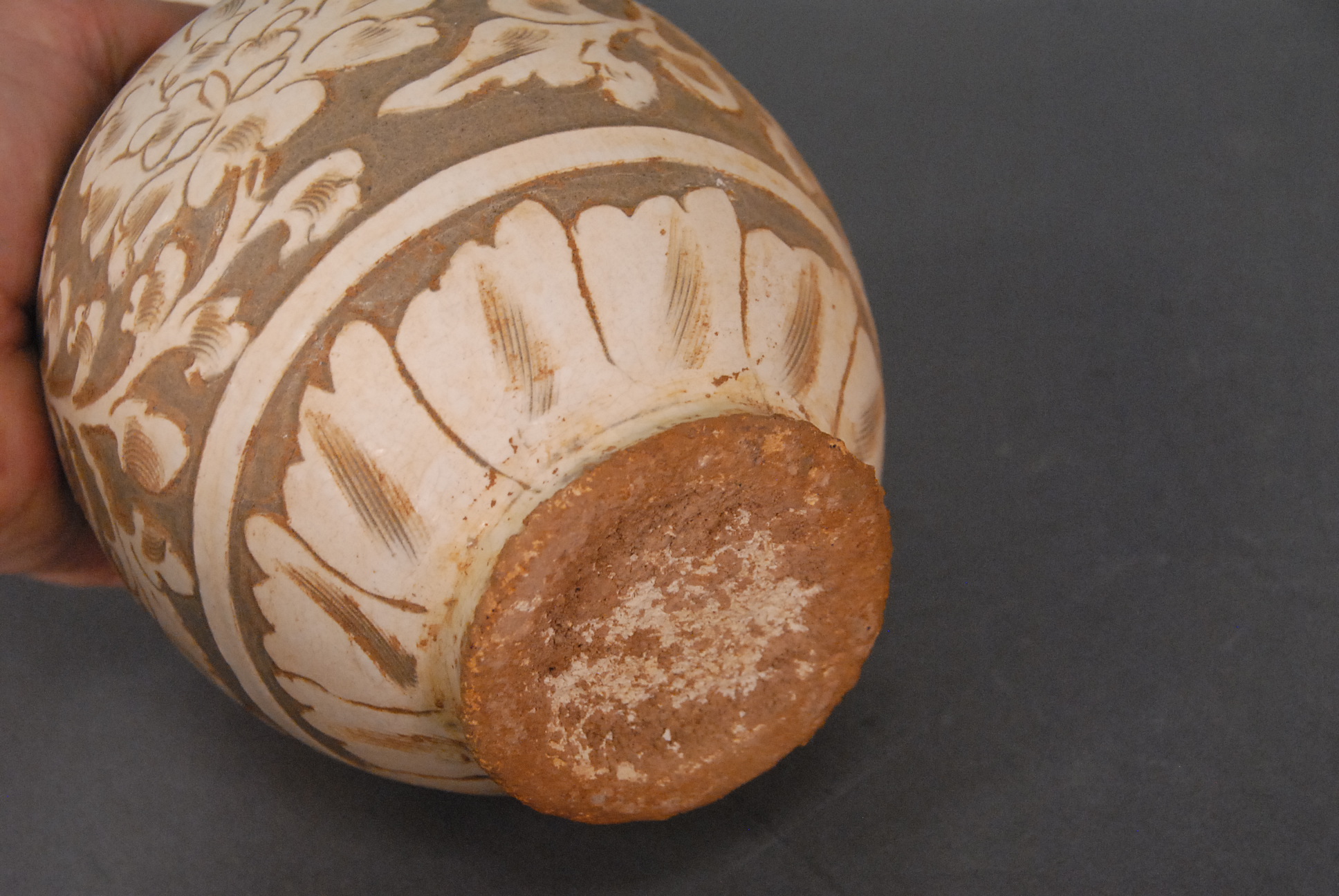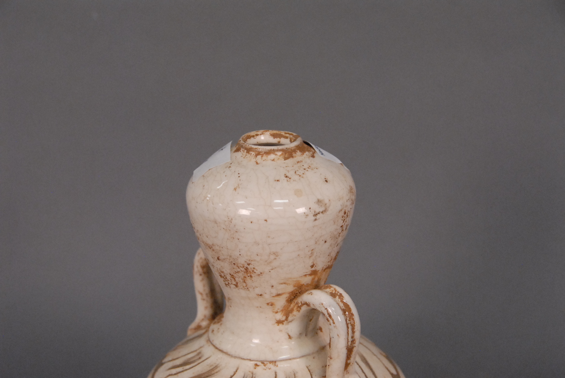 Lot 191: White and gray glazed double gourd vase with molded handles, scrolling vine with lotus design, ht. 11in.