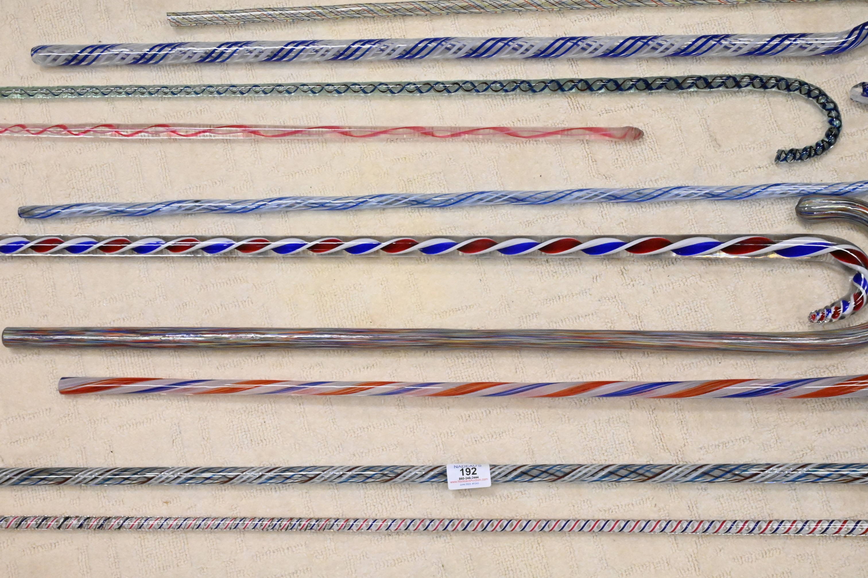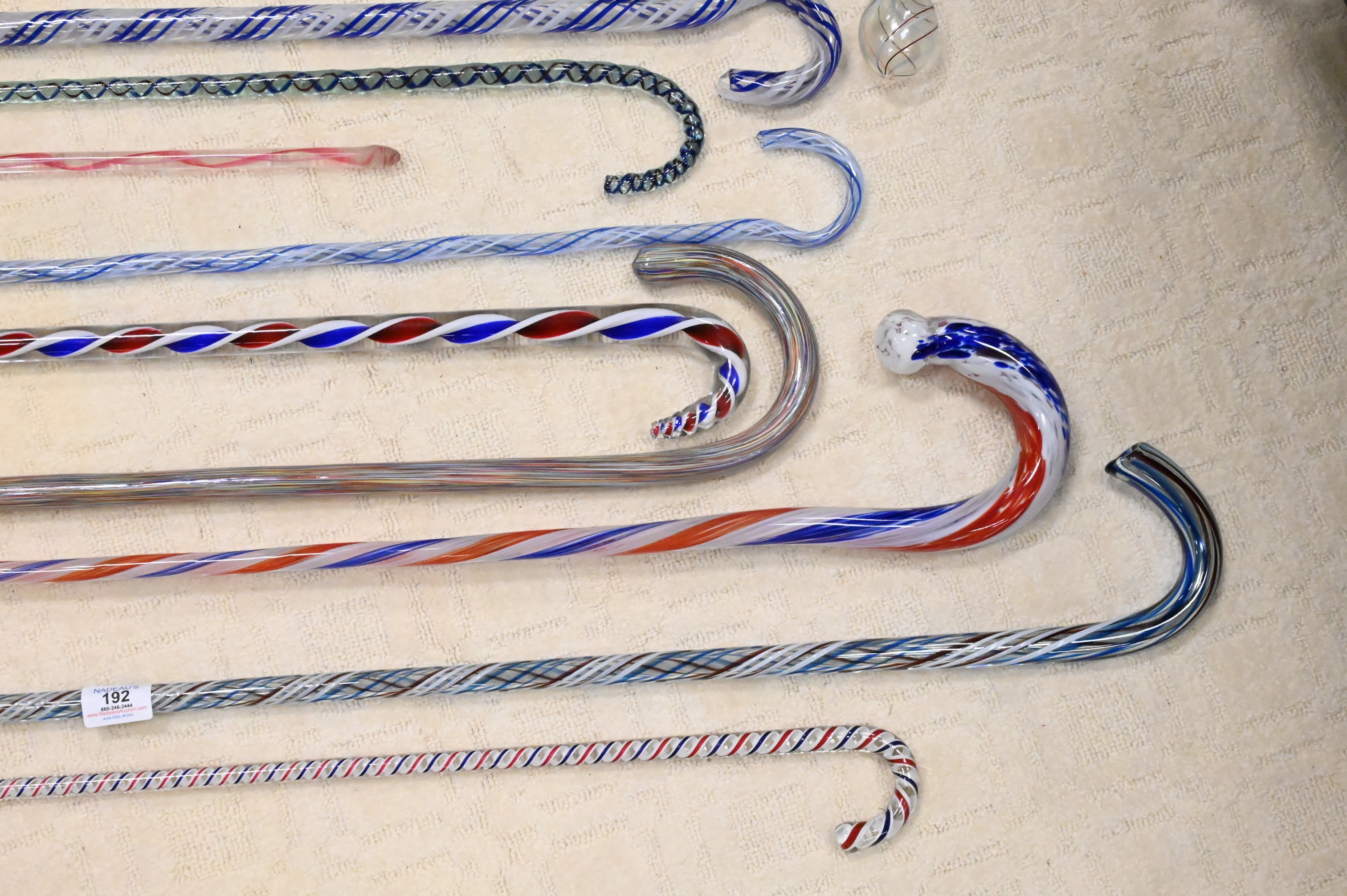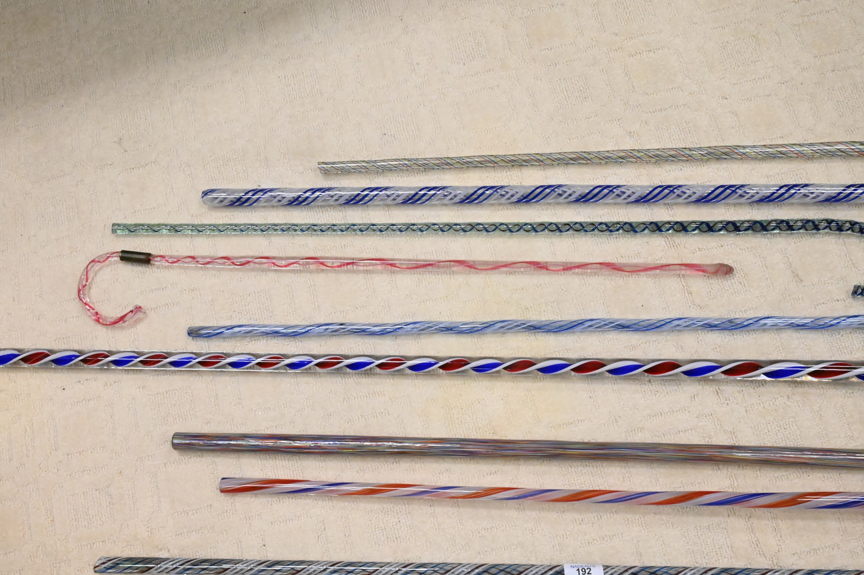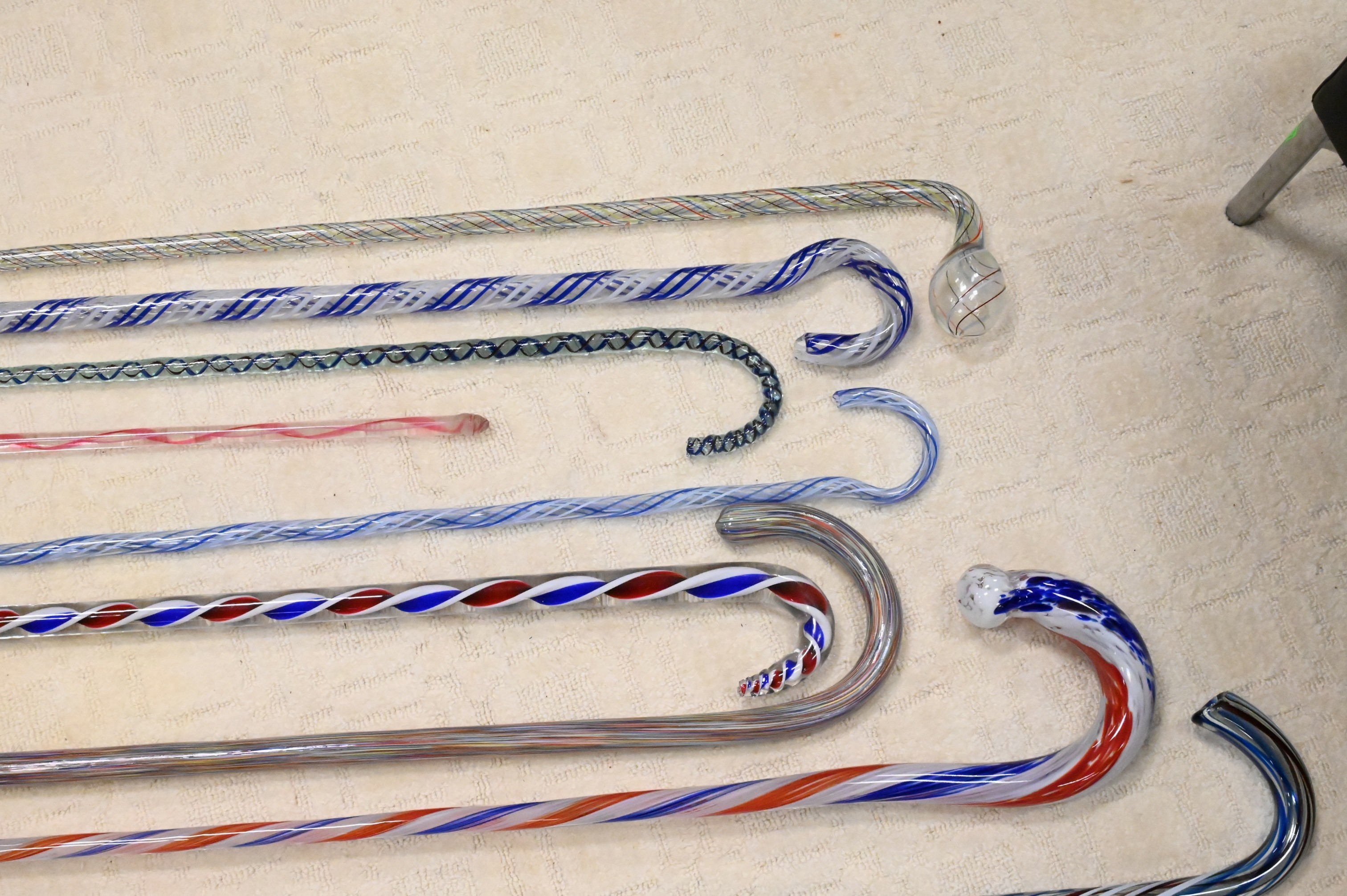 10 Glass Crook Top Canes, several with art designs, sizes range from 29 inches – 46 inches, Provenance: A Private Connecticut Shoreline Collection
