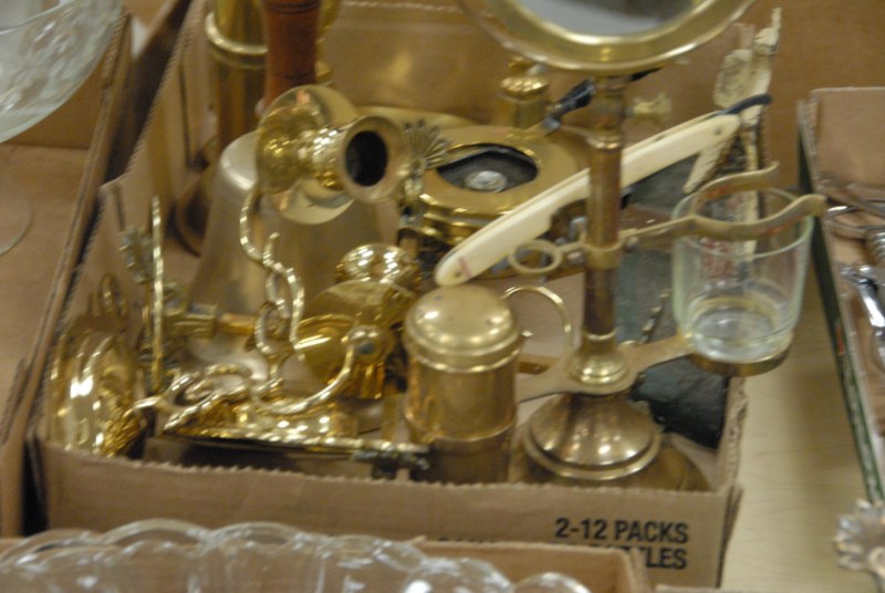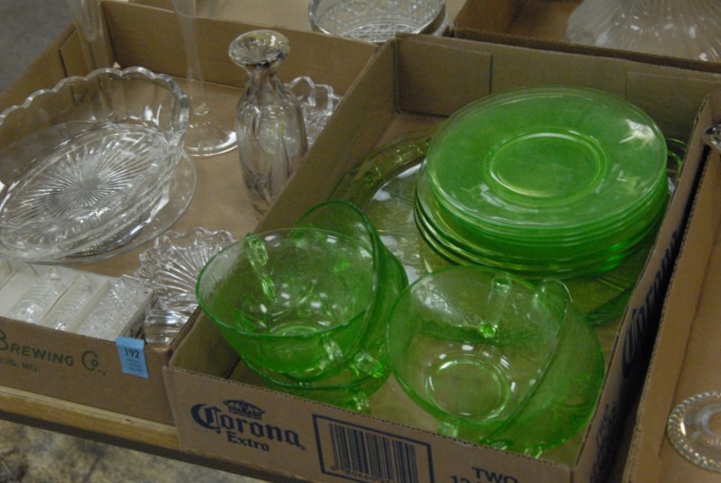 9 box lots to include green depression glass, various press glass, chimneys, glass shaving mirror, silver plated flatware, candlesticks