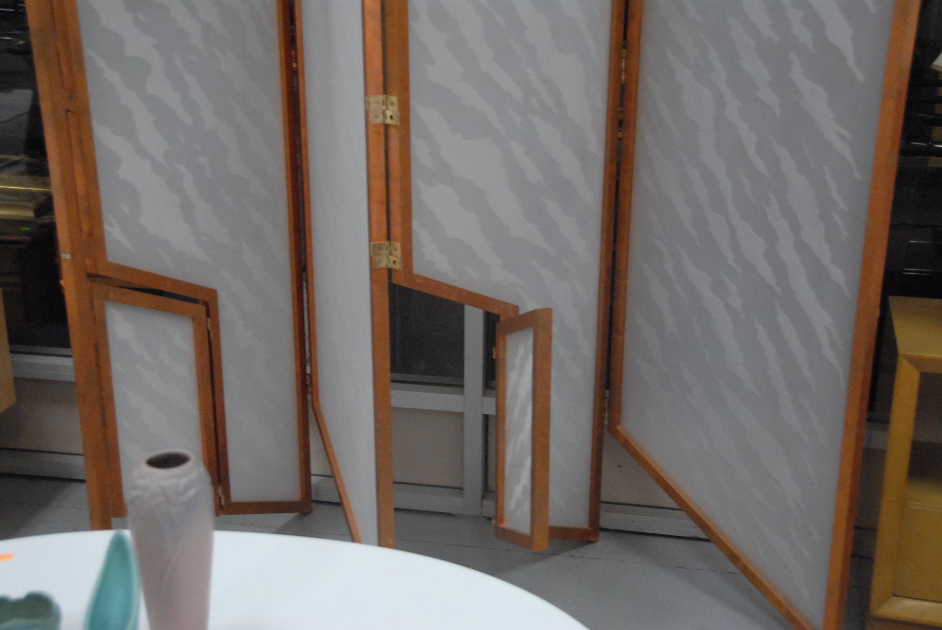 Lot 192: Angular geometric screen with gilded copper frame and jagged four section folding screen with patterned translucent Mylar panels, ht…
