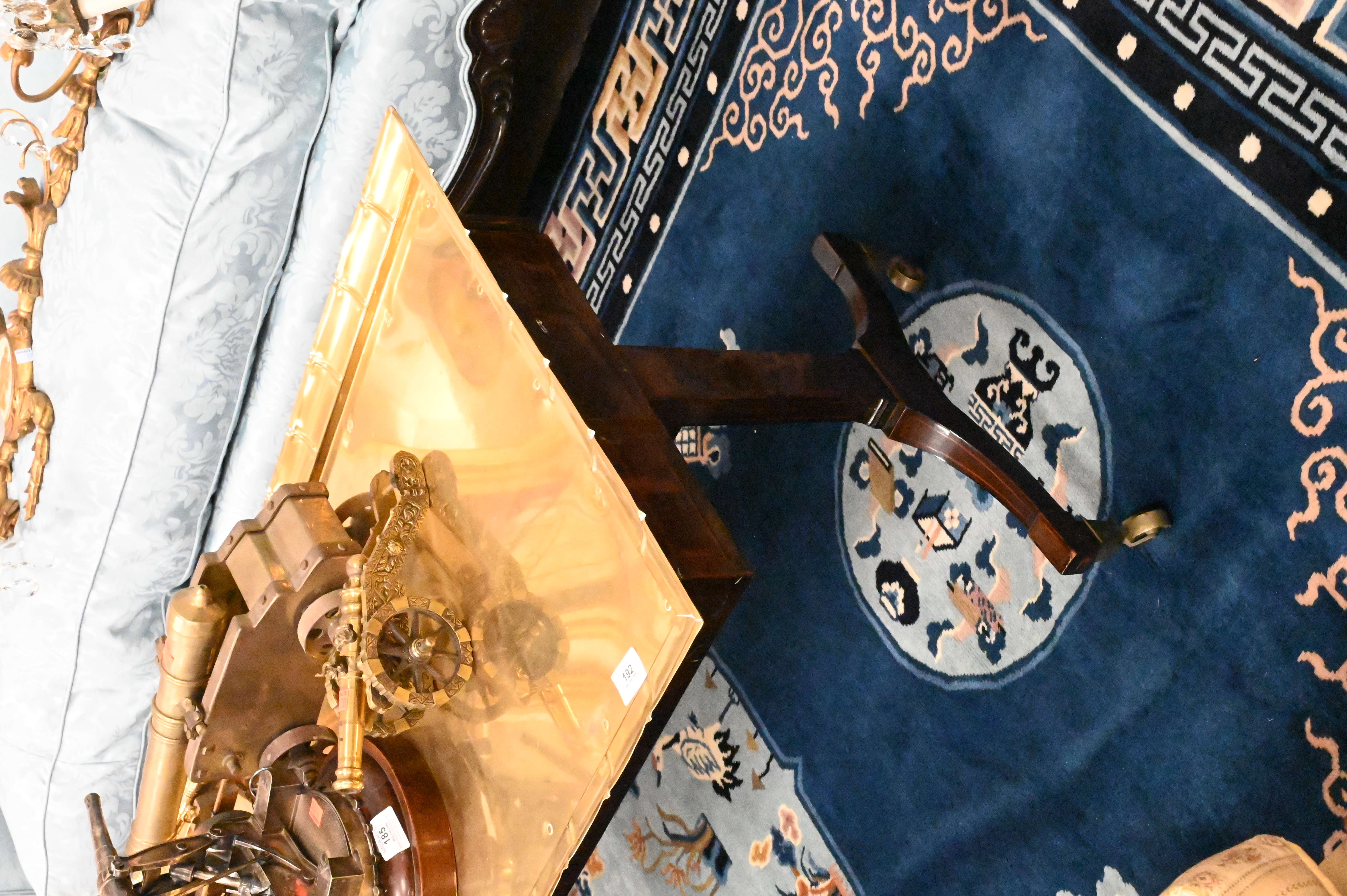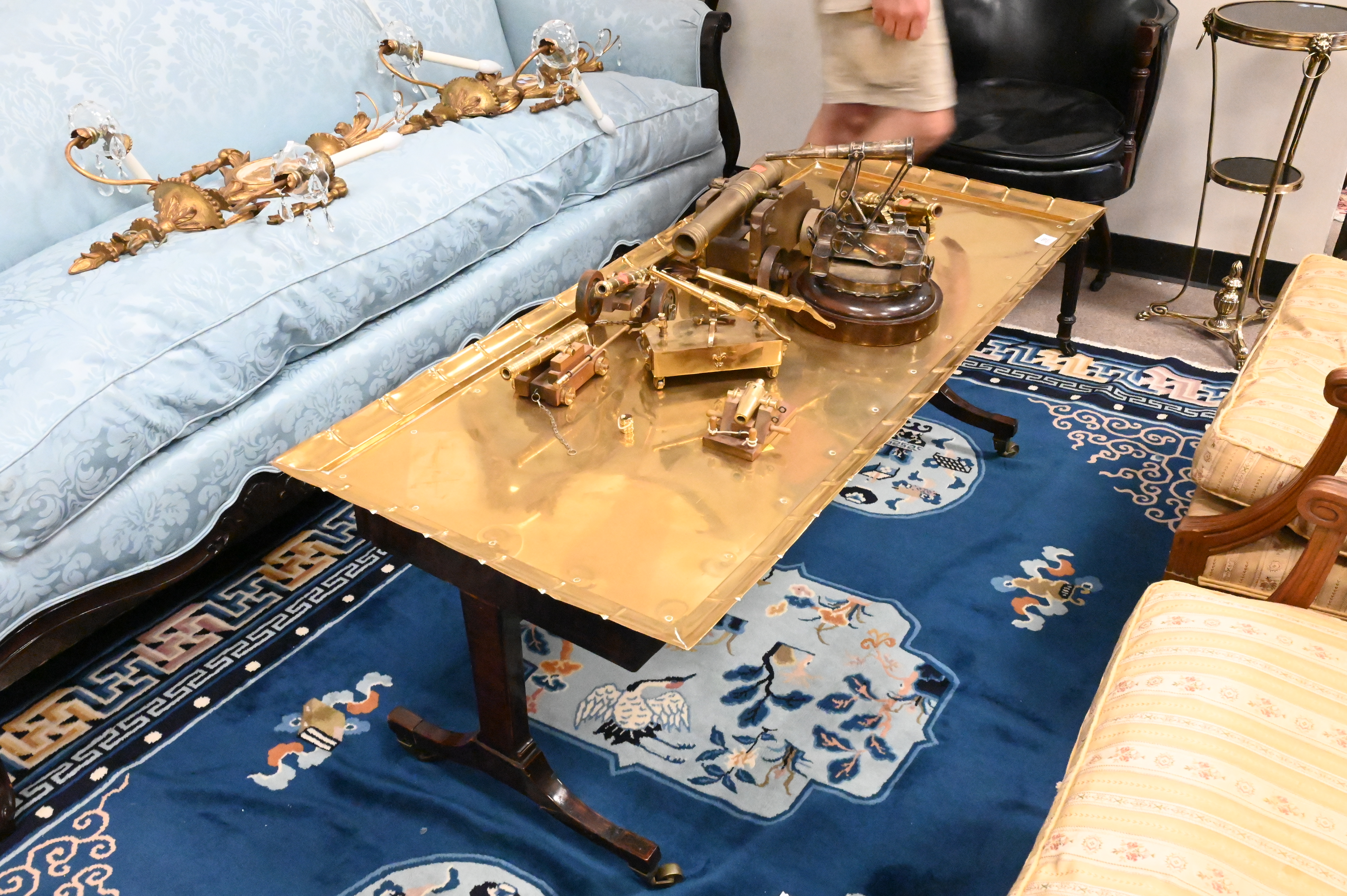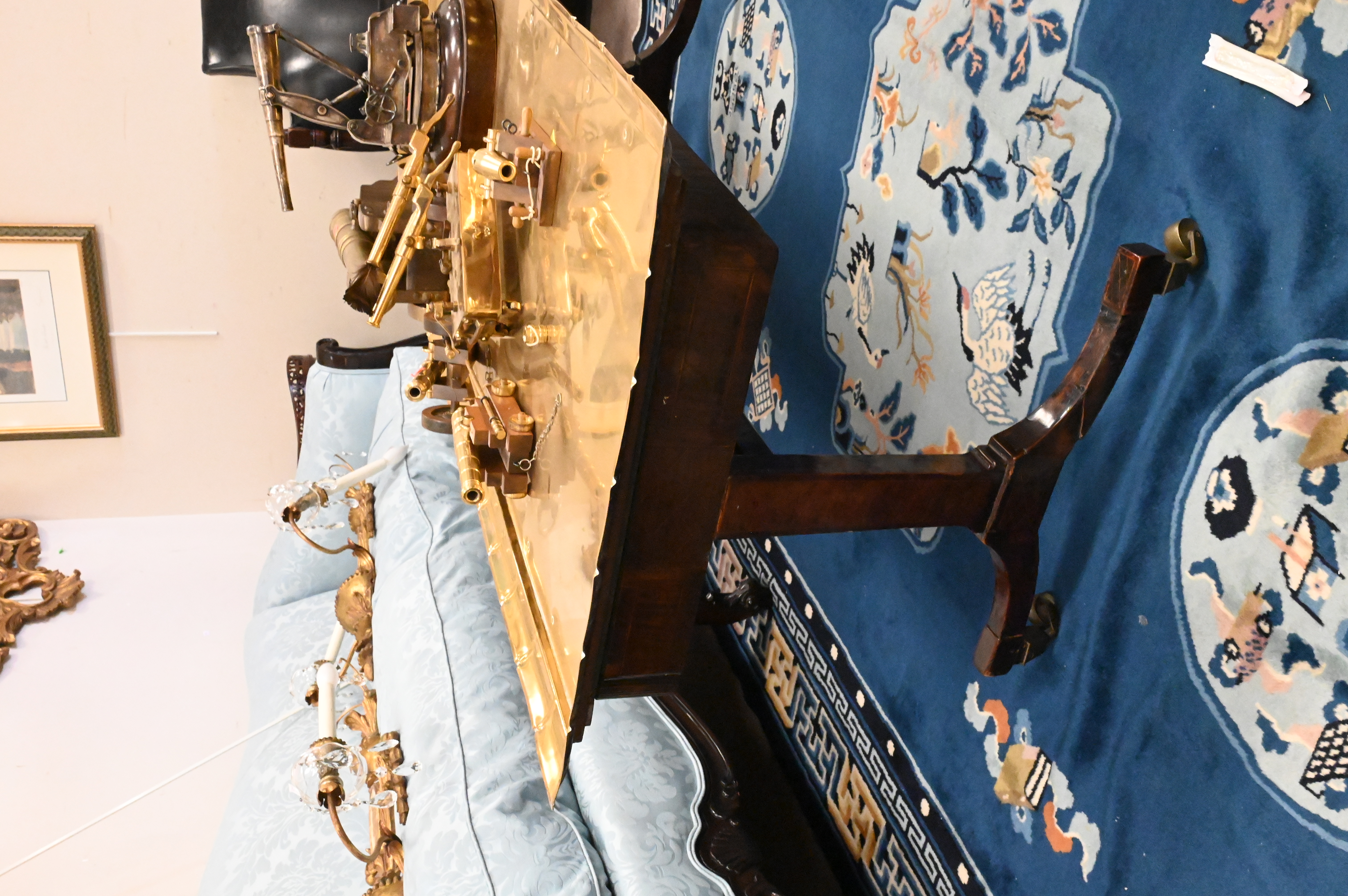 Brass Tray Top Coffee Table, on Regency inlaid base, height 20 inches, length 53 inches, top 23 x 52 1/2 inches.