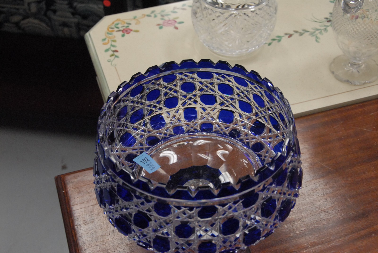 Crystal cobalt cut to clear bowl on square footed base, small chip in corner of foot