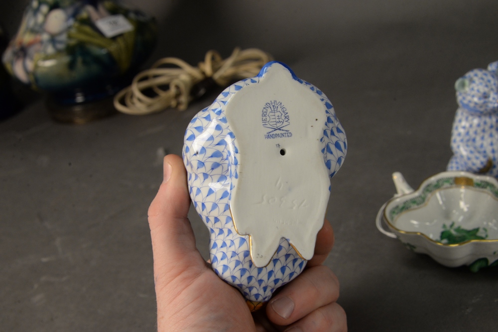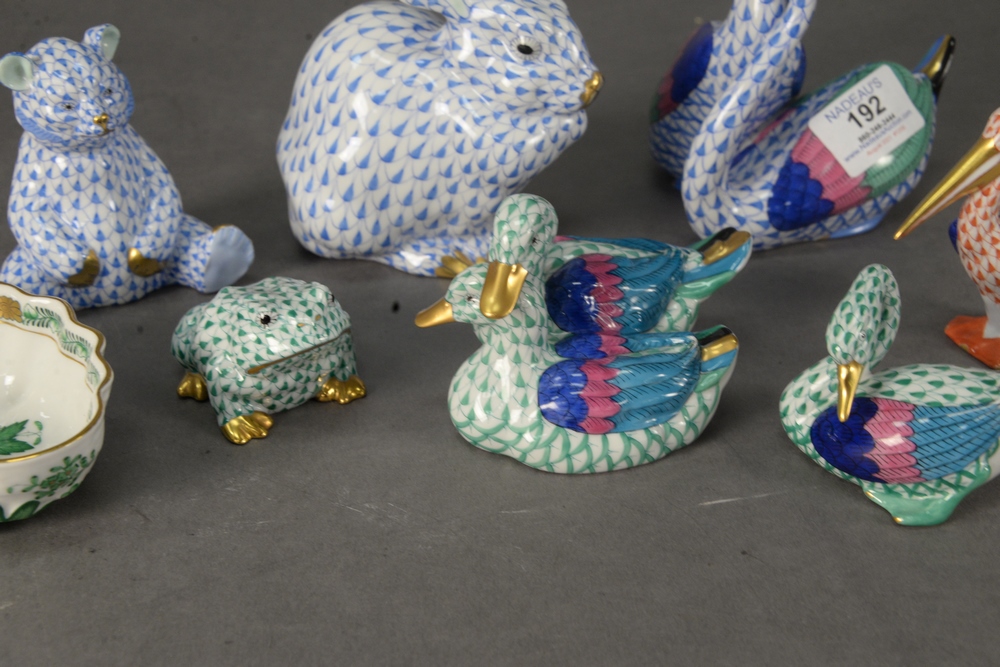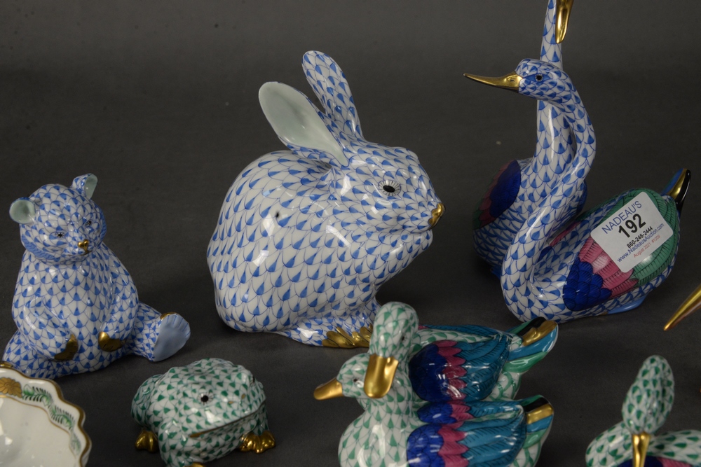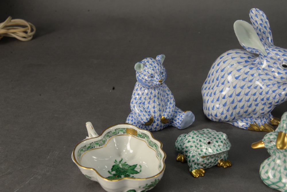 Eight Piece Herend Porcelain Lot, having fishnet bird figures to include blue double swan figure; a red pelican; a green swan; green double ducks each having multi colored wings, each marked to the underside, along with three fishnet animal figures to include a blue rabbit, blue bear cub, and a green frog, each with gilt detailing; along with Herend leaf shape open sugar in Chinese bouquet green, tallest height 7 1/2 inches, rabbit height 5 1/4 inches.
