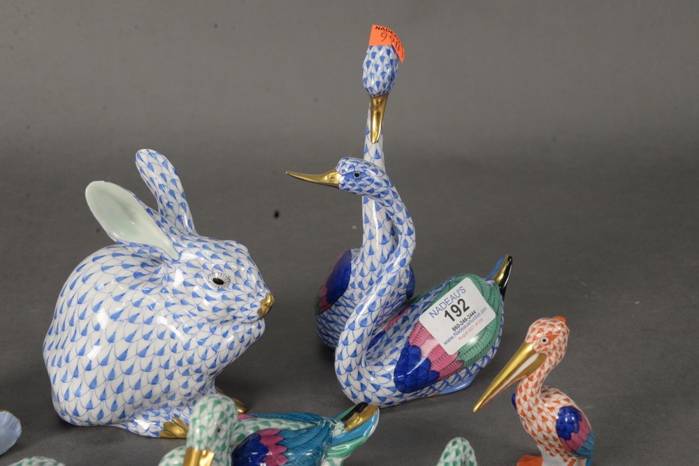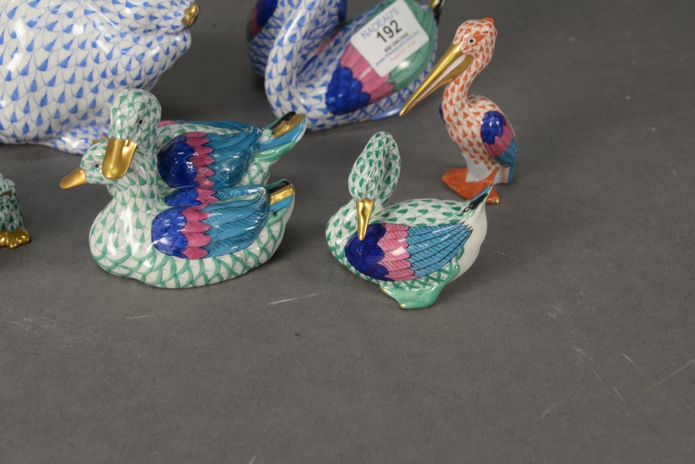 Lot 192: Eight Piece Herend Porcelain Lot, having fishnet bird figures to include blue double swan figure; a red pelican; a green swan; green…