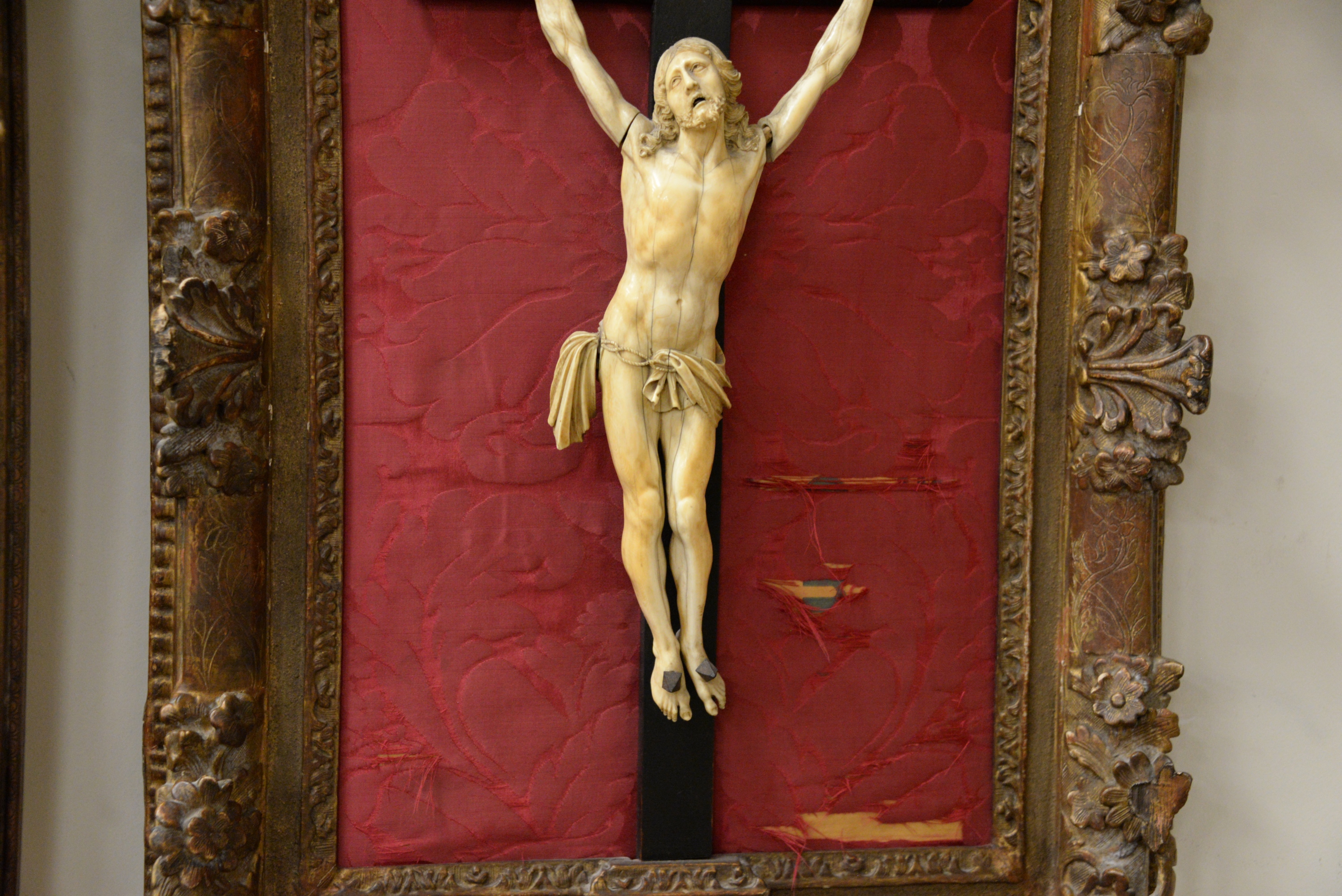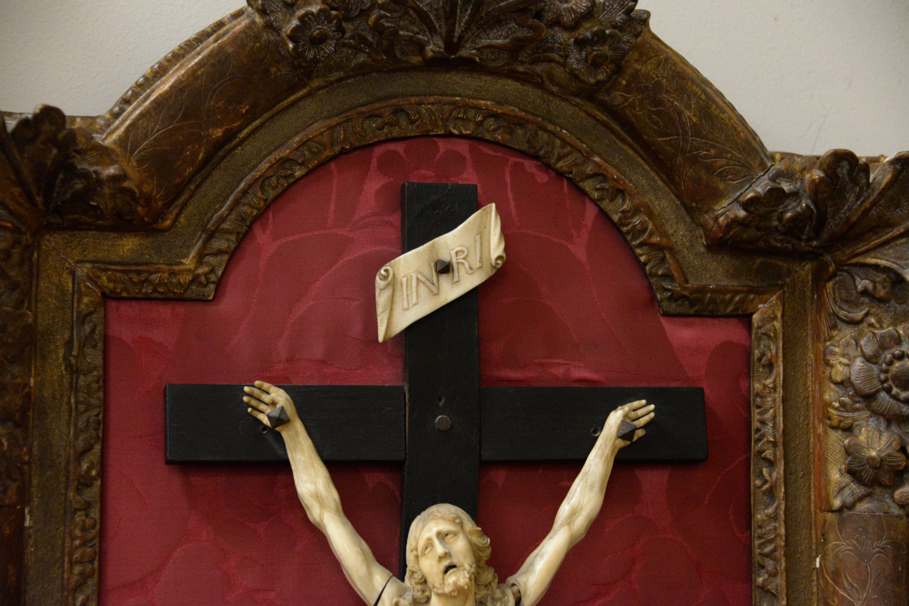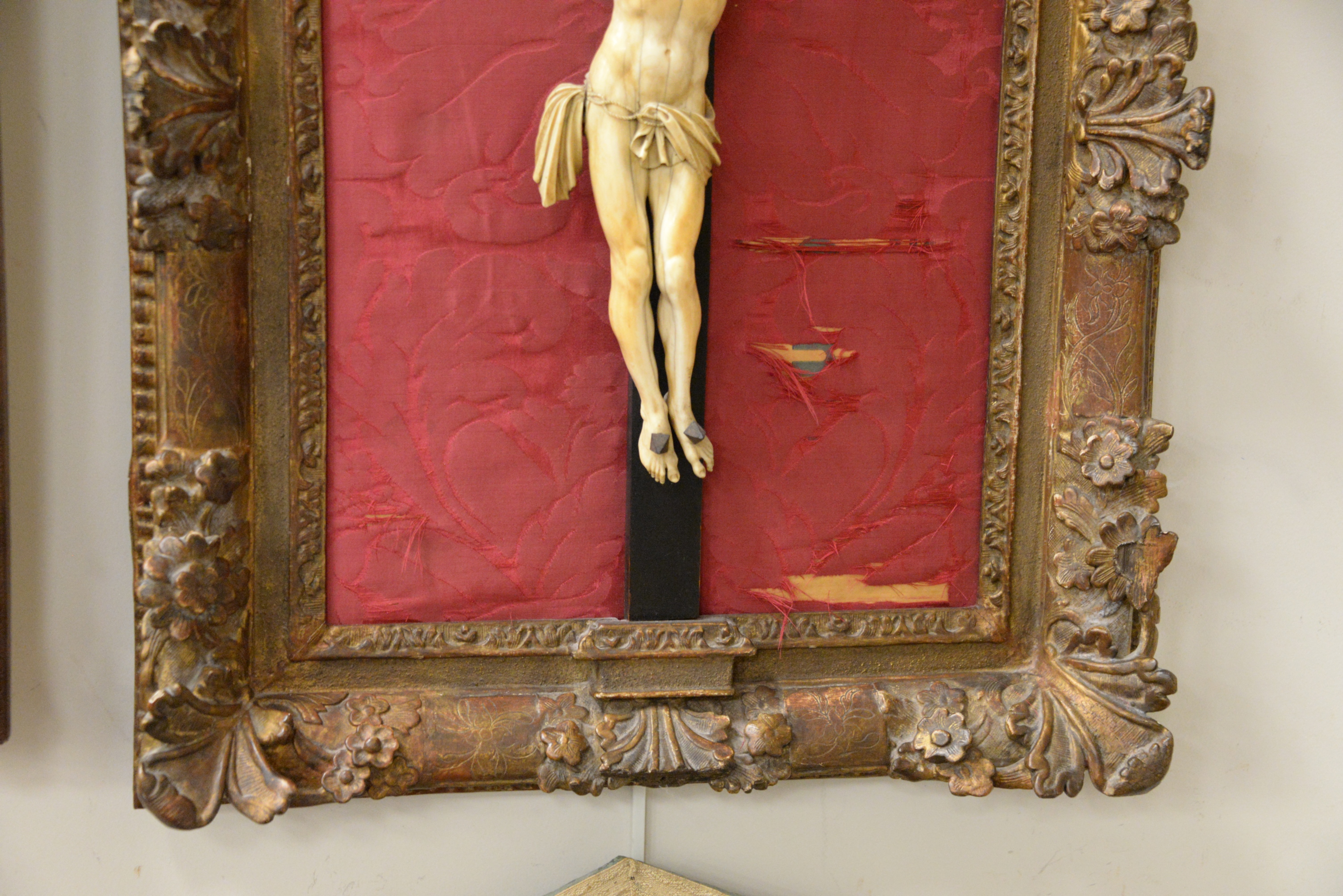 Figure of the Crucifixion, French or Flemish, late 17th century, within a giltwood Louis XV frame, height of Christ 15 inches, total height 29 inches, width 19 inches. Provenance: Sotheby’s New York, 23 -24 November 1984, lot 61. Please note: This item cannot be purchased or shipped by bidders residing outside of the United States or California, Hawaii, Nevada, New Jersey, New York, Washington, Oregon, or District of Columbia. If this is purchased by a bidder in one of the above mentioned locations or attempts to ship this item to one of the above mentioned locations, bidder will forfeit the item and be responsible for any incurred fees such as a restocking fee.