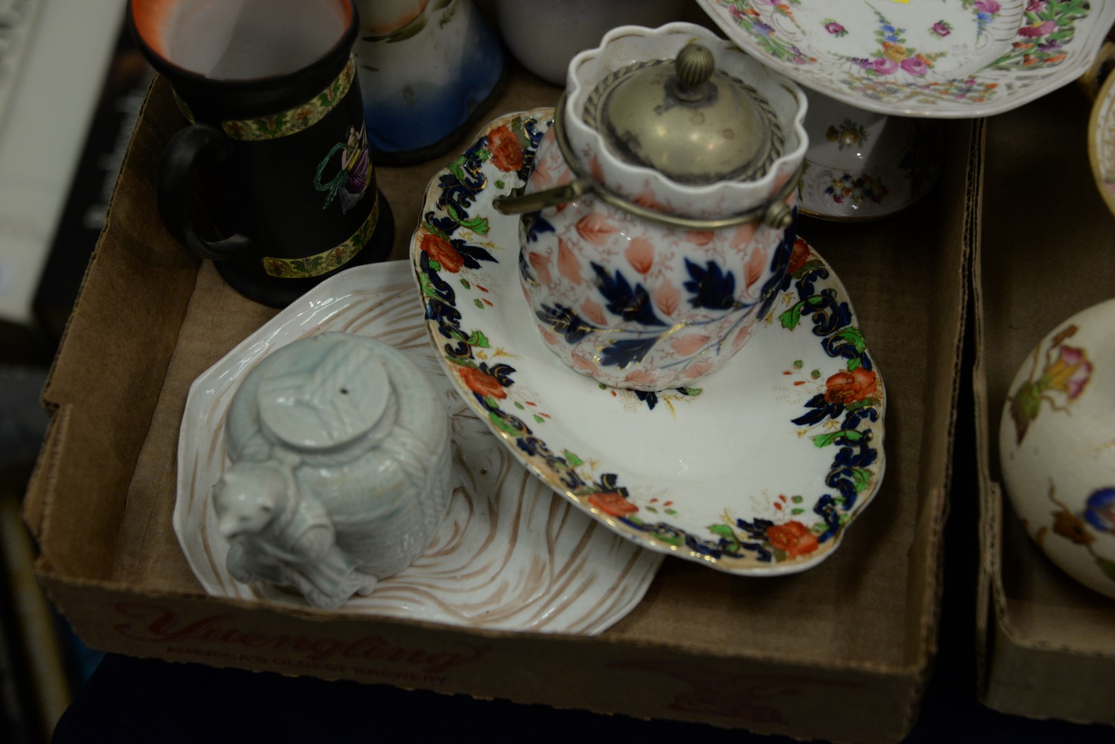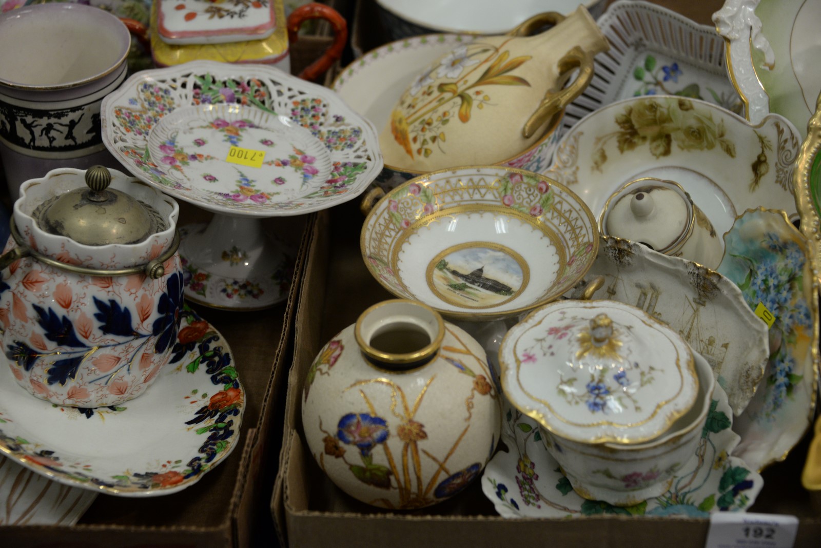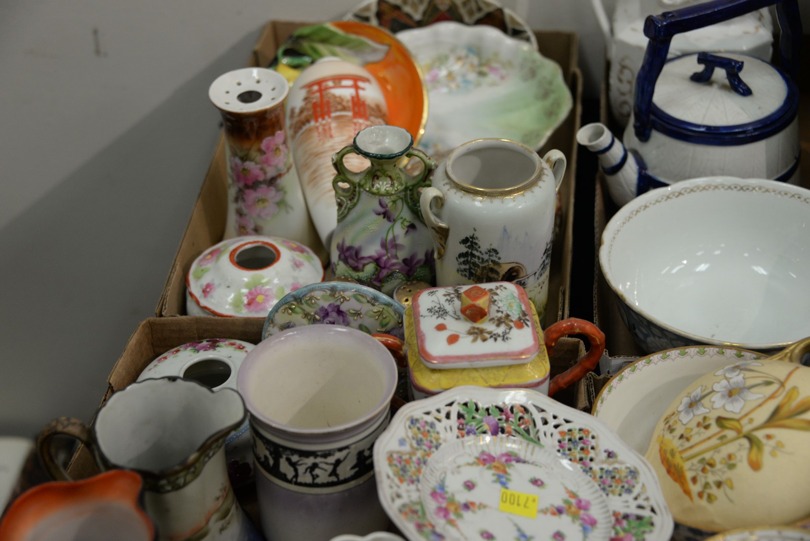 Lot 192: Four box lots of porcelain hat pin holders including Royal Bayreuth, Dresden, hand painted Nippon, Limoges, Wedgwood, etc.
