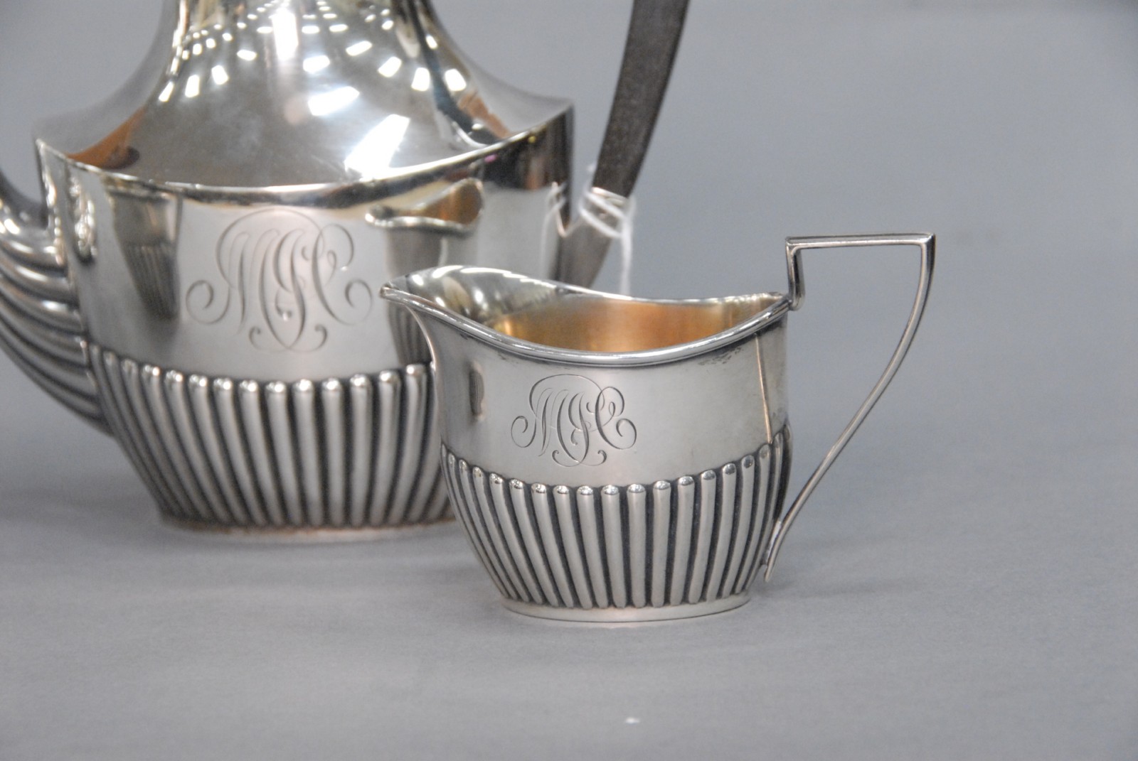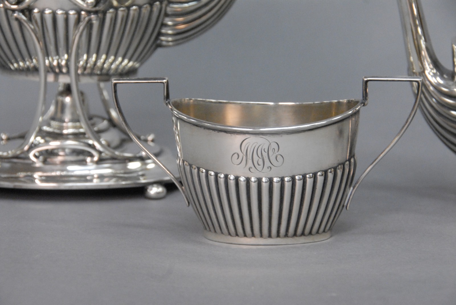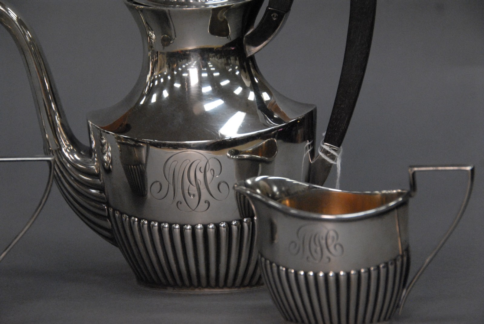 Gorham sterling silver four piece tea set with tilting pot and wood handles.