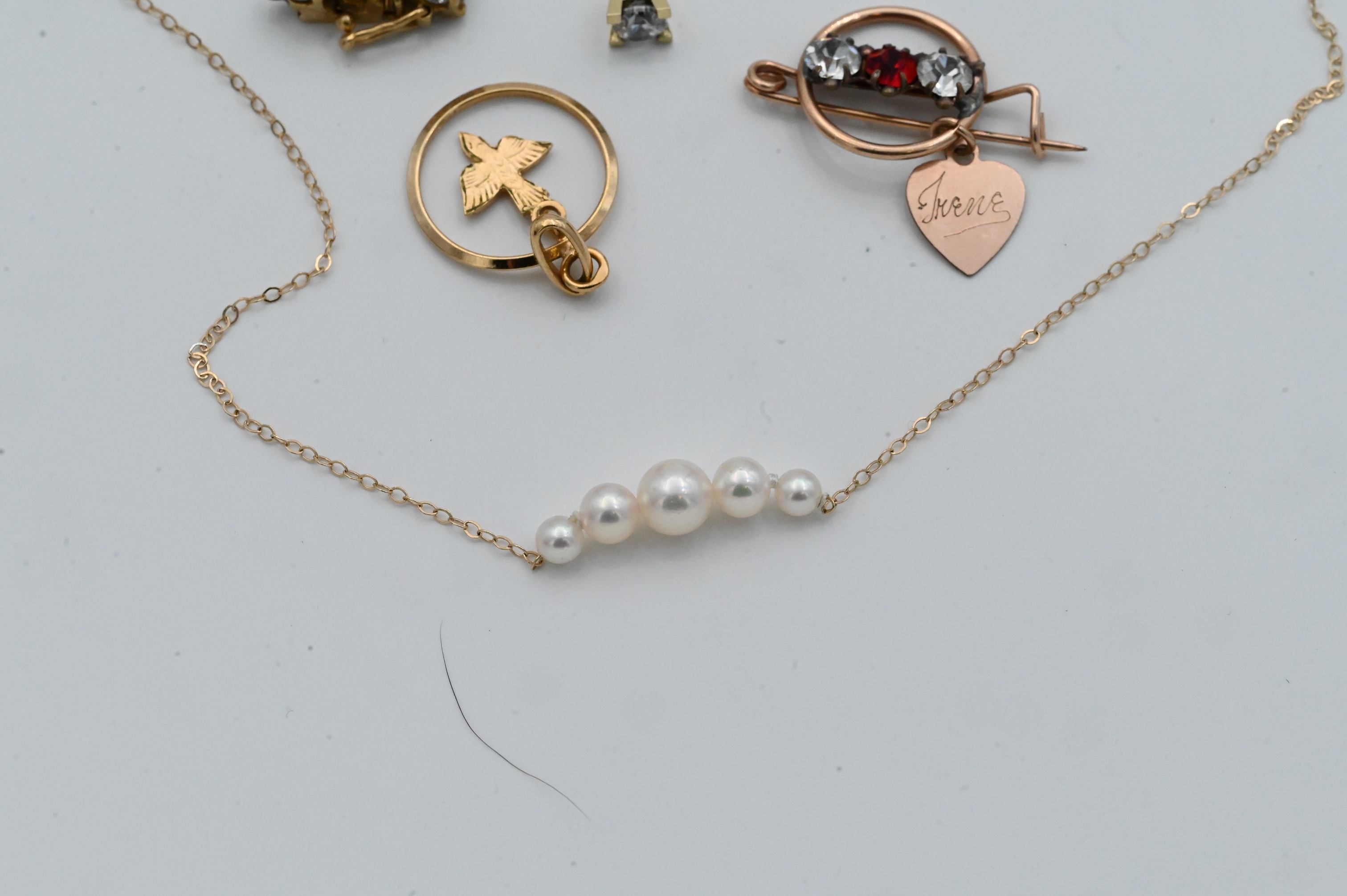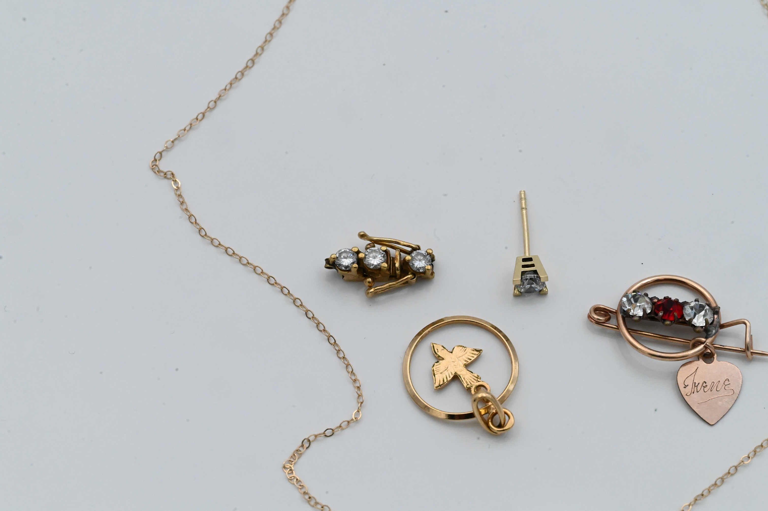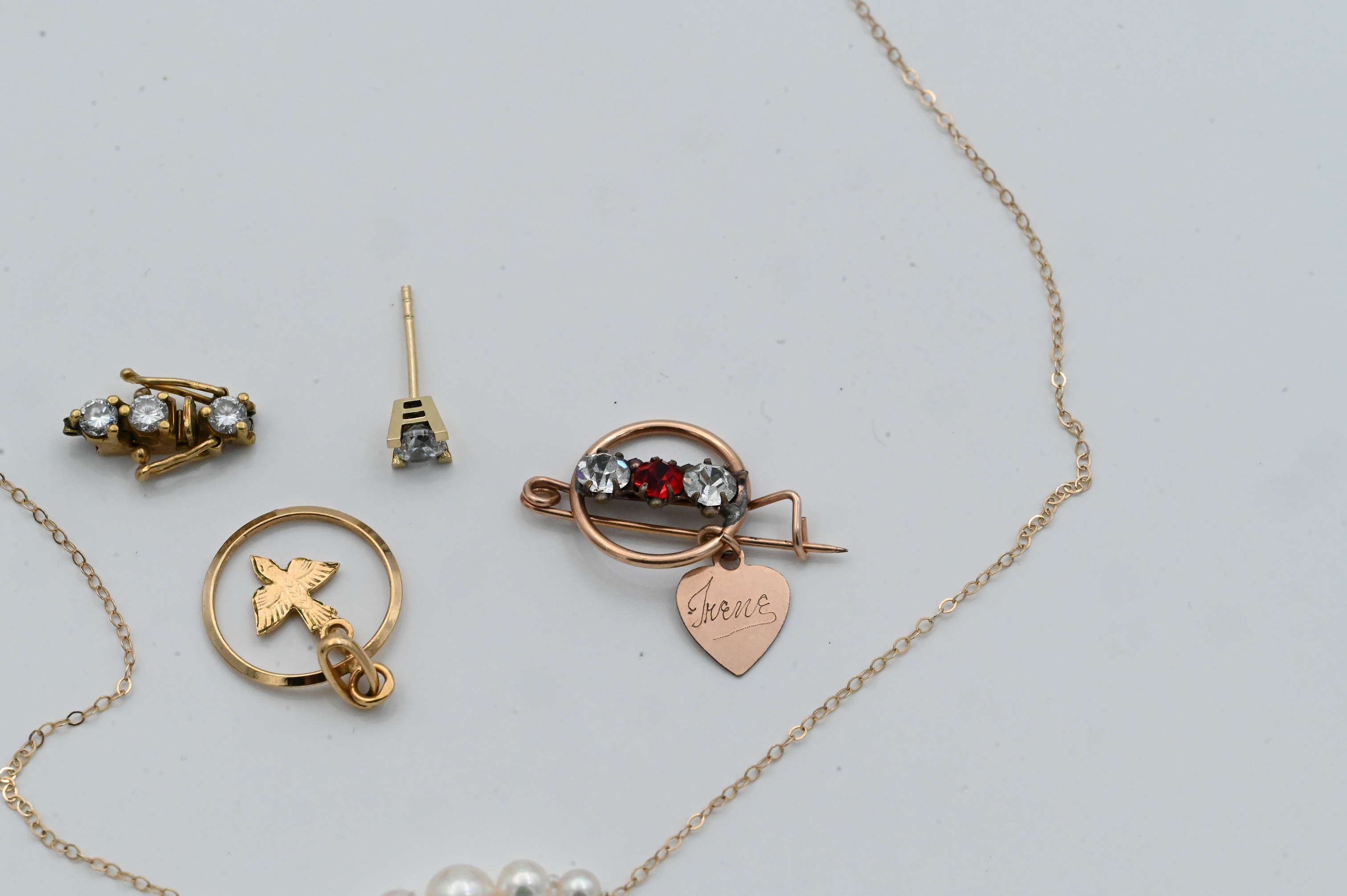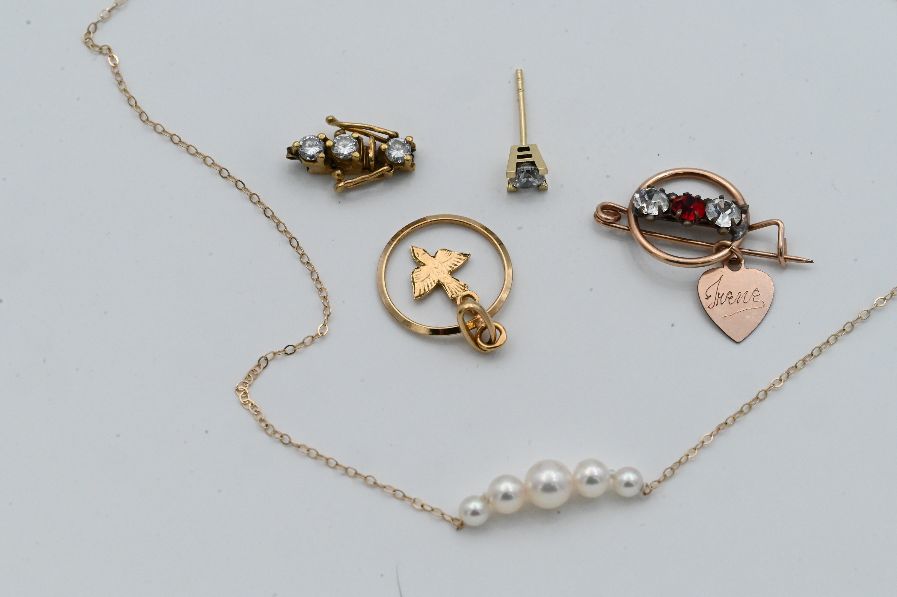 Including a 14K chain with cultured pearls, a 14K pendant with heart charm and synthetic stones, a 14K bird pendant, and a pair of 18K yellow gold and diamond clasp