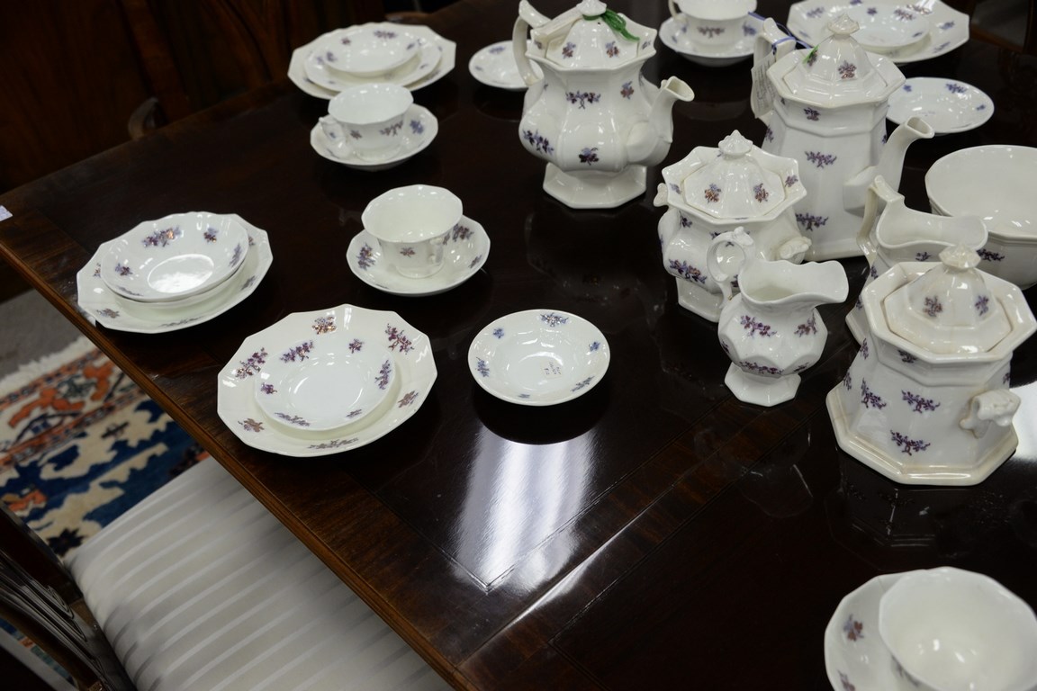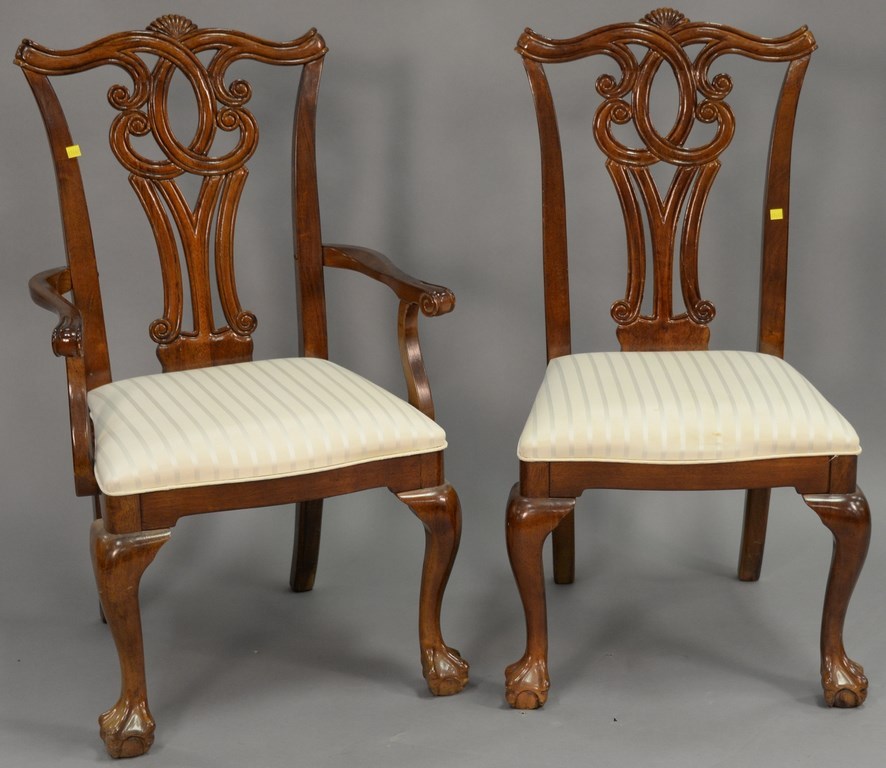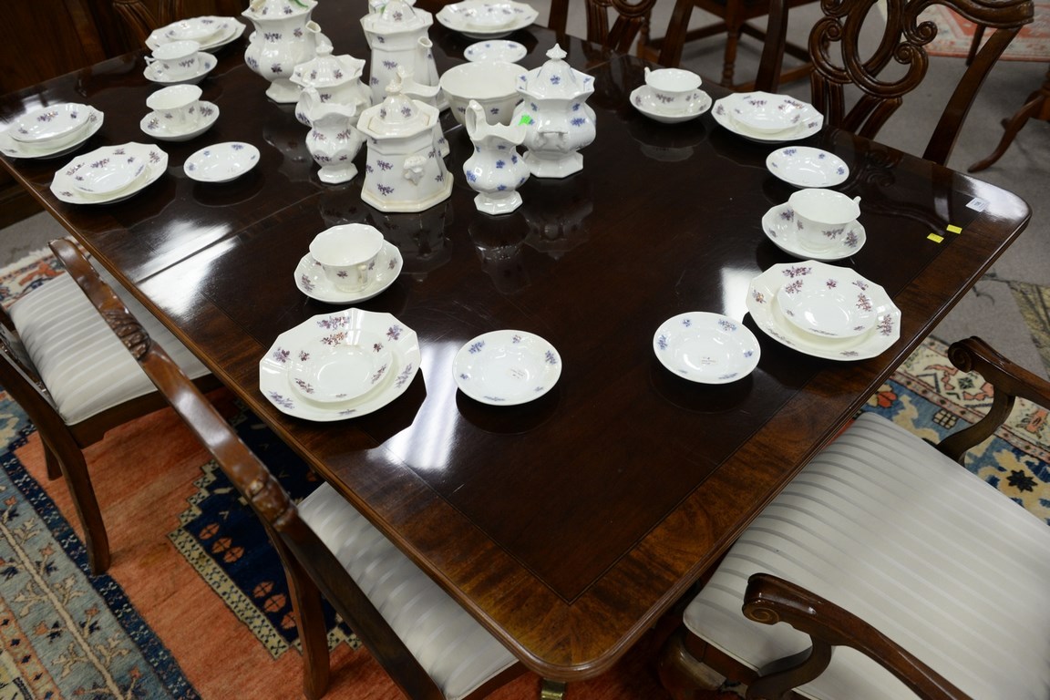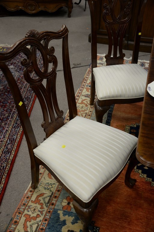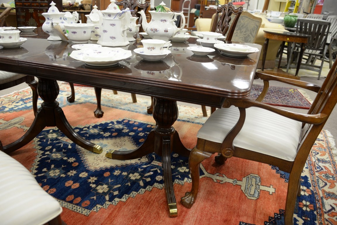 Lot 192: Mahogany double pedestal dining table with two leaves and six Chippendale style dining chairs. ht. 30 in. wd. 44 in. total lg. 68 in.