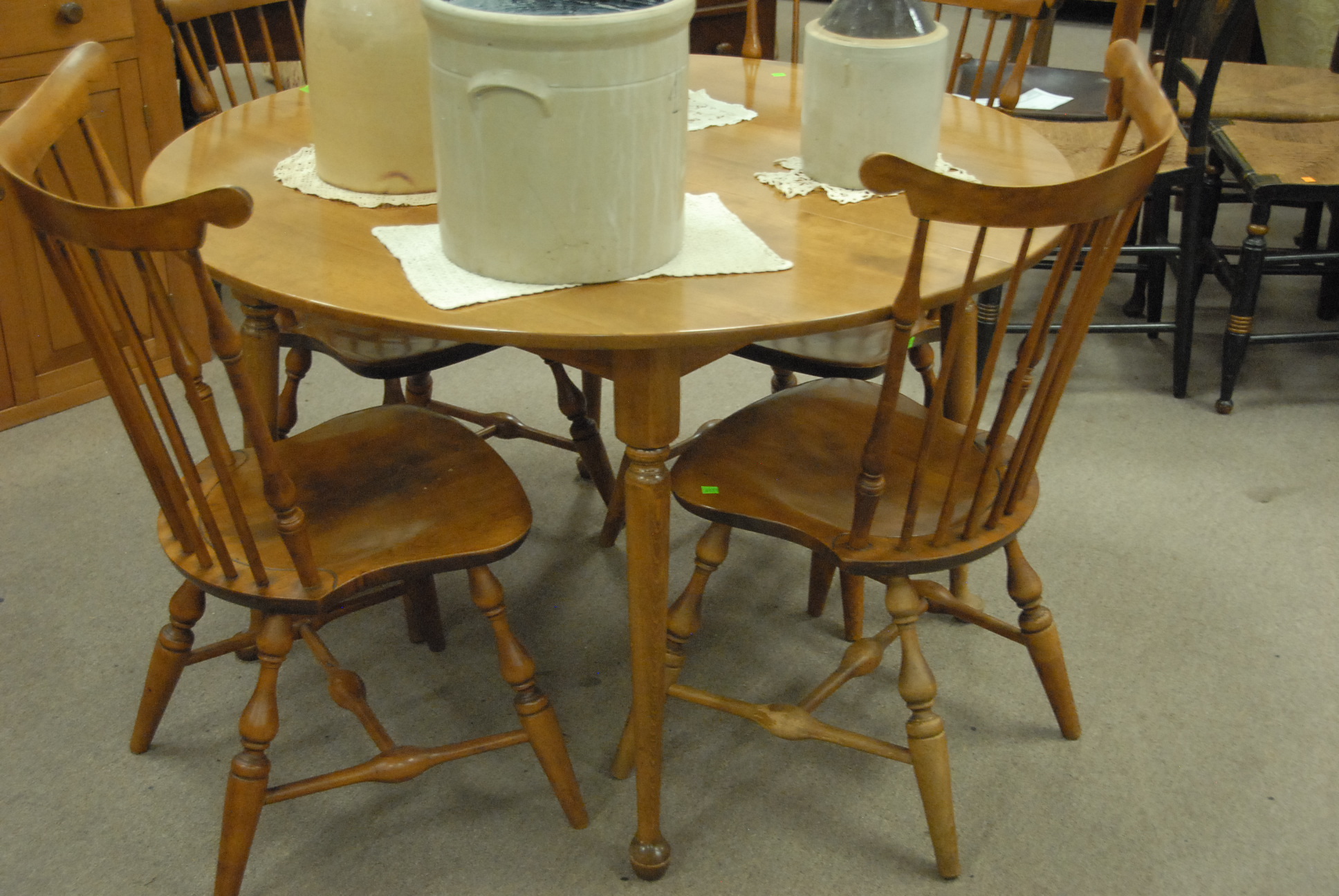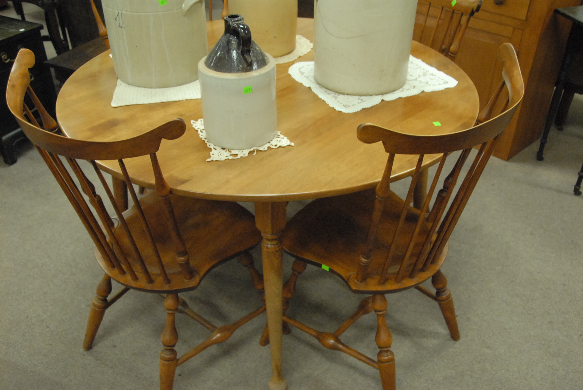 Maple five piece kitchen set to include table with two leaves and four Windsor side chairs.