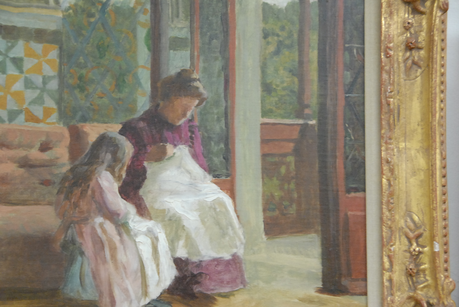 Oil on canvas of a woman and child stitching, in the manner of Albert Andre, signed indistinctly lower left.