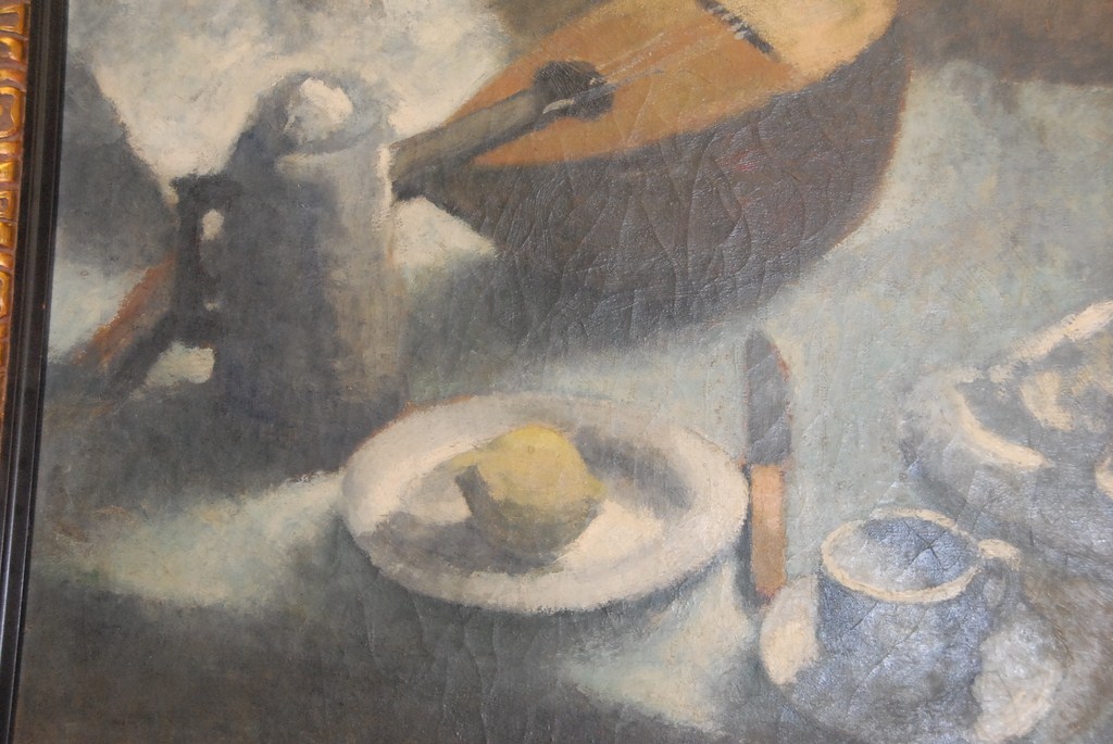 Oil on canvas still life with mandolin late 19th – early 20th century, unsigned, 21 x 27.