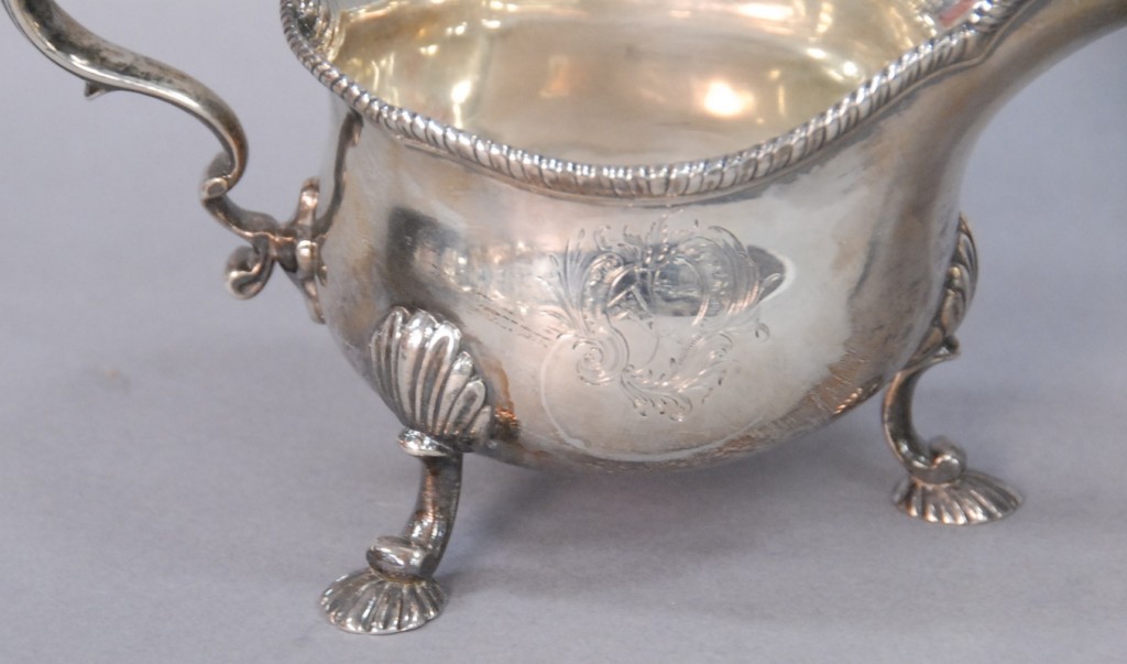 Pair of George II silver sauce boats Dan Piers London 1748 with scroll handles, gadrooned tops, and scallop shell feet, engraved family crest. height 4 1/2in. 28.6 troy oz.
