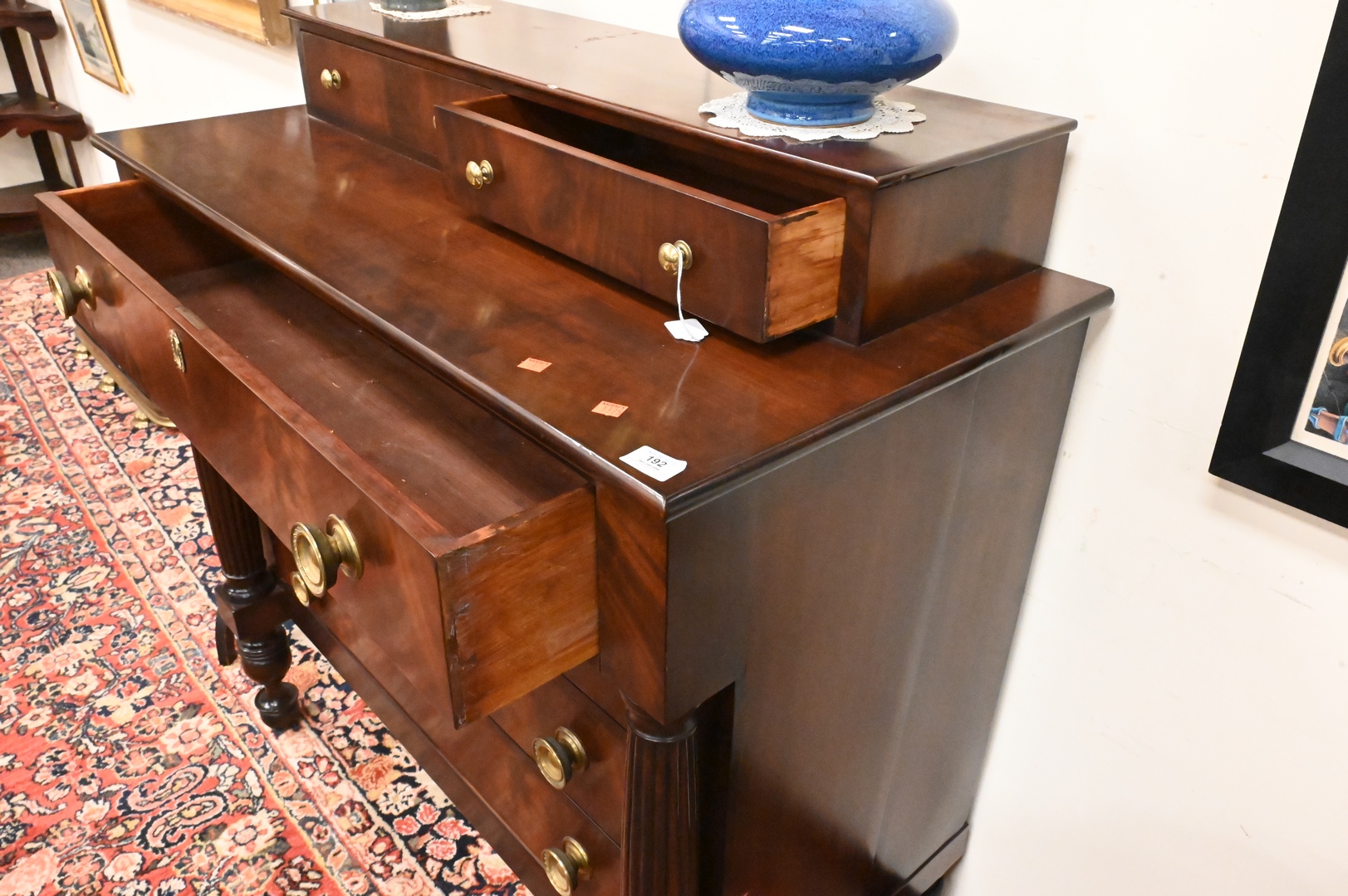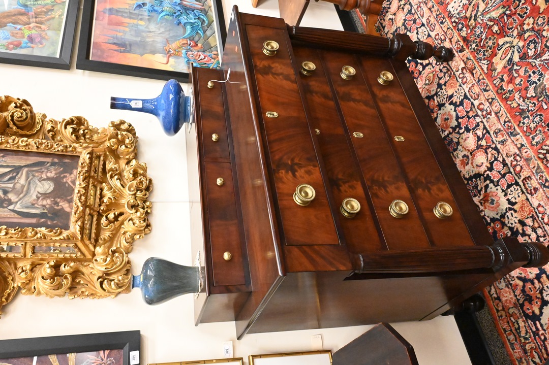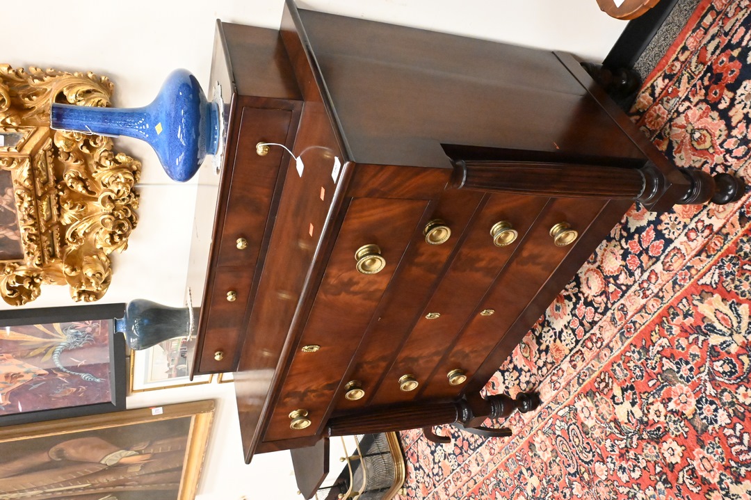 Sheraton Cherry and Mahogany Chest, having fluted columns, height 46 inches, top 21 1/2″ x 43 1/2″, Provenance: Estate of Cyril H. Moore Jr, Kent, Connecticut.